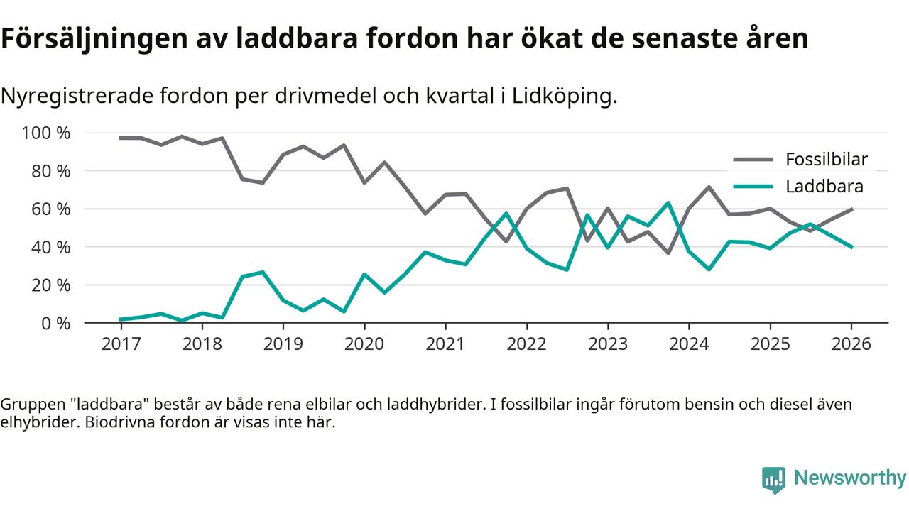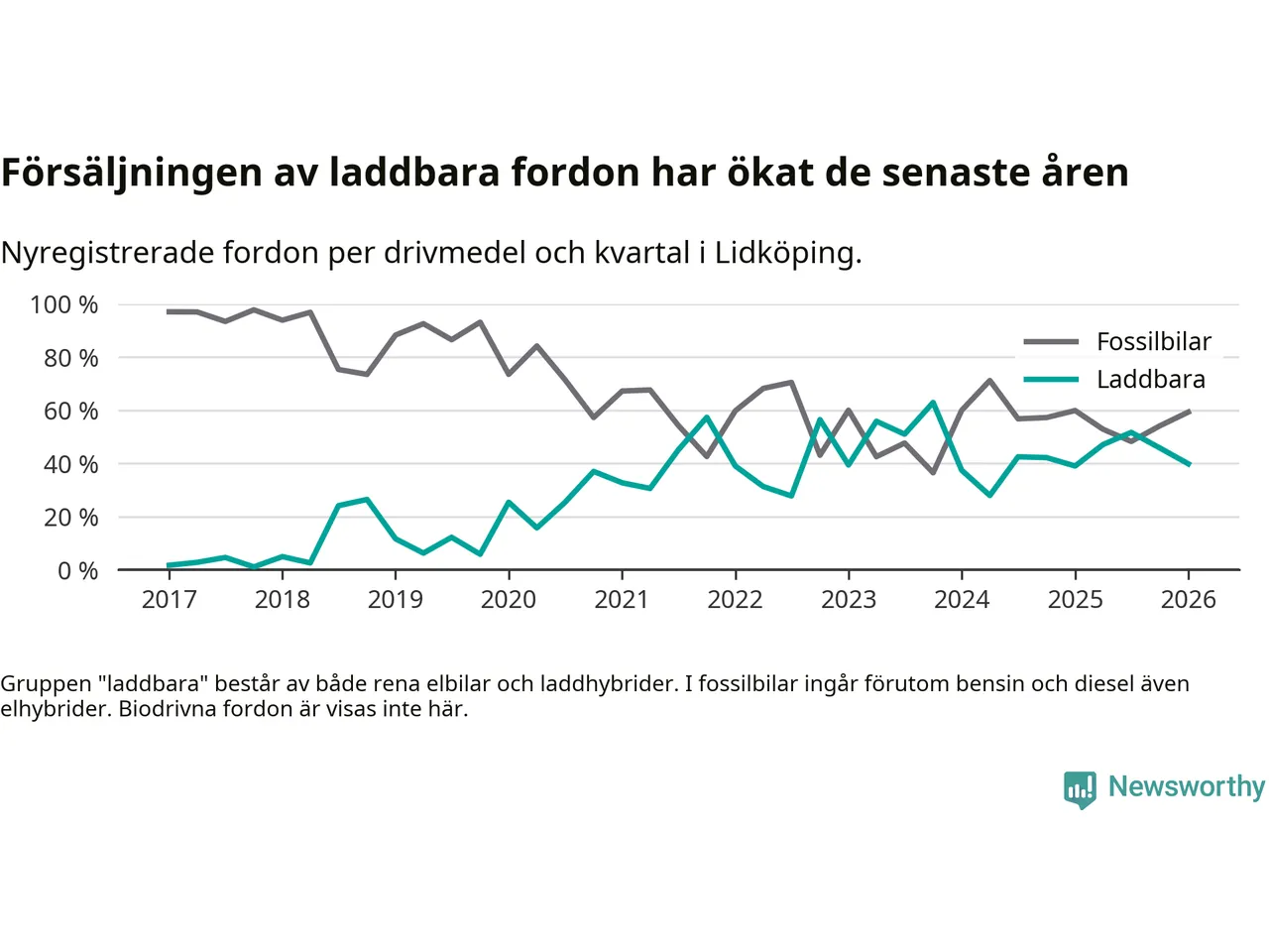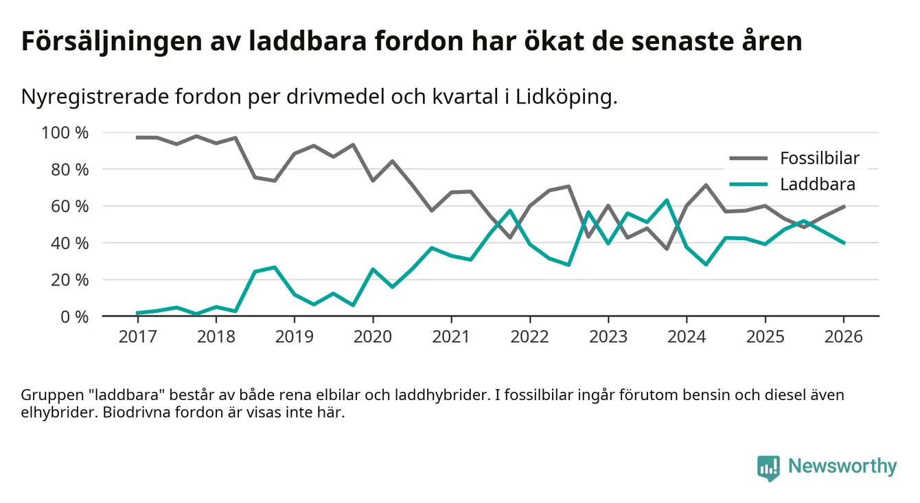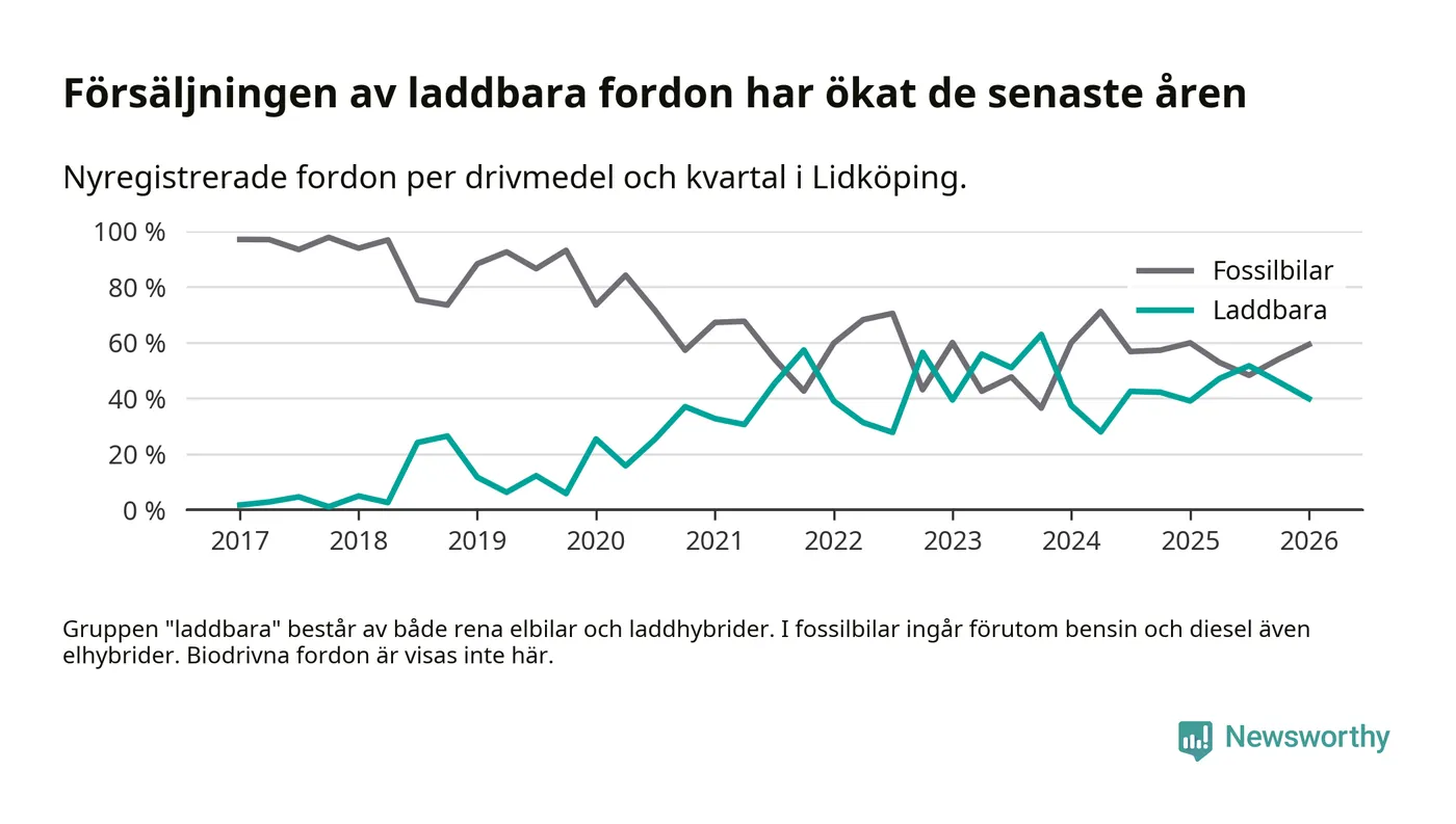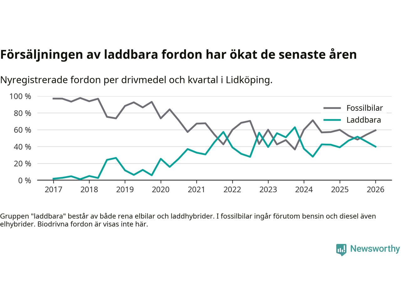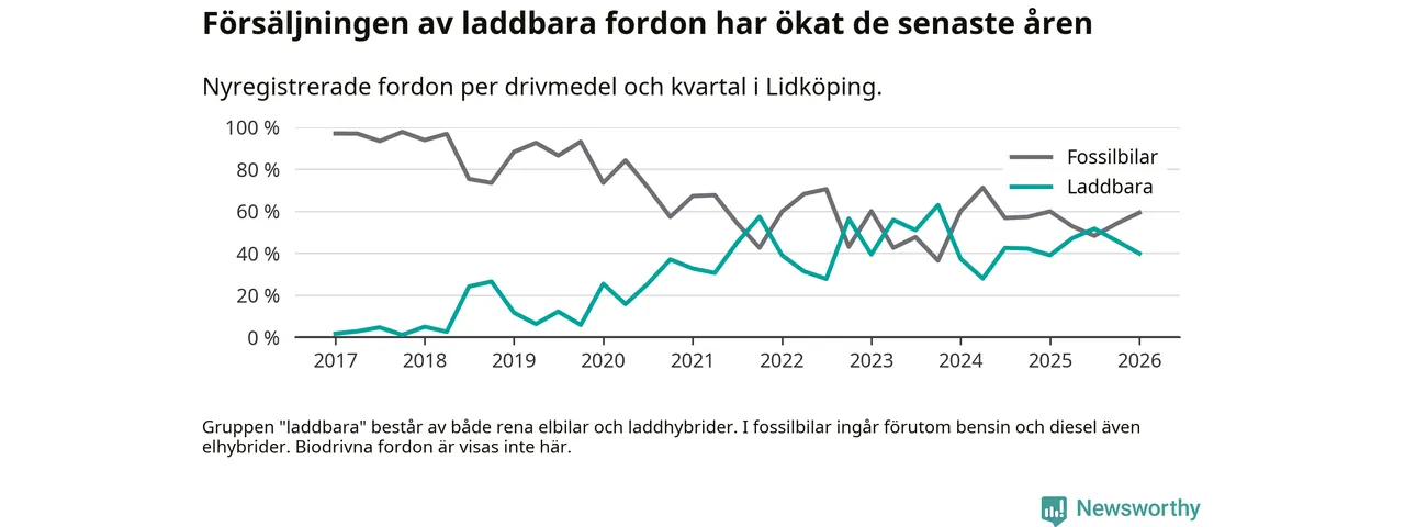 Under första kvartalet 2026 var 40 procent av alla nyregistrerade personbilar i Lidköping laddbara (sammanlagt registrerades 519 nya bilar). Merparten av de laddbara bilarna var rena elbilar (20 procent av alla).