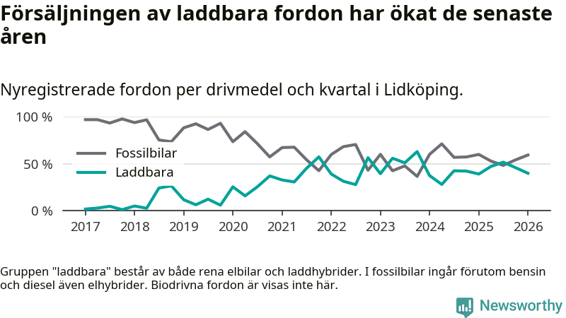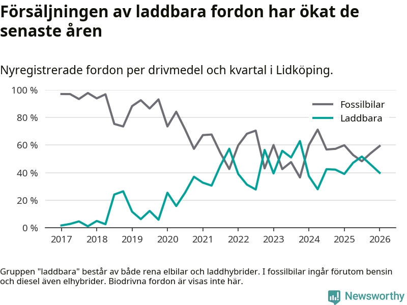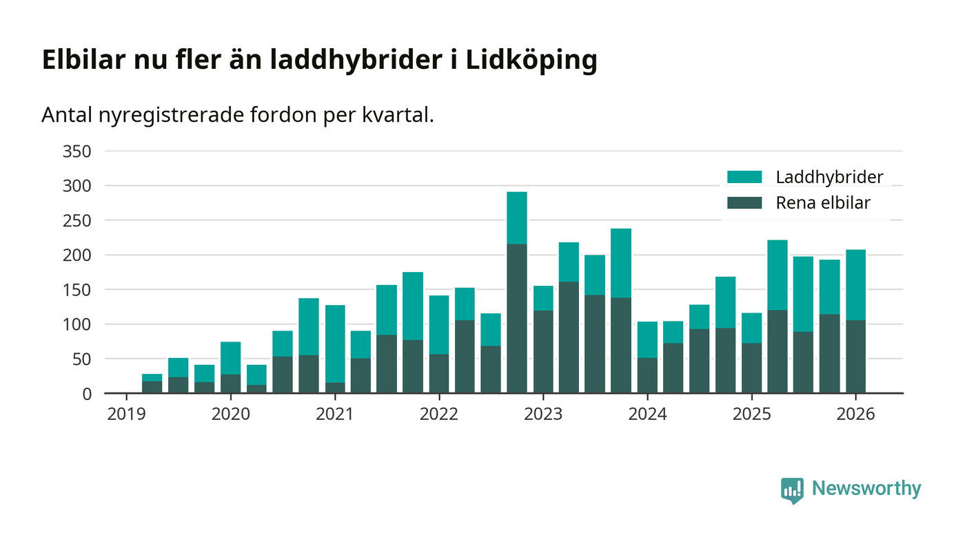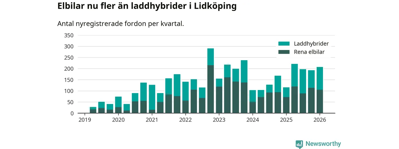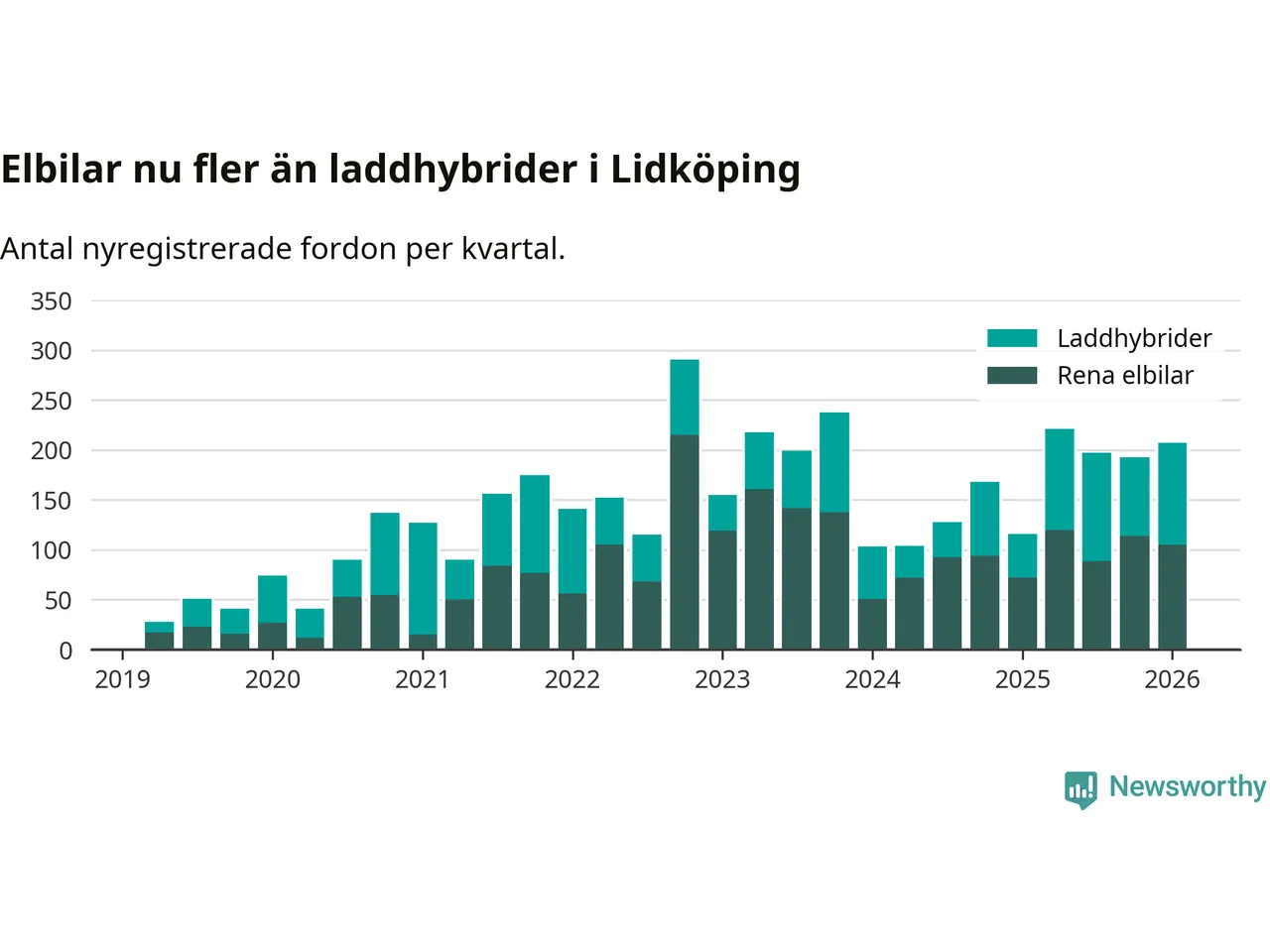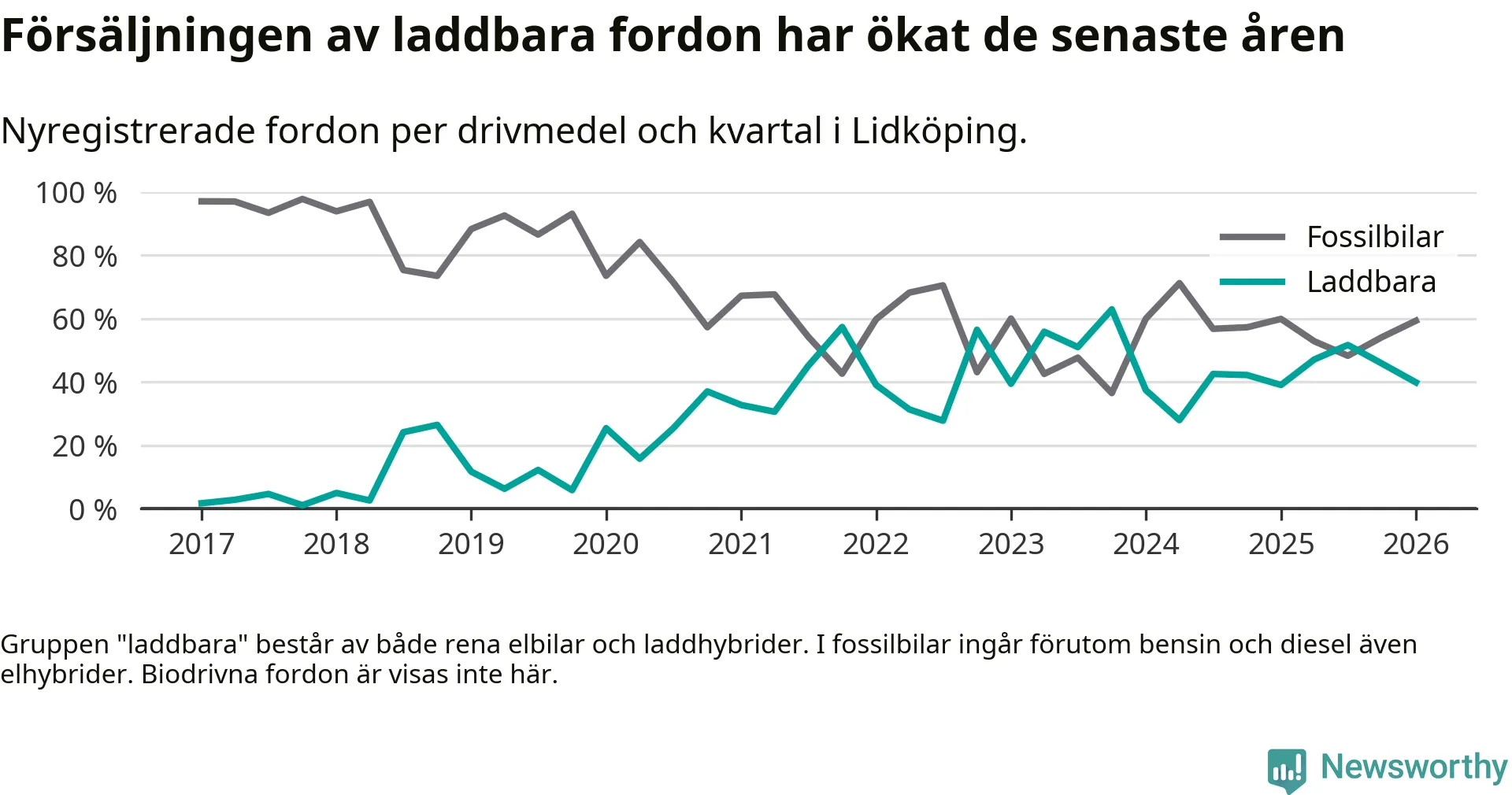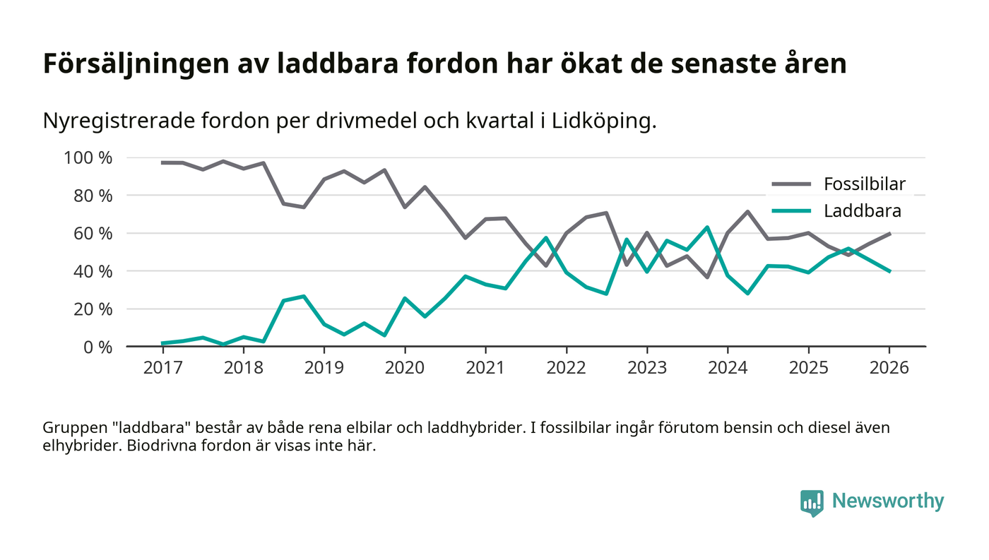 Under första kvartalet 2026 var 40 procent av alla nyregistrerade personbilar i Lidköping laddbara (sammanlagt registrerades 519 nya bilar). Merparten av de laddbara bilarna var rena elbilar (20 procent av alla).