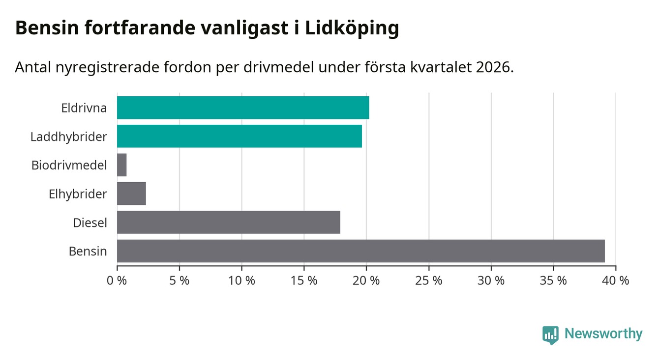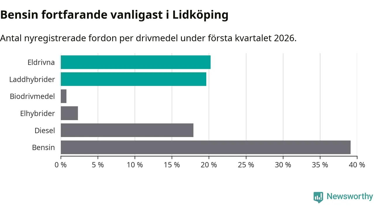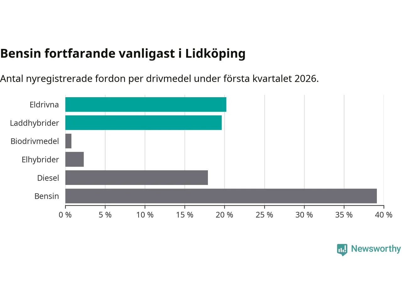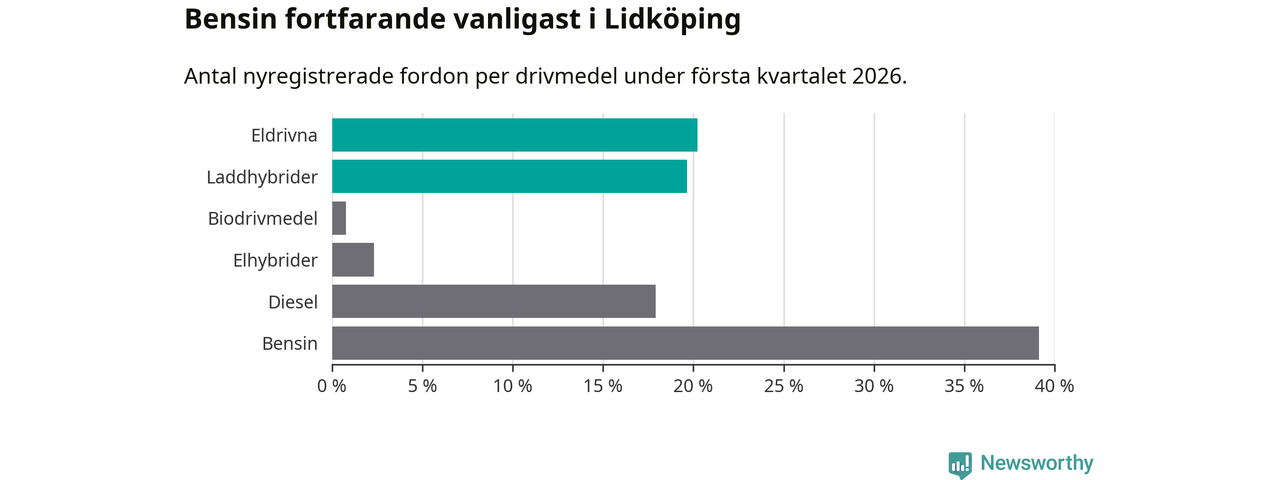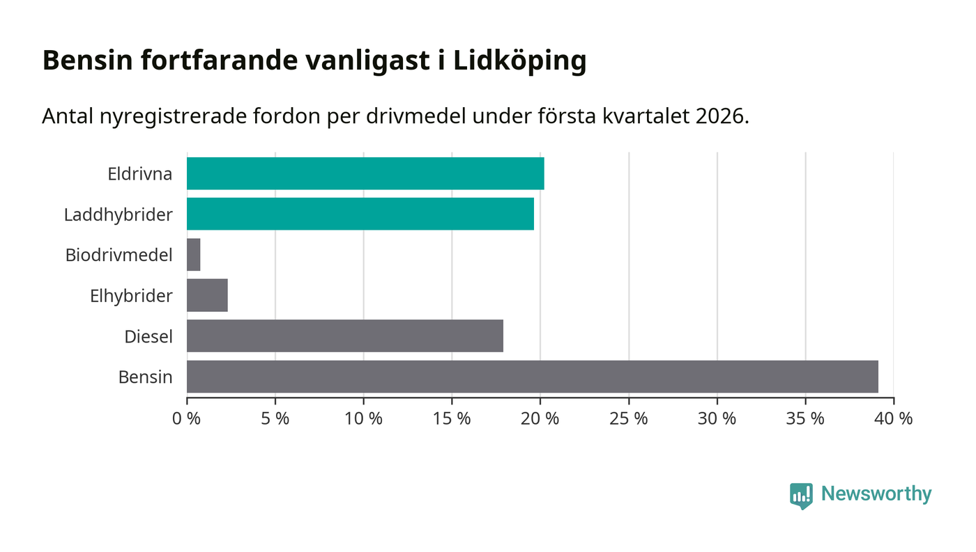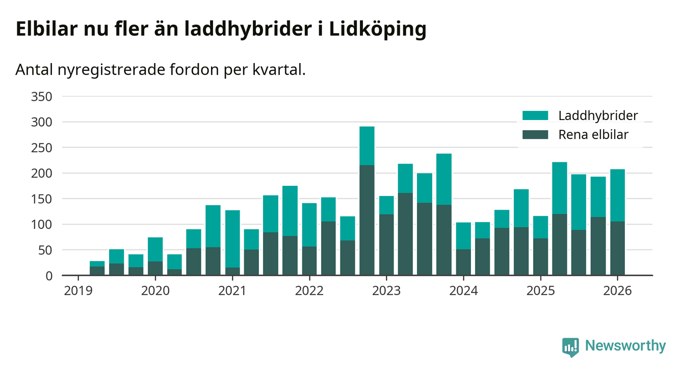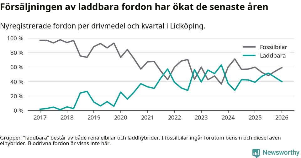 Under första kvartalet 2026 var 40 procent av alla nyregistrerade personbilar i Lidköping laddbara (sammanlagt registrerades 519 nya bilar). Merparten av de laddbara bilarna var rena elbilar (20 procent av alla).
