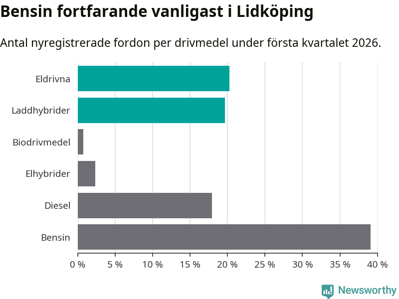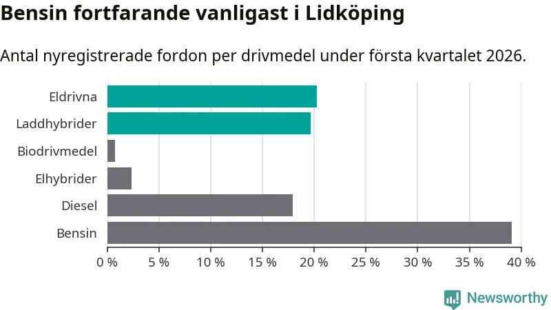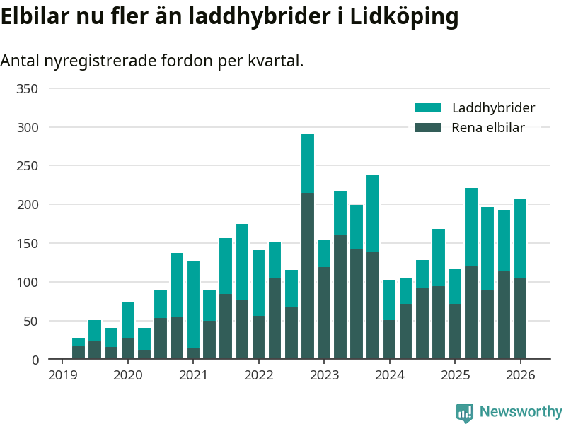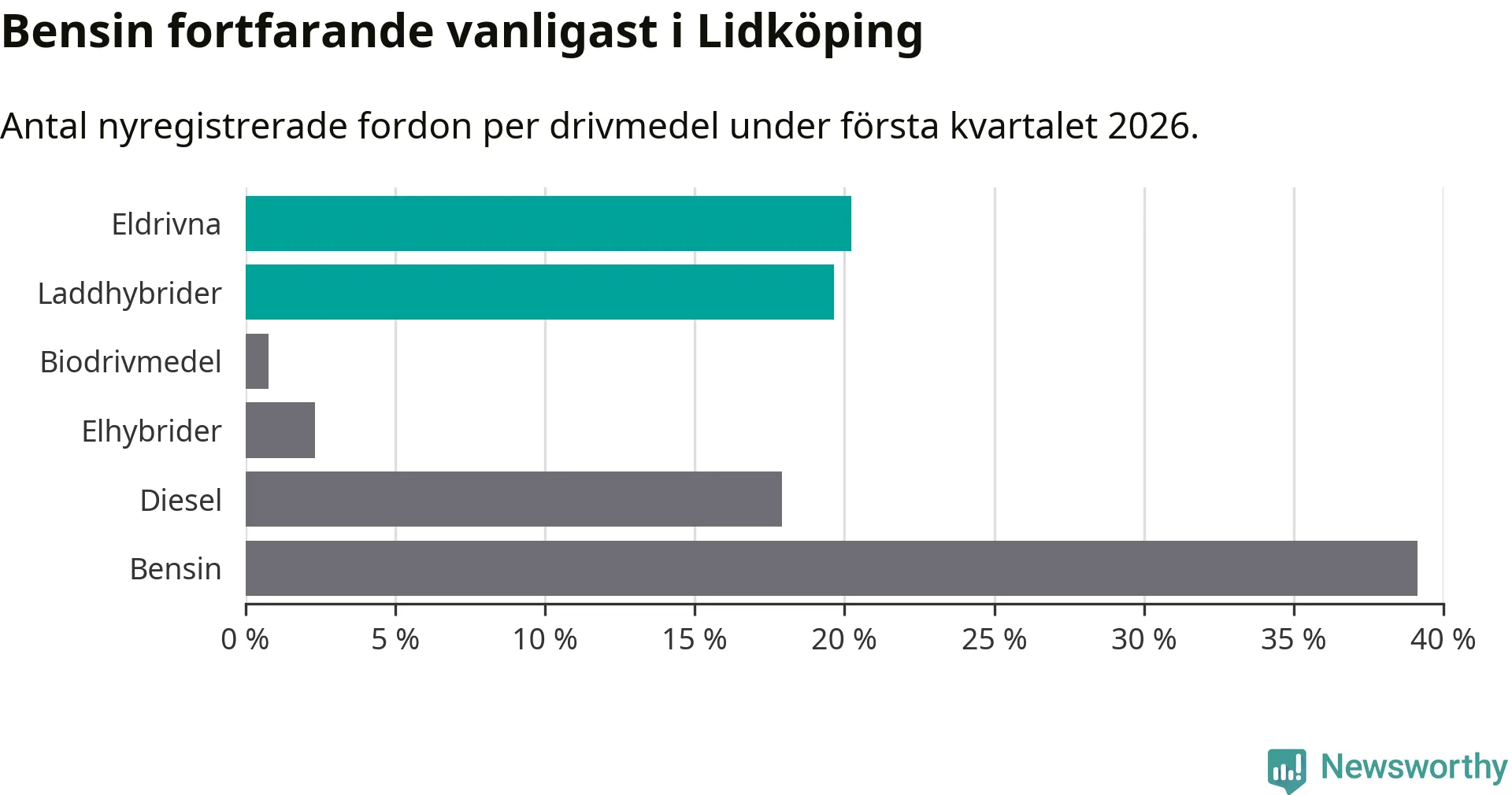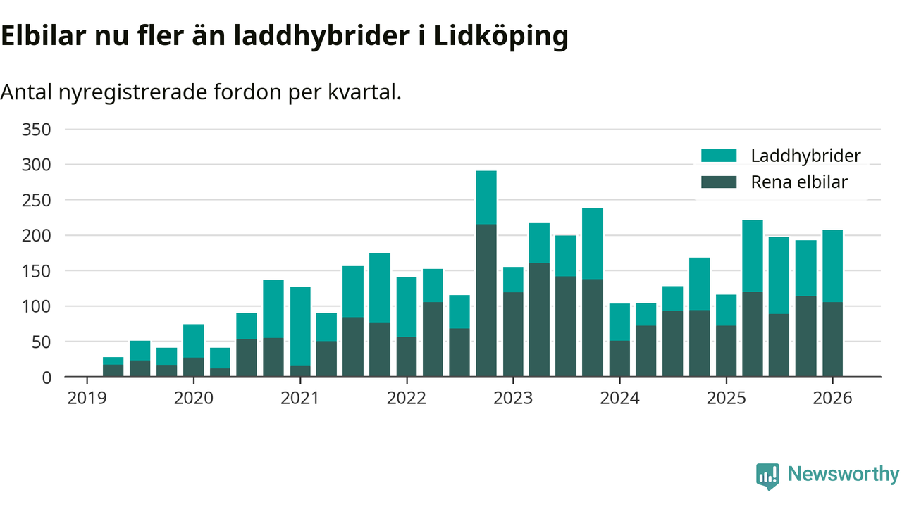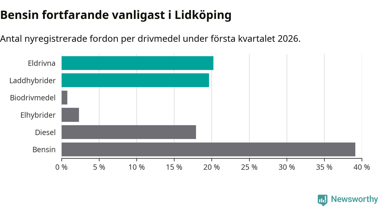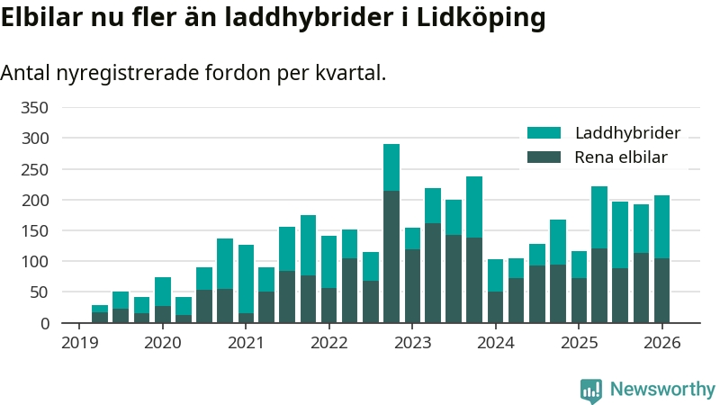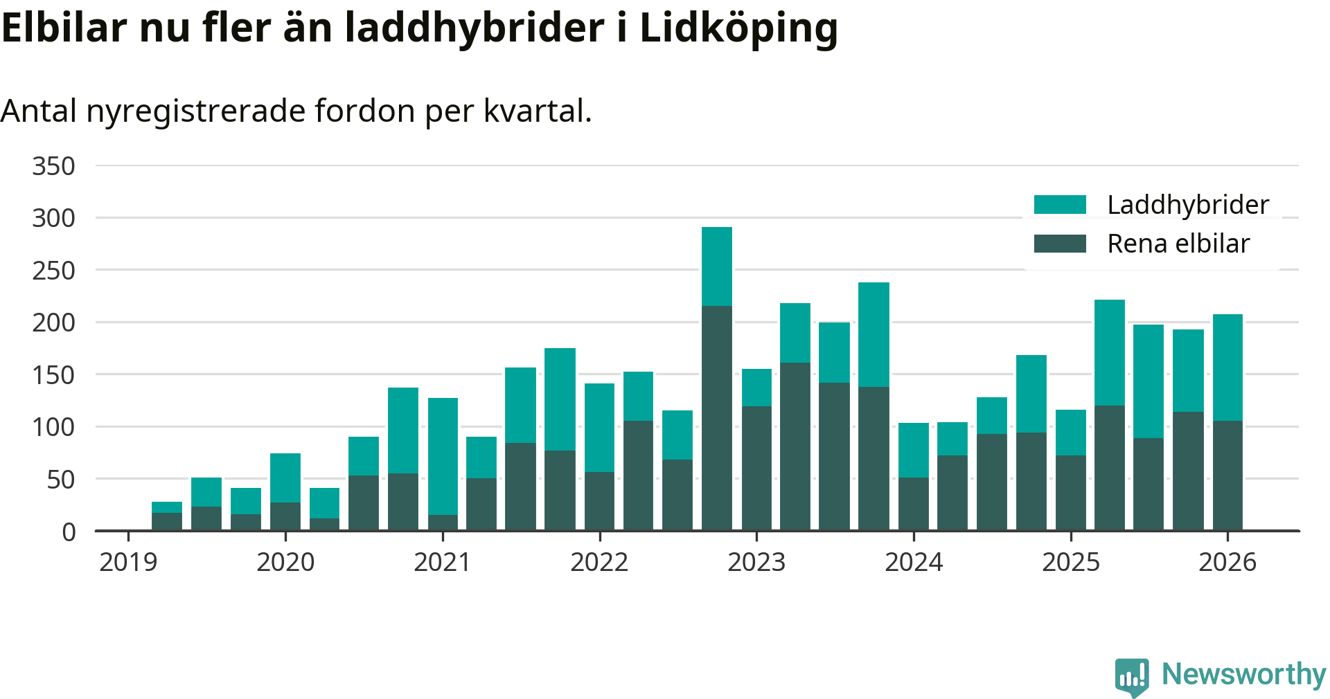 Under första kvartalet 2026 var 40 procent av alla nyregistrerade personbilar i Lidköping laddbara (sammanlagt registrerades 519 nya bilar). Merparten av de laddbara bilarna var rena elbilar (20 procent av alla).