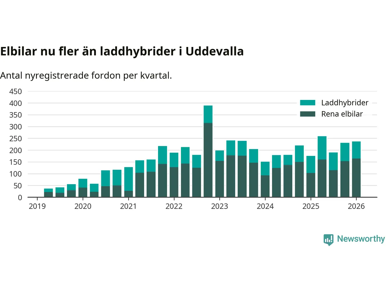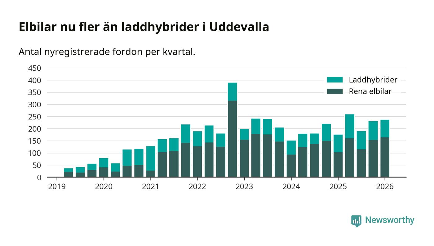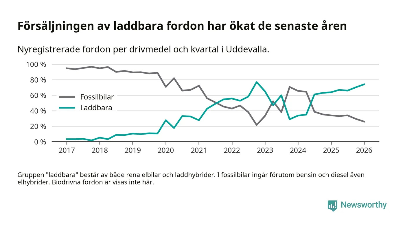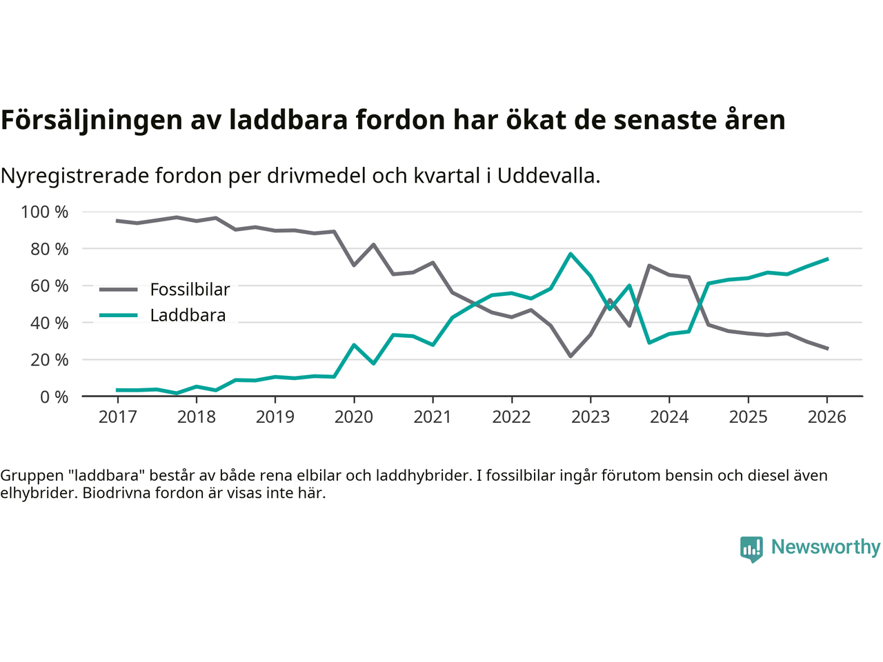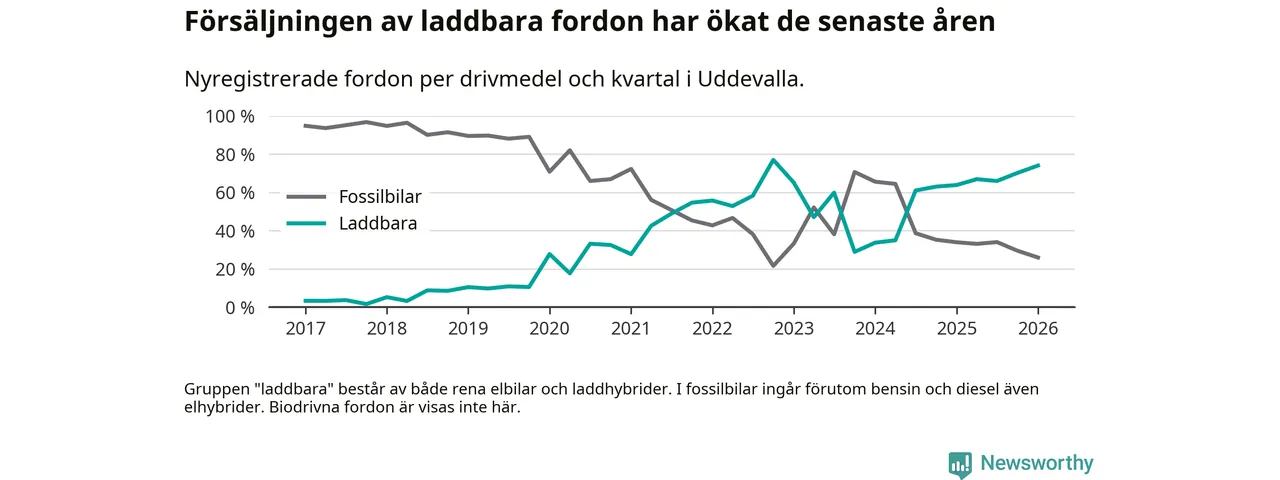 Under första kvartalet 2026 var 74 procent av alla nyregistrerade personbilar i Uddevalla laddbara (sammanlagt registrerades 320 nya bilar). Merparten av de laddbara bilarna var rena elbilar (51 procent av alla).