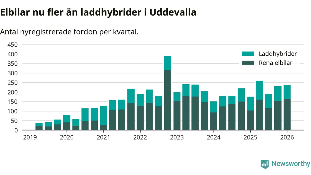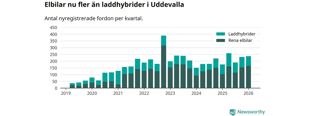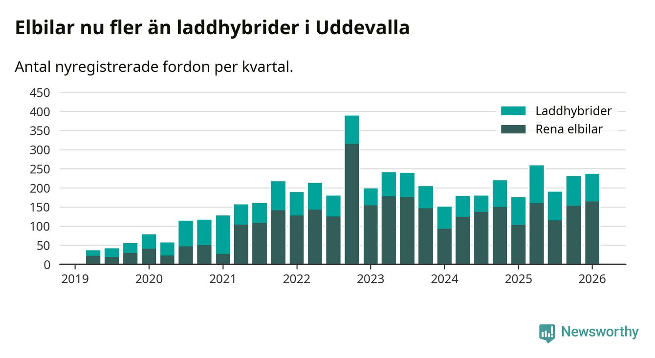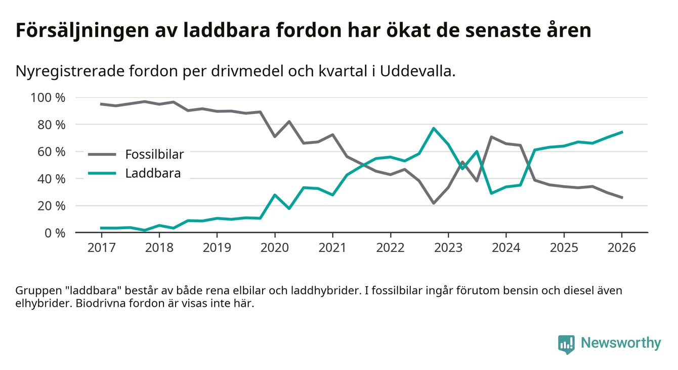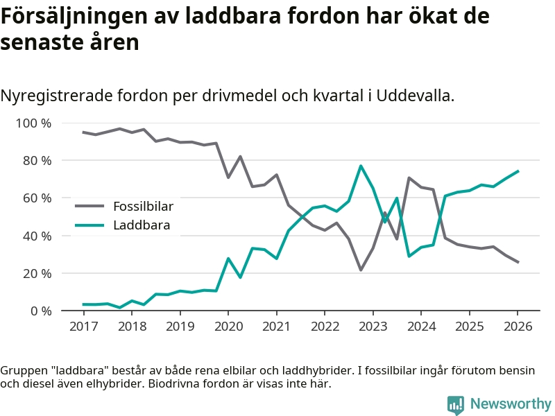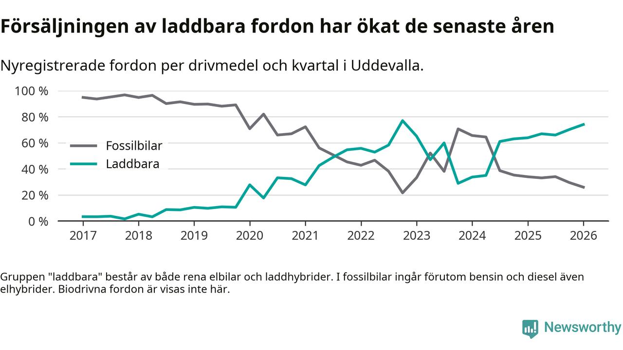 Under första kvartalet 2026 var 74 procent av alla nyregistrerade personbilar i Uddevalla laddbara (sammanlagt registrerades 320 nya bilar). Merparten av de laddbara bilarna var rena elbilar (51 procent av alla).