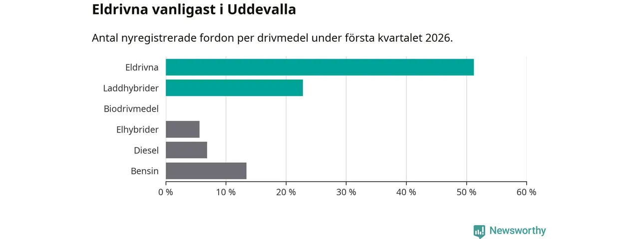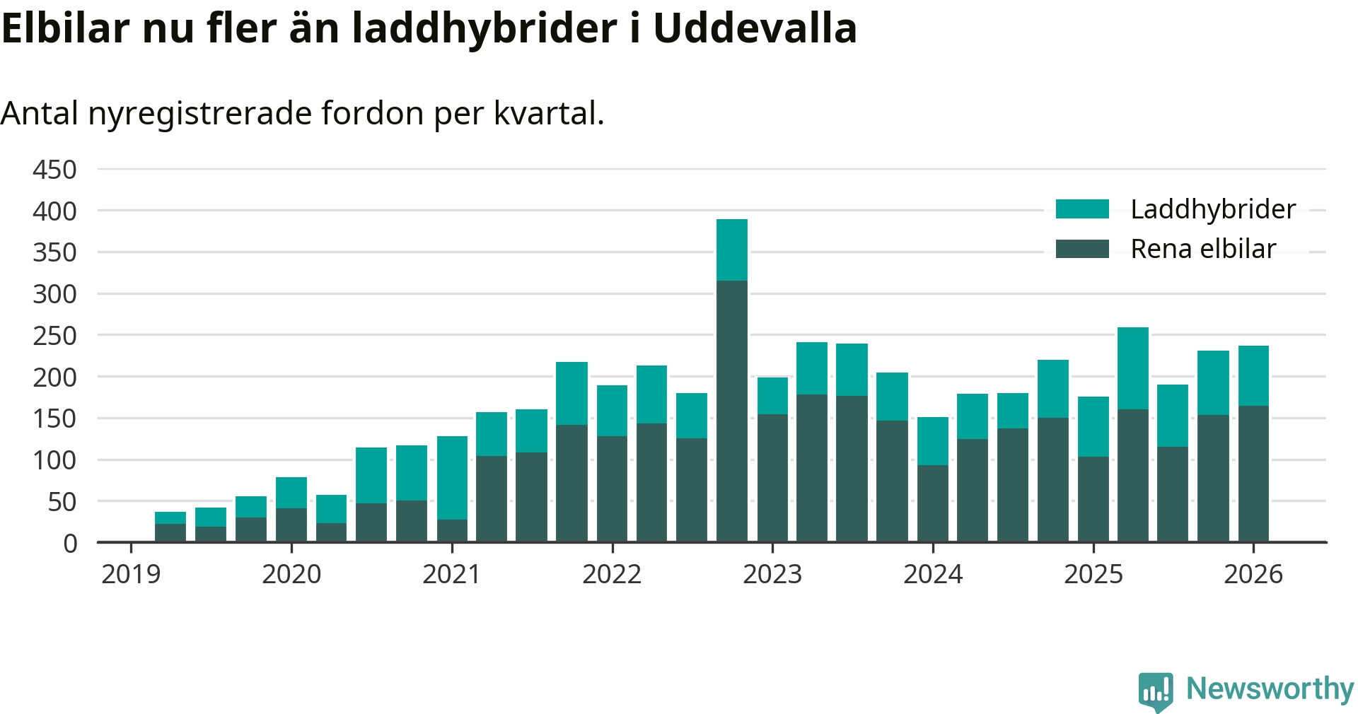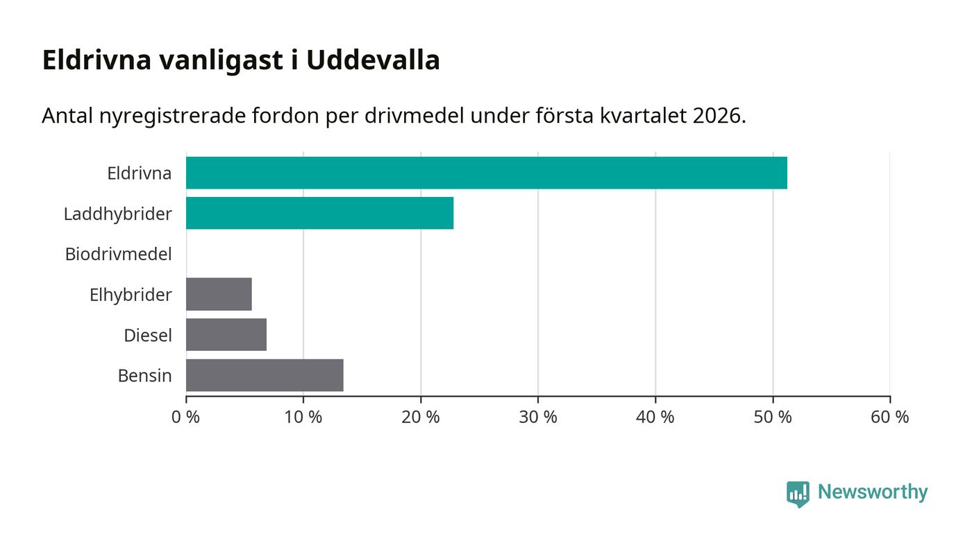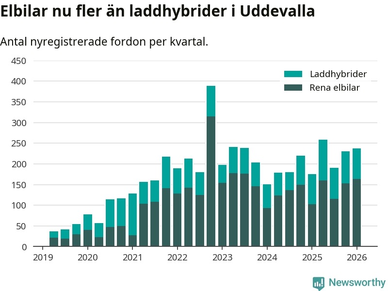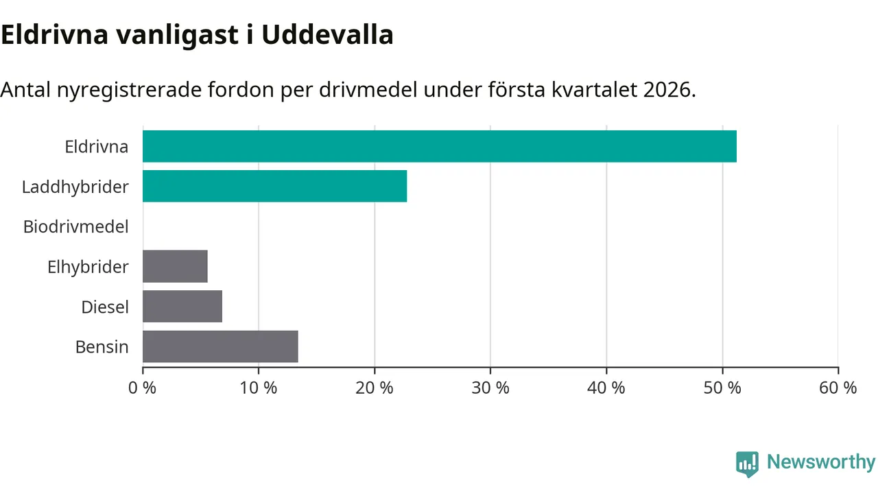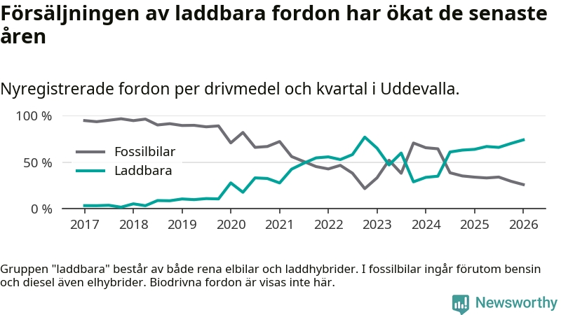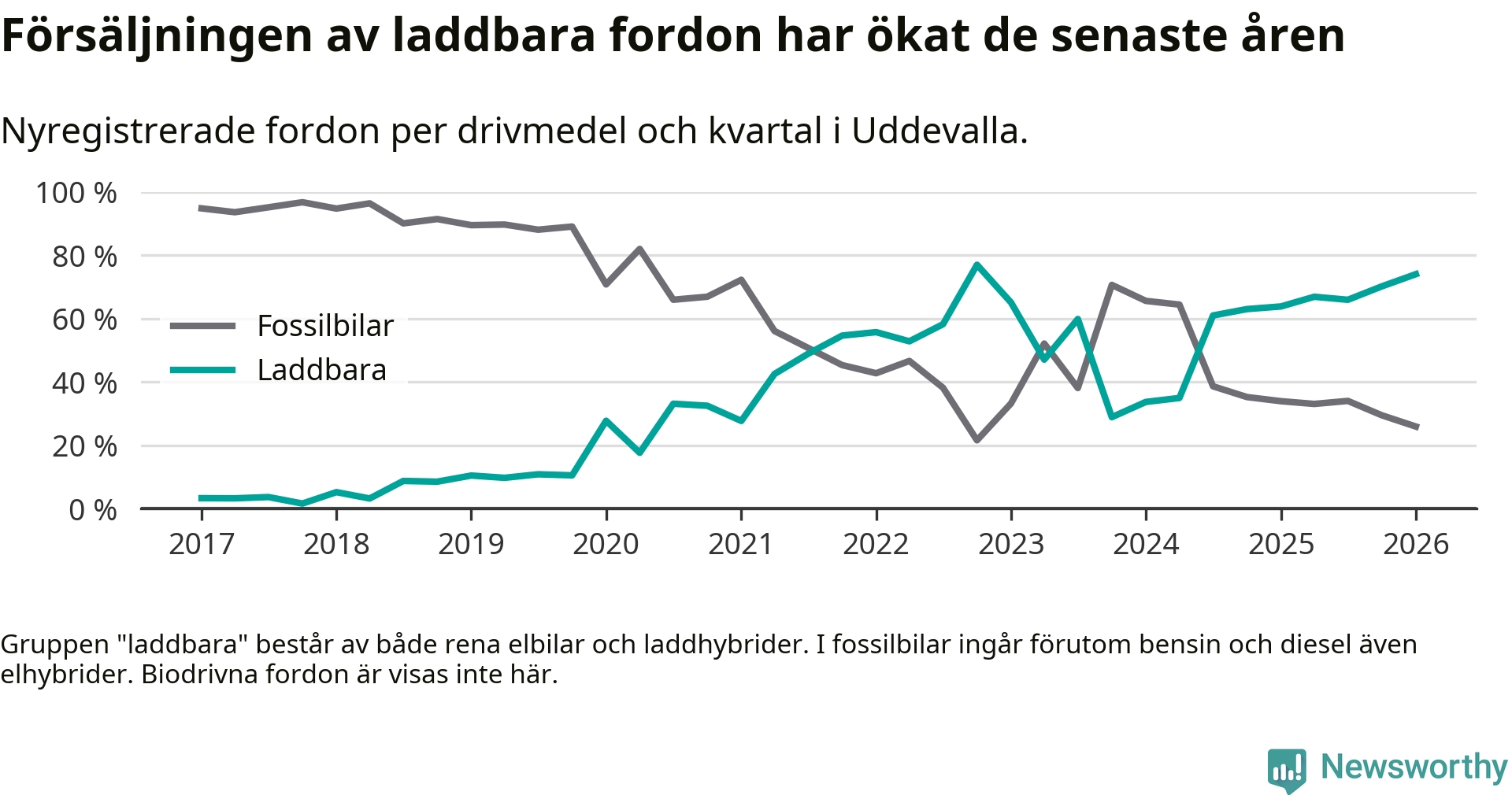 Under första kvartalet 2026 var 74 procent av alla nyregistrerade personbilar i Uddevalla laddbara (sammanlagt registrerades 320 nya bilar). Merparten av de laddbara bilarna var rena elbilar (51 procent av alla).