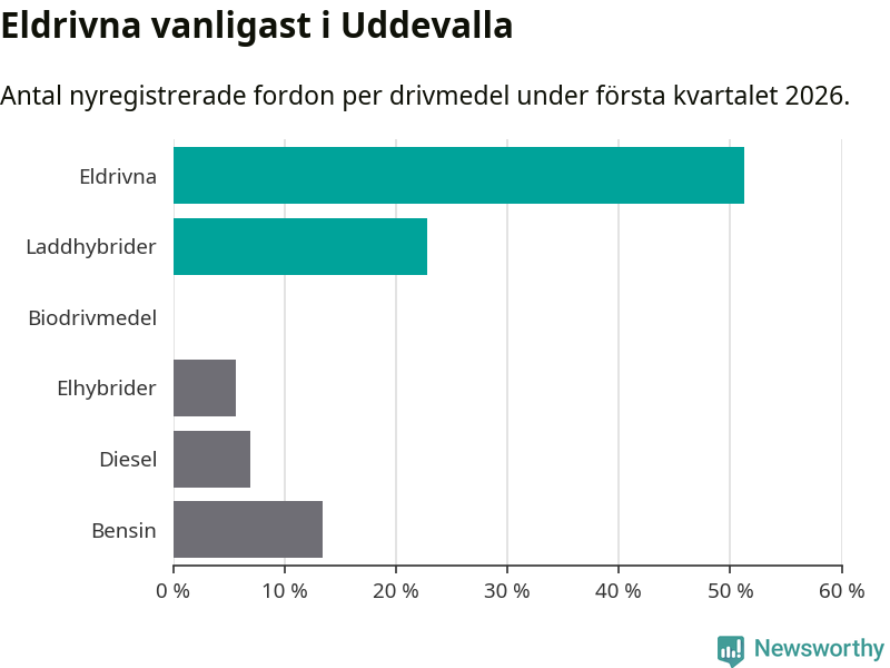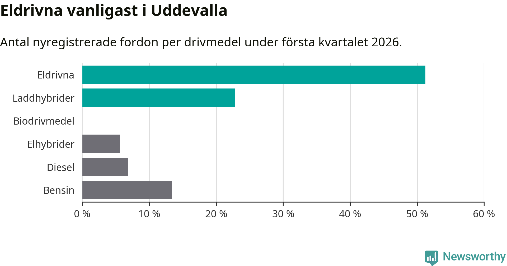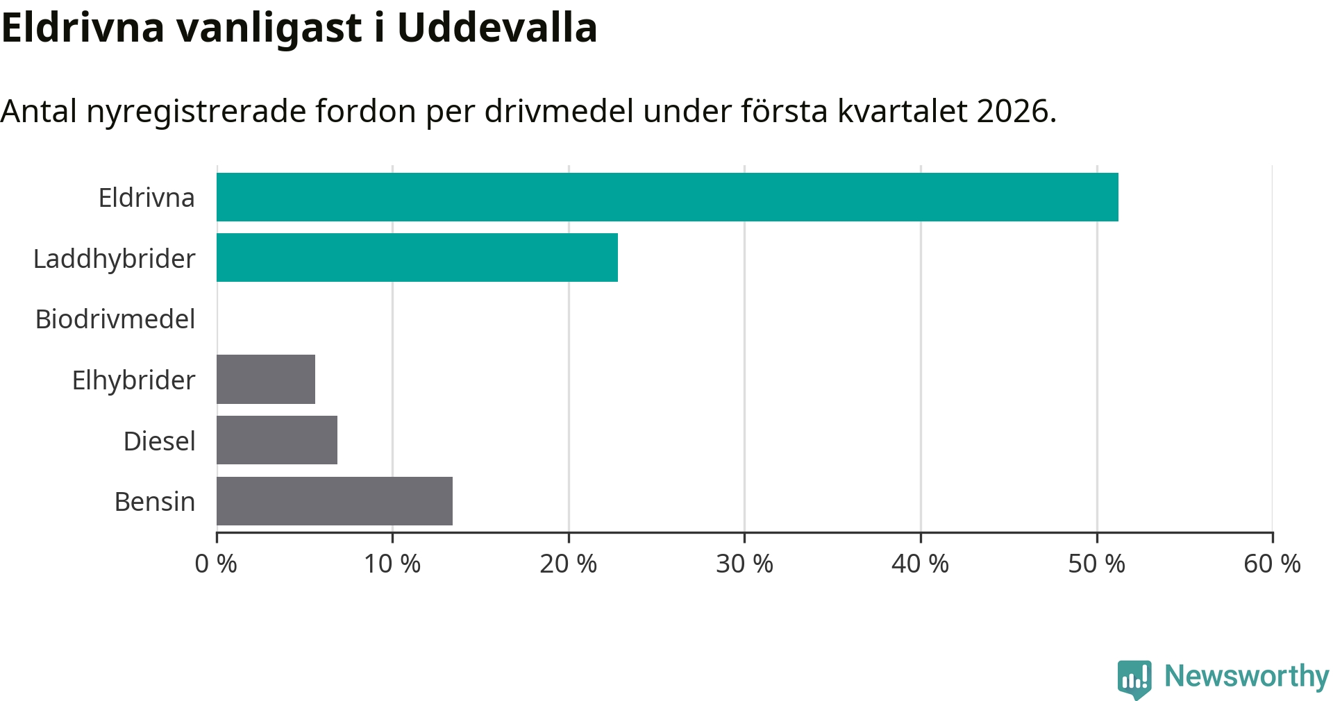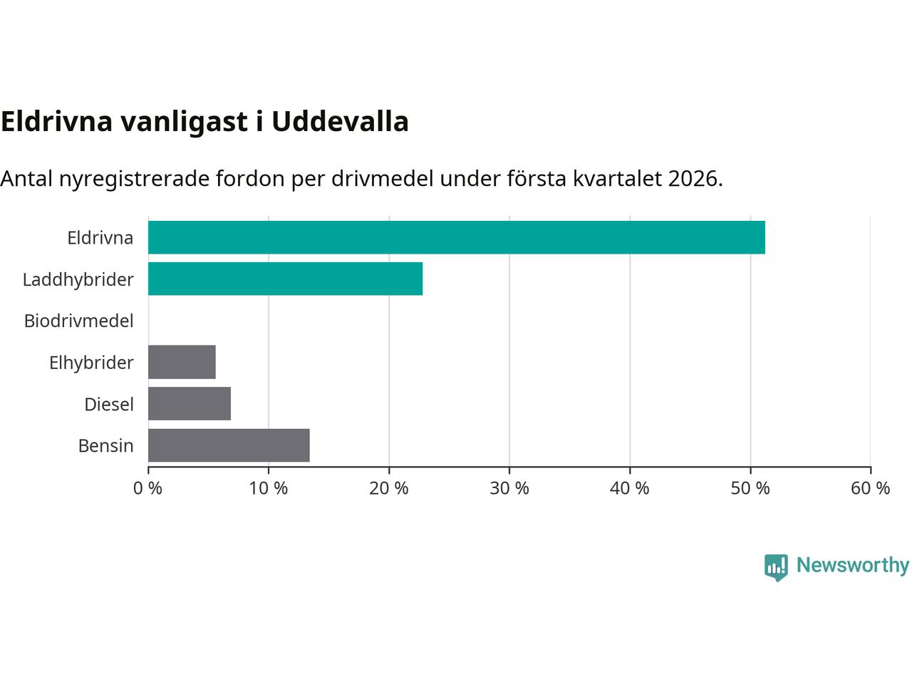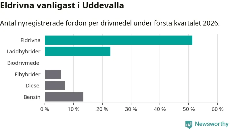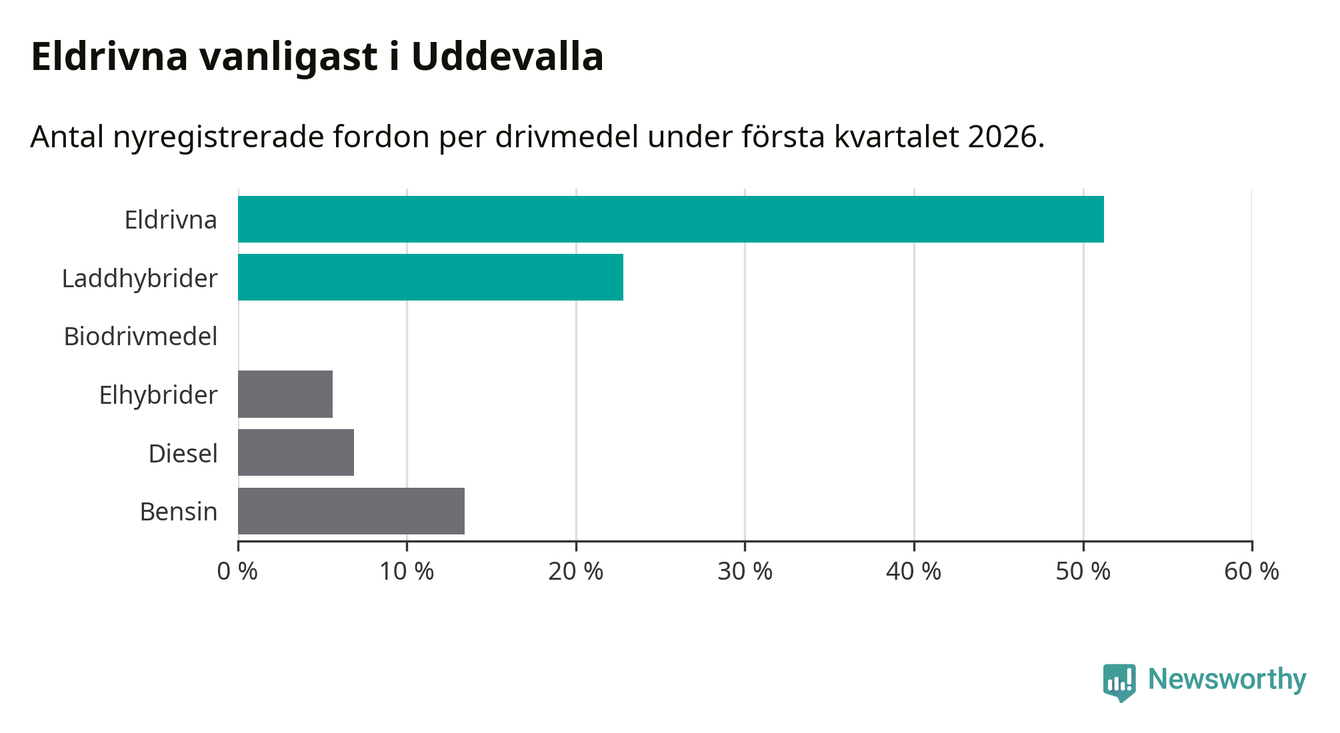 Under första kvartalet 2026 var 74 procent av alla nyregistrerade personbilar i Uddevalla laddbara (sammanlagt registrerades 320 nya bilar). Merparten av de laddbara bilarna var rena elbilar (51 procent av alla).