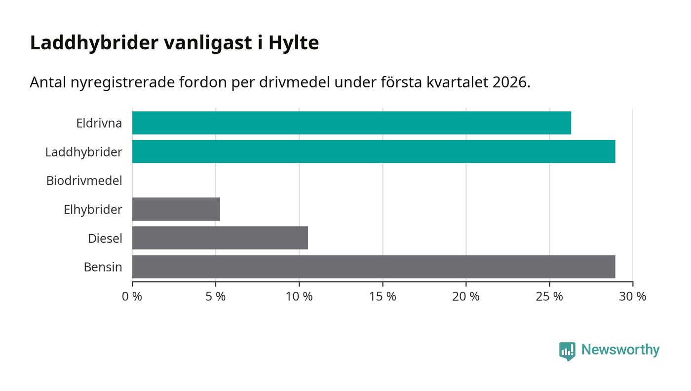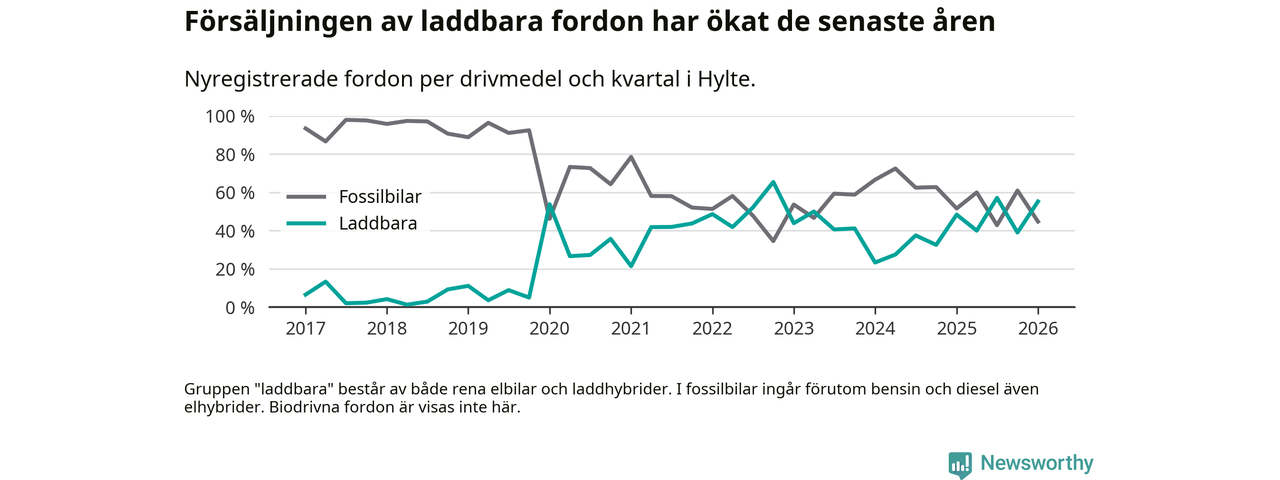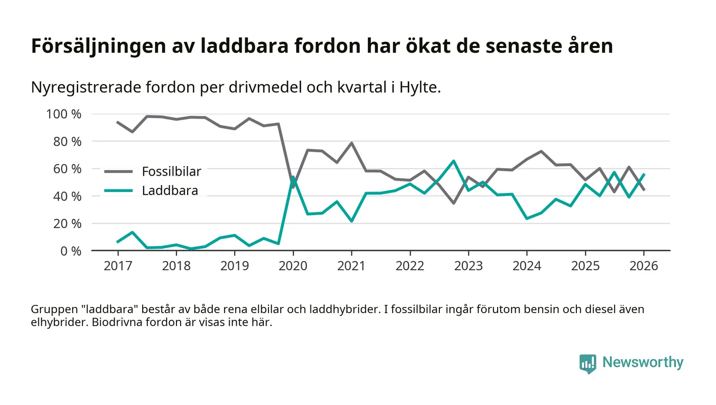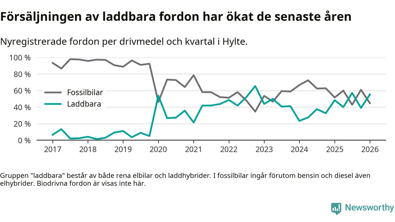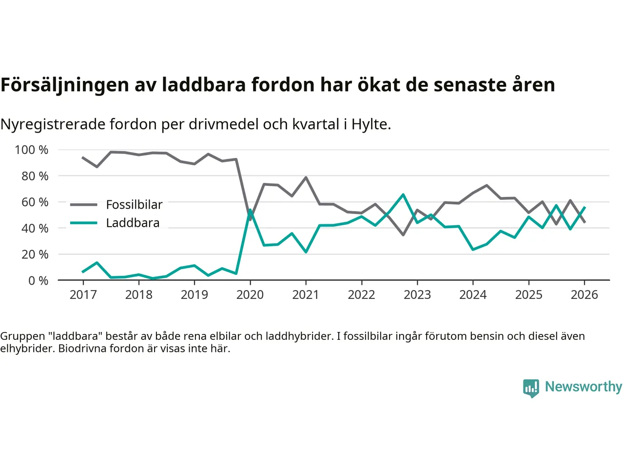 Under första kvartalet 2026 var 55 procent av alla nyregistrerade personbilar i Hylte laddbara (sammanlagt registrerades 38 nya bilar). Merparten av de laddbara bilarna var så kallade laddhybrider, det vill säga fordon som går att ladda och köra på el, men som även har en förbränningsmotor. 26 procent av alla nya bilar var rena elbilar.