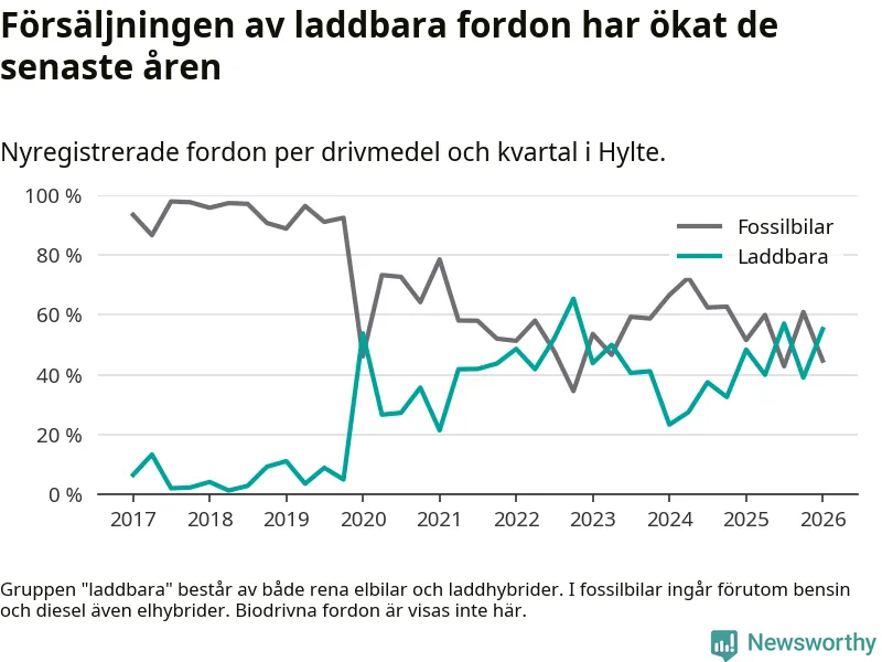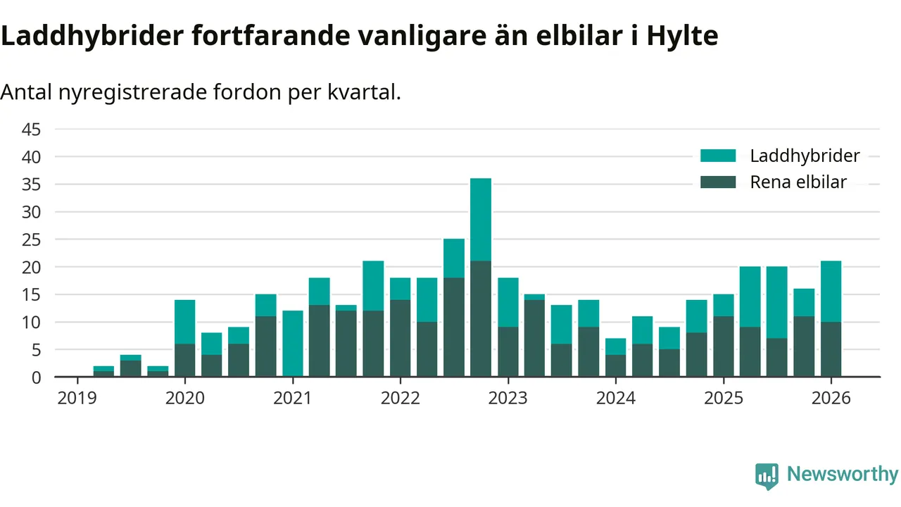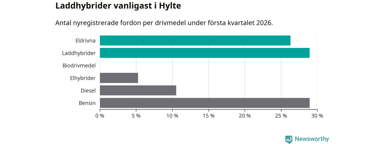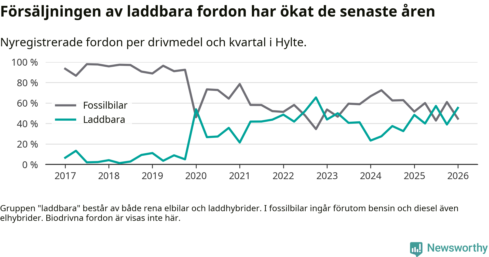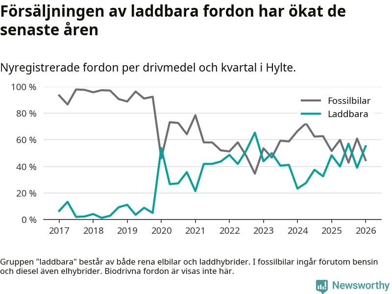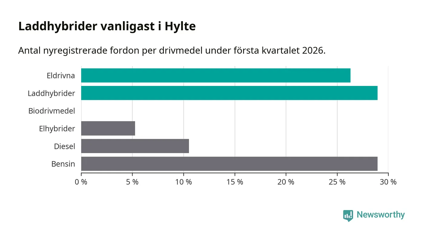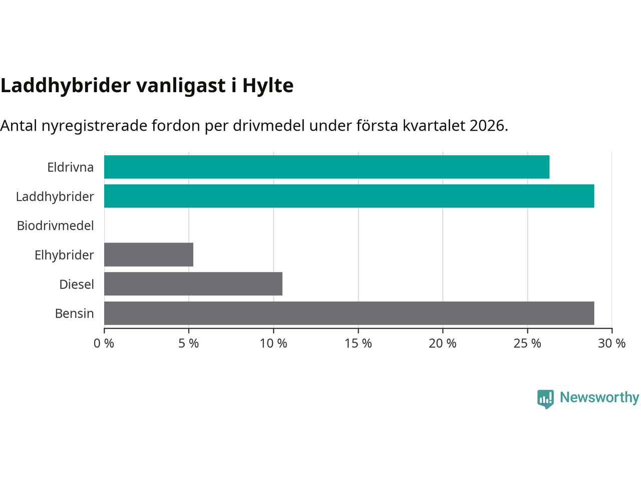 Under första kvartalet 2026 var 55 procent av alla nyregistrerade personbilar i Hylte laddbara (sammanlagt registrerades 38 nya bilar). Merparten av de laddbara bilarna var så kallade laddhybrider, det vill säga fordon som går att ladda och köra på el, men som även har en förbränningsmotor. 26 procent av alla nya bilar var rena elbilar.