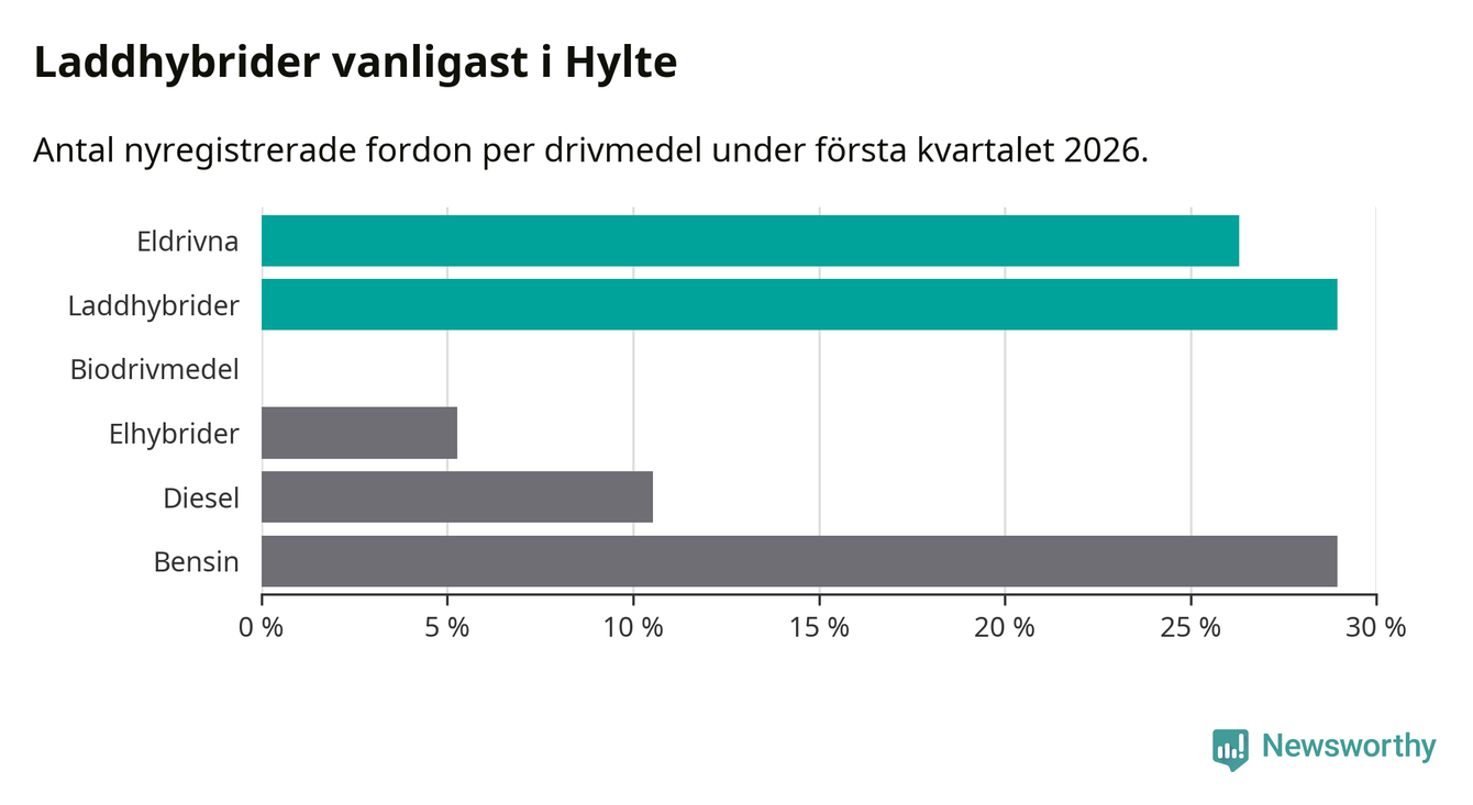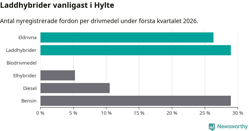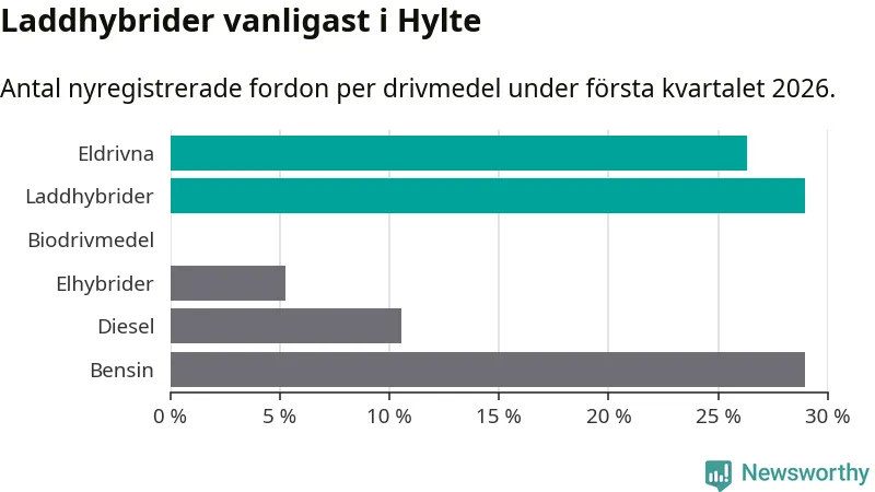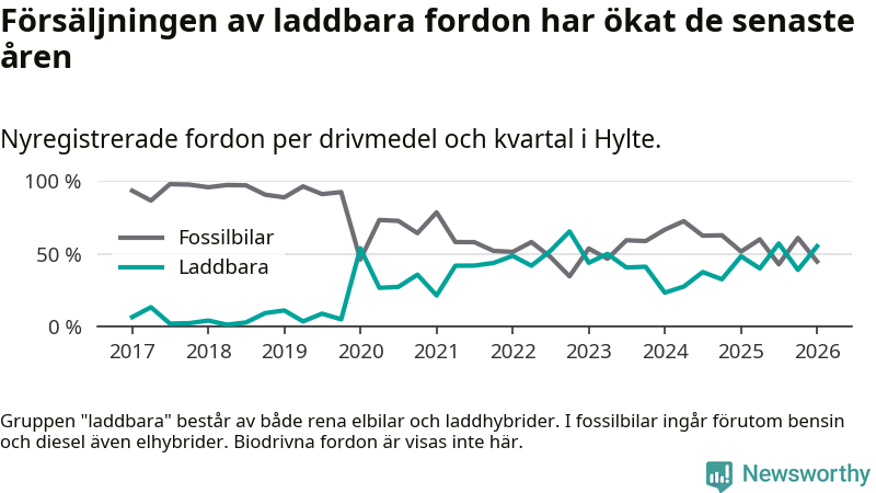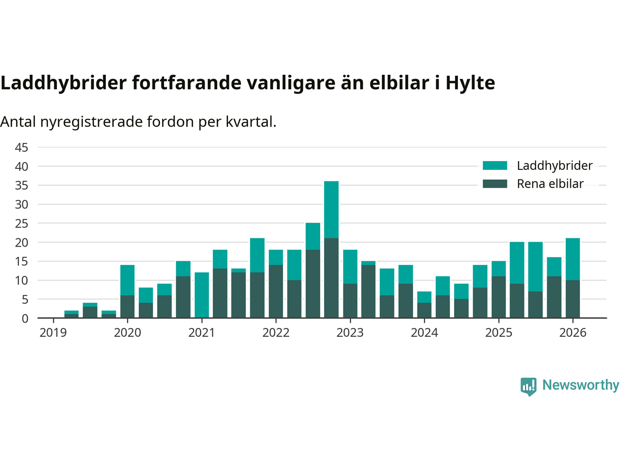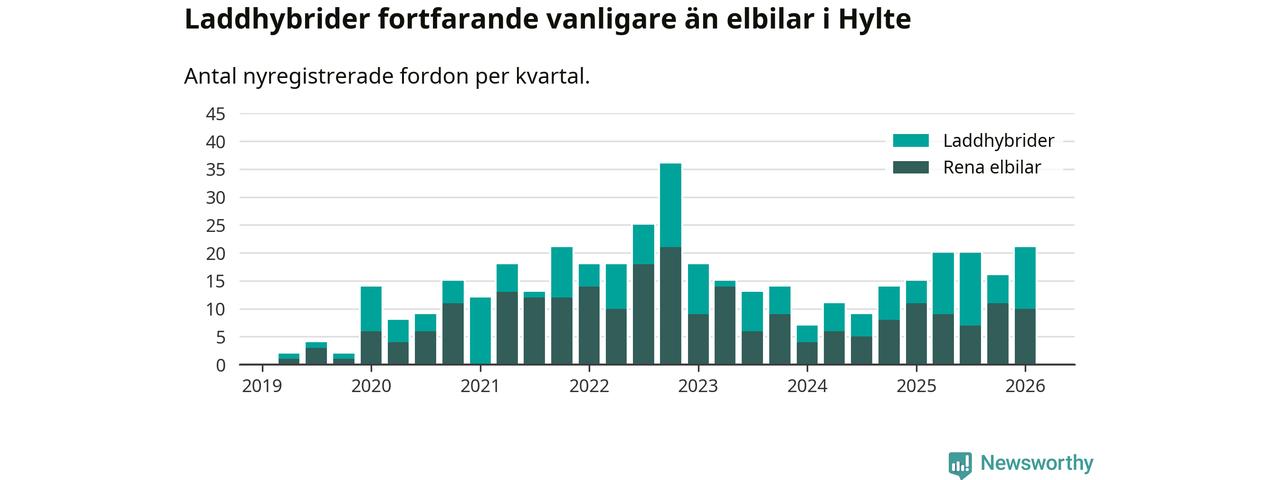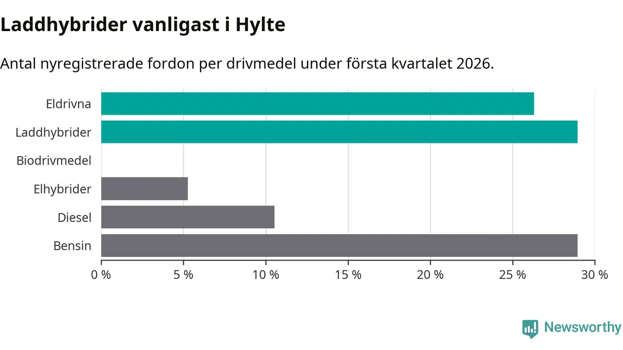 Under första kvartalet 2026 var 55 procent av alla nyregistrerade personbilar i Hylte laddbara (sammanlagt registrerades 38 nya bilar). Merparten av de laddbara bilarna var så kallade laddhybrider, det vill säga fordon som går att ladda och köra på el, men som även har en förbränningsmotor. 26 procent av alla nya bilar var rena elbilar.