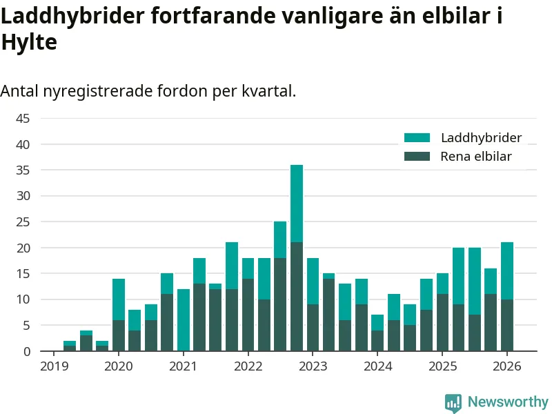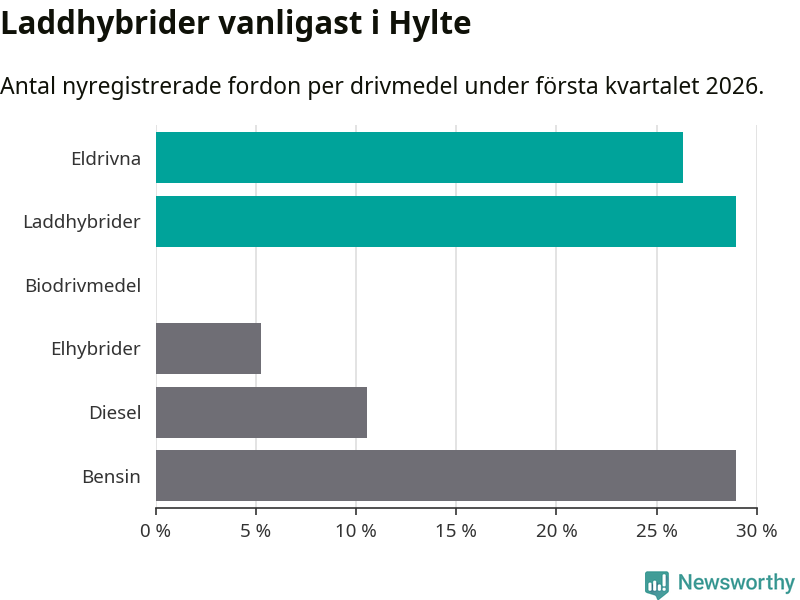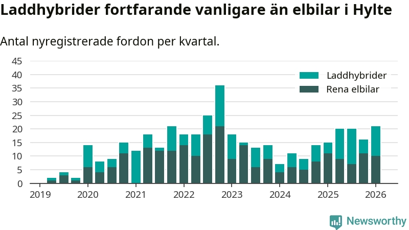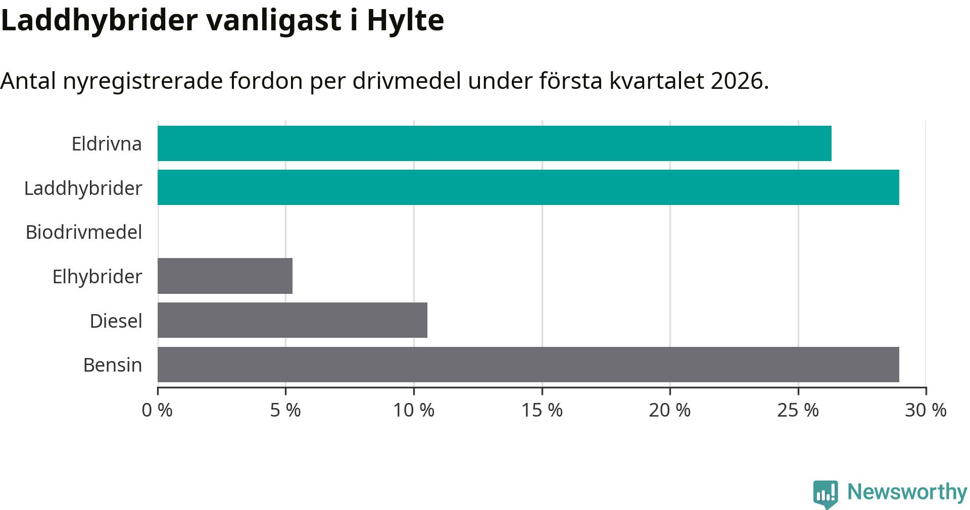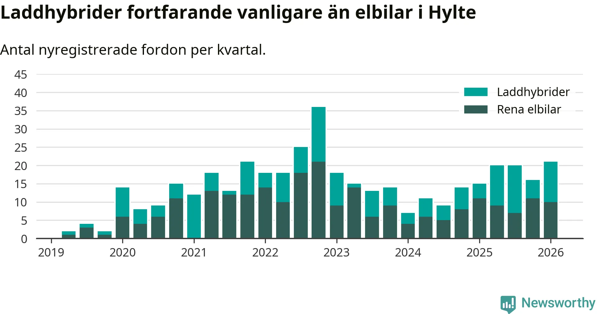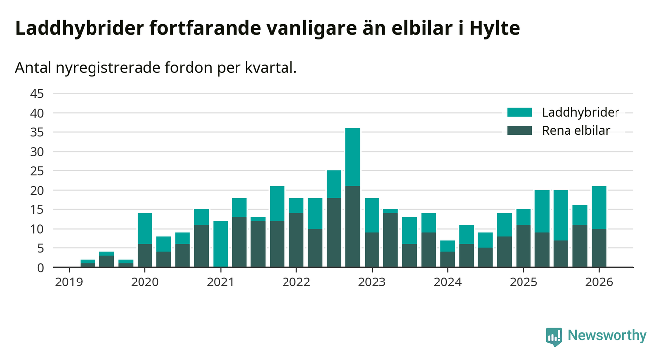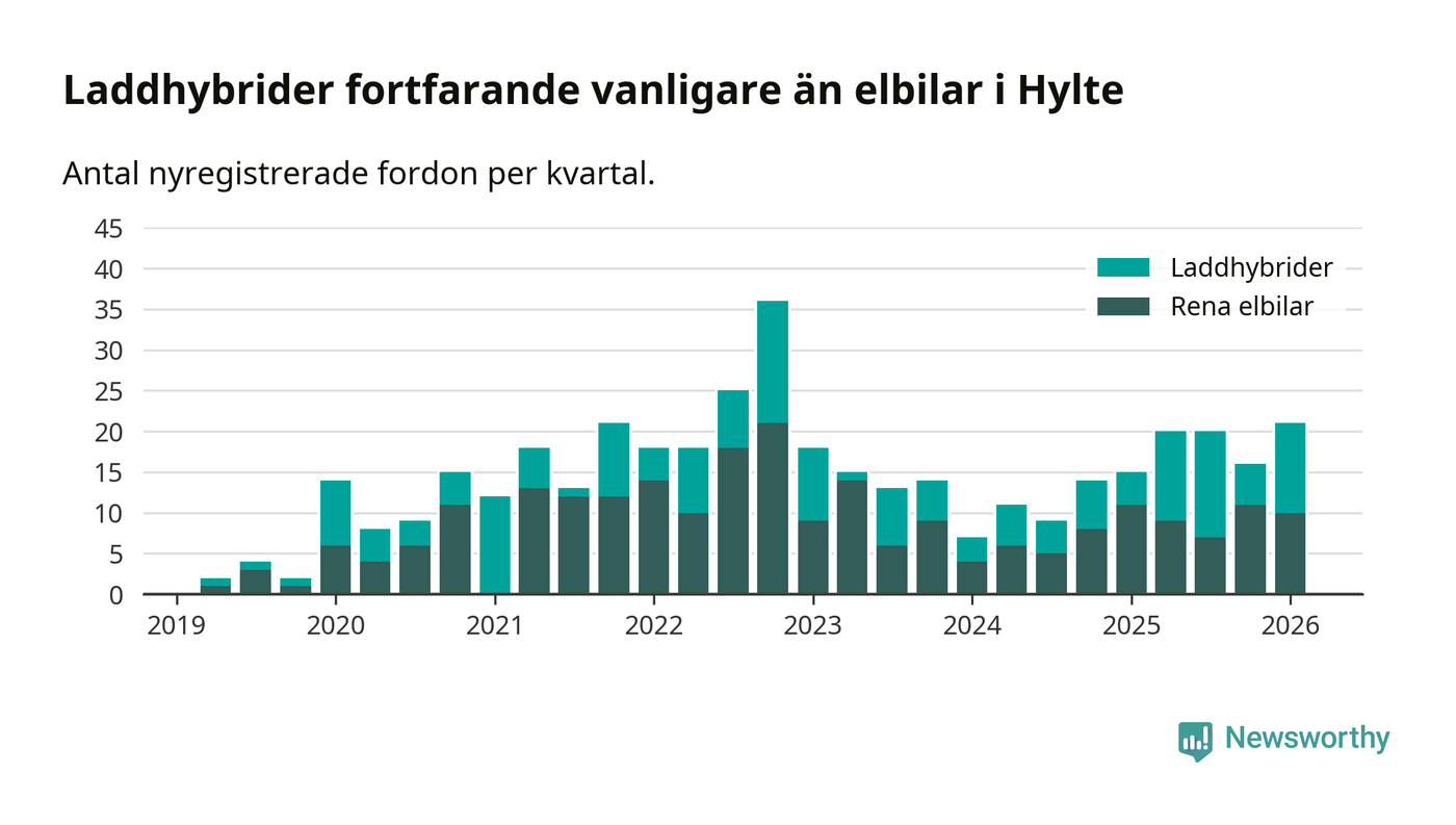Under första kvartalet 2026 var 55 procent av alla nyregistrerade personbilar i Hylte laddbara (sammanlagt registrerades 38 nya bilar). Merparten av de laddbara bilarna var så kallade laddhybrider, det vill säga fordon som går att ladda och köra på el, men som även har en förbränningsmotor. 26 procent av alla nya bilar var rena elbilar.