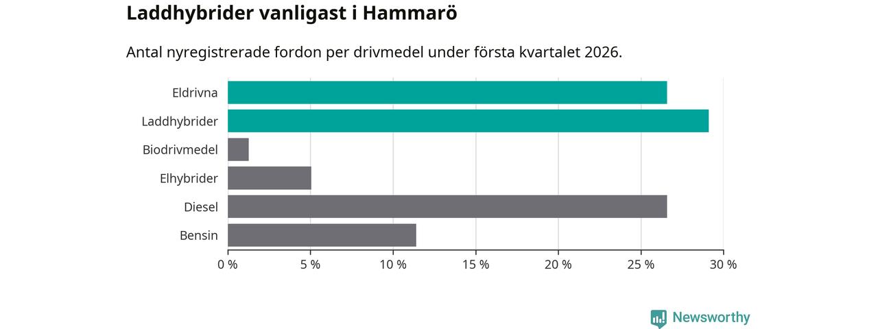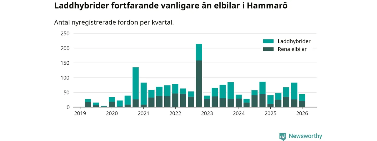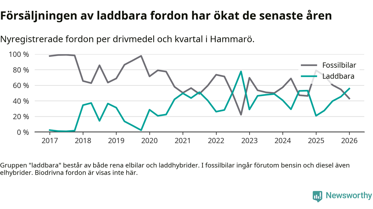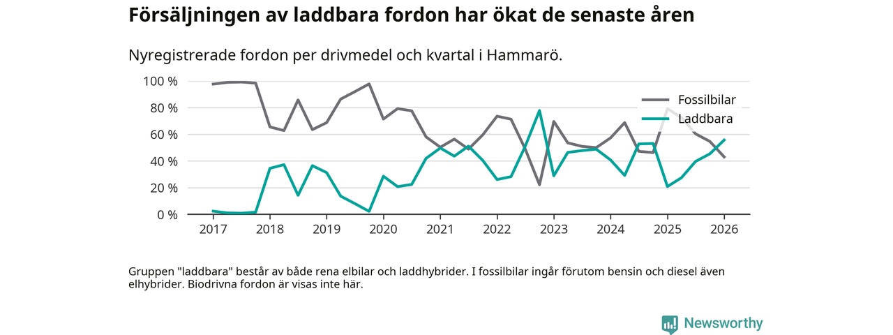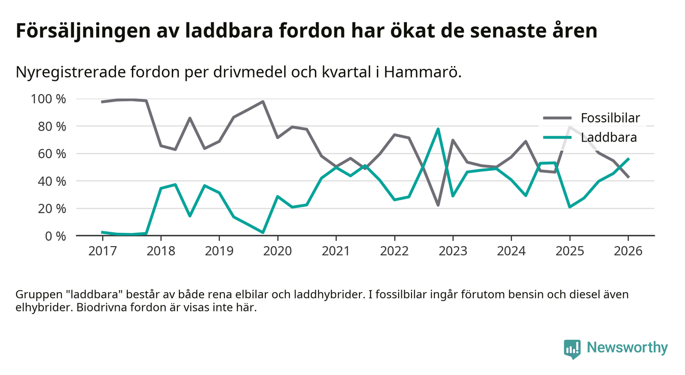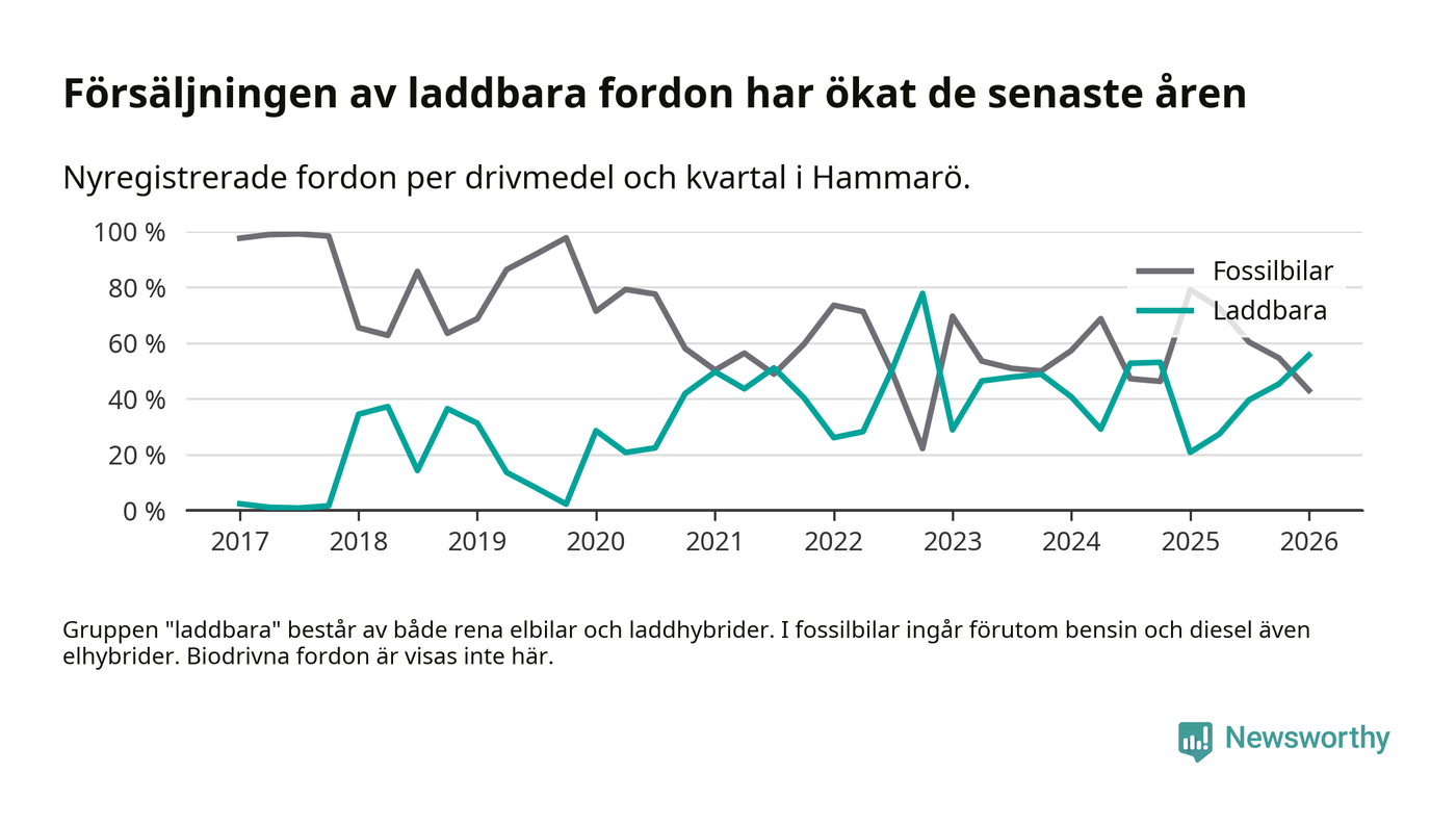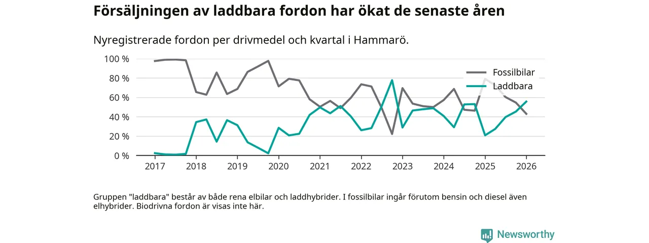 Under första kvartalet 2026 var 56 procent av alla nyregistrerade personbilar på Hammarö laddbara (sammanlagt registrerades 79 nya bilar). Merparten av de laddbara bilarna var så kallade laddhybrider, det vill säga fordon som går att ladda och köra på el, men som även har en förbränningsmotor. 27 procent av alla nya bilar var rena elbilar.