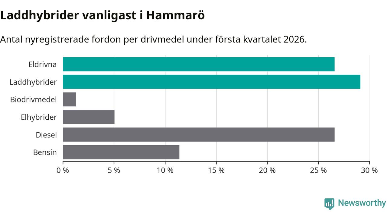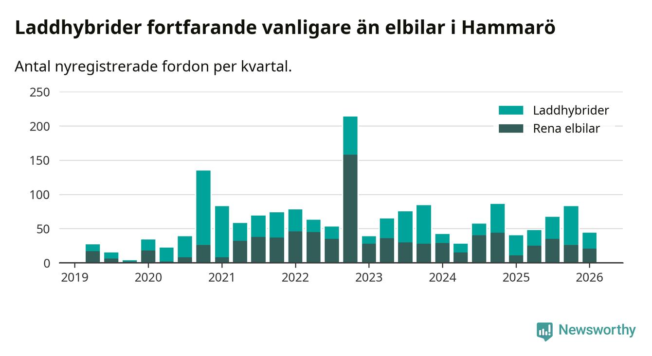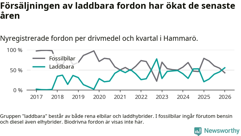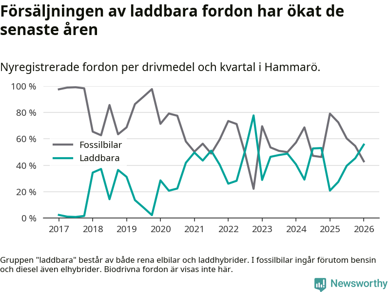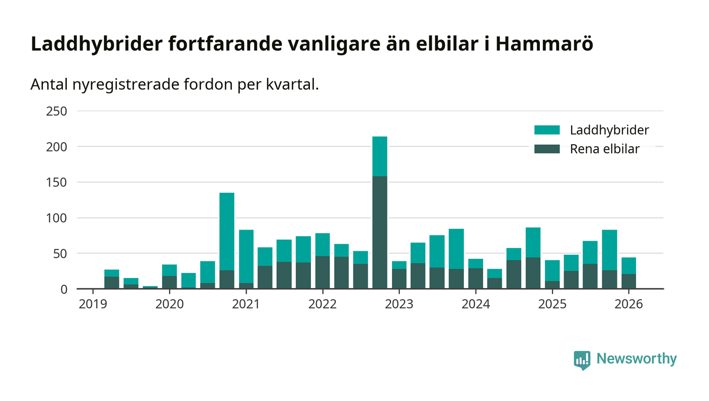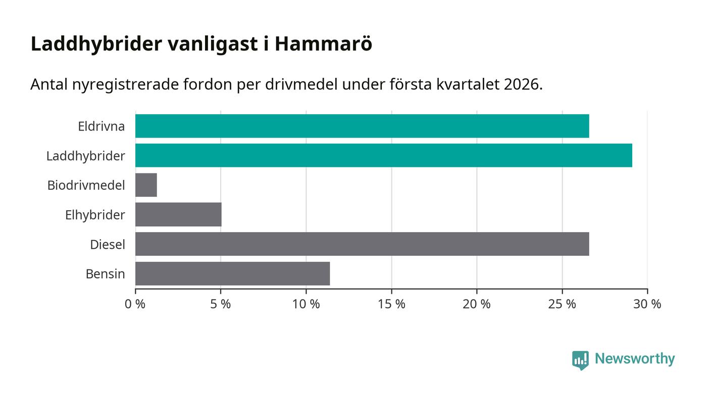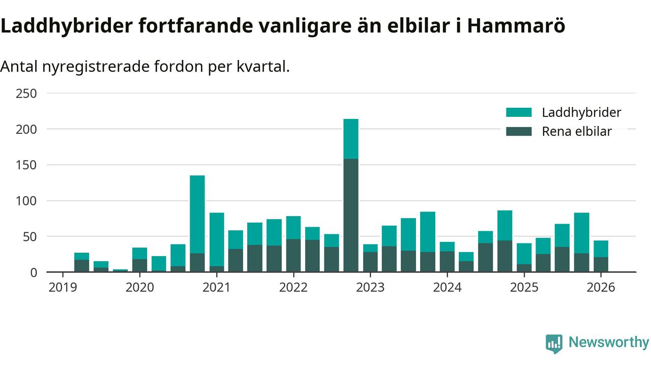 Under första kvartalet 2026 var 56 procent av alla nyregistrerade personbilar på Hammarö laddbara (sammanlagt registrerades 79 nya bilar). Merparten av de laddbara bilarna var så kallade laddhybrider, det vill säga fordon som går att ladda och köra på el, men som även har en förbränningsmotor. 27 procent av alla nya bilar var rena elbilar.