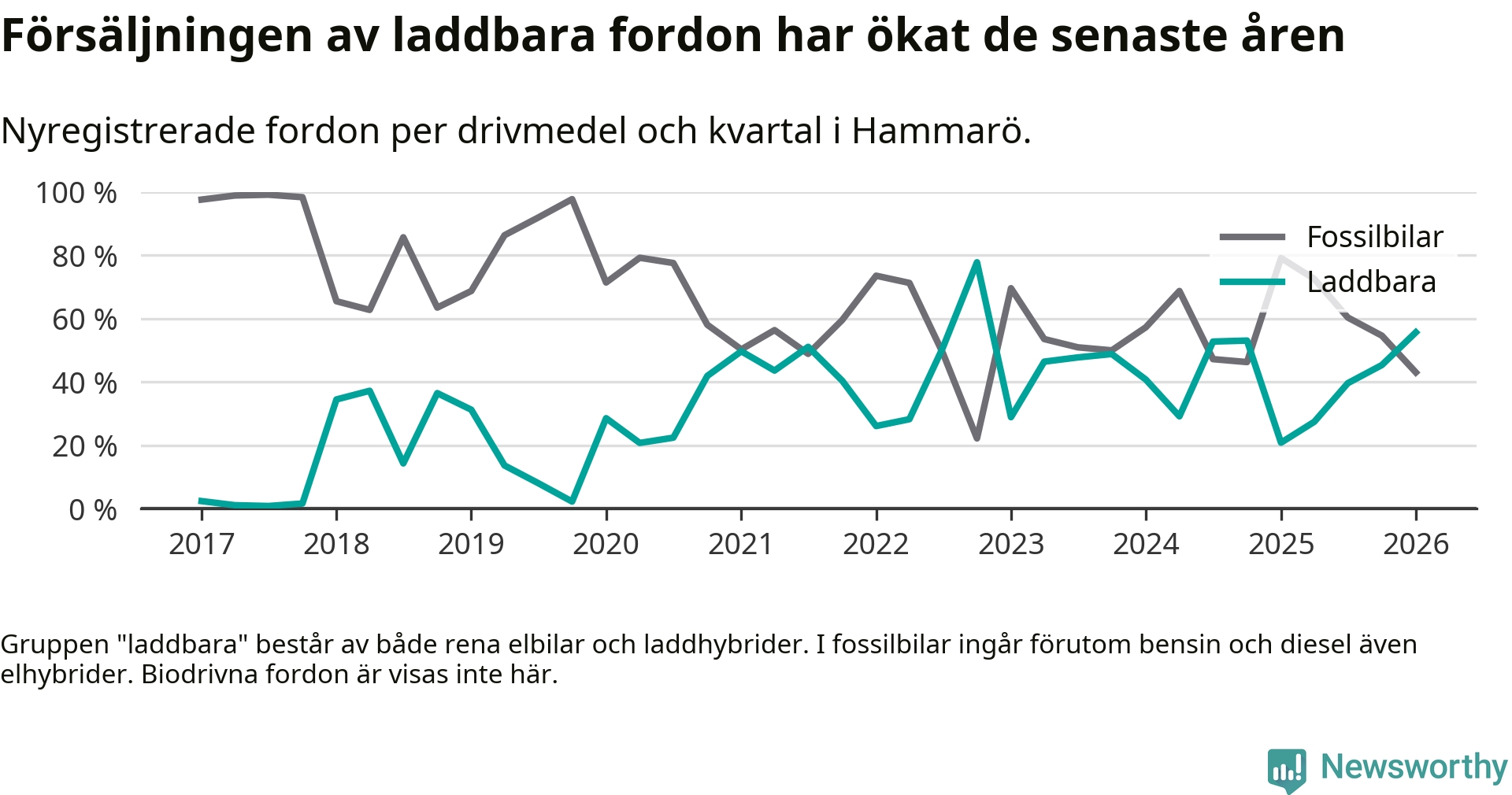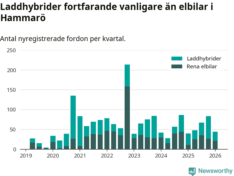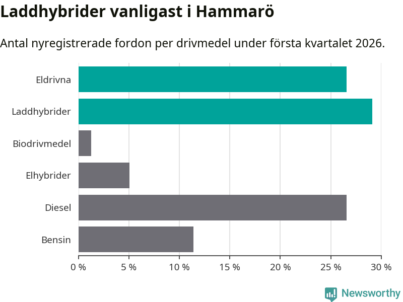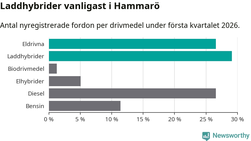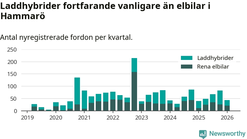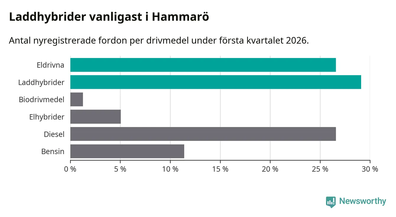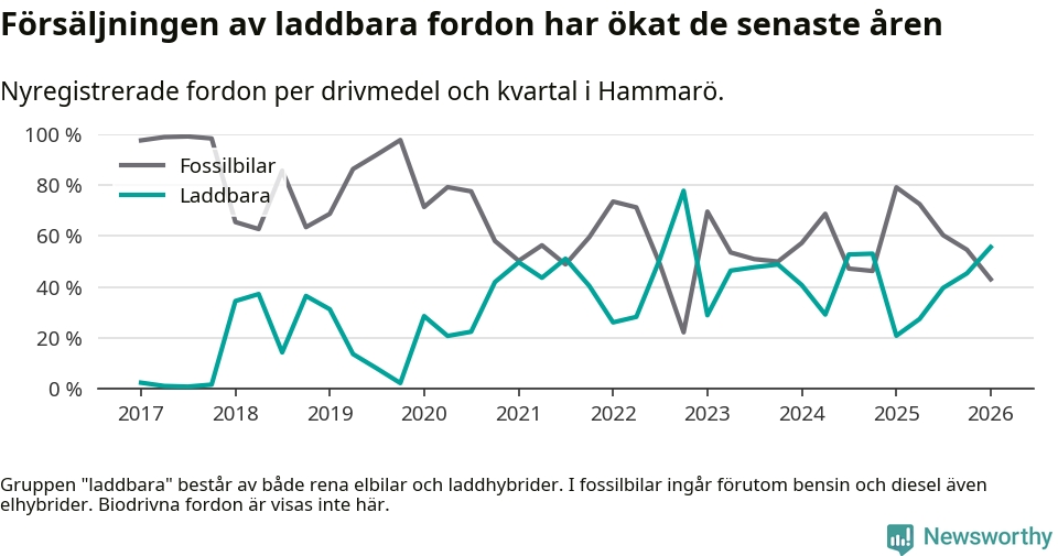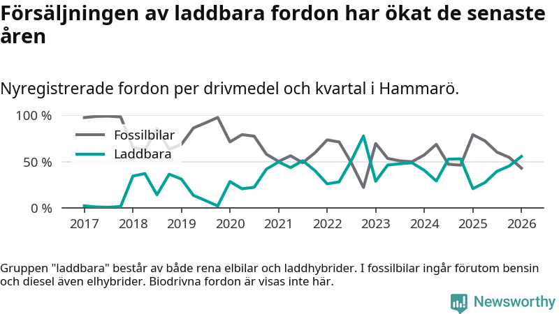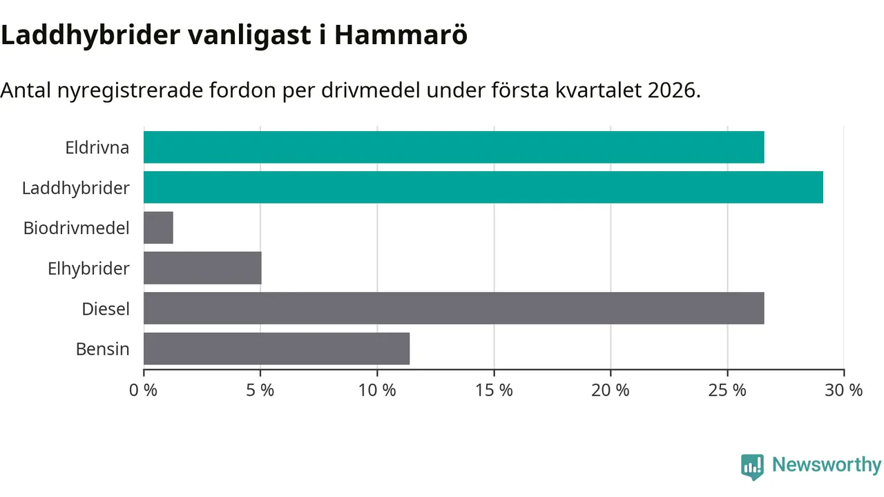 Under första kvartalet 2026 var 56 procent av alla nyregistrerade personbilar på Hammarö laddbara (sammanlagt registrerades 79 nya bilar). Merparten av de laddbara bilarna var så kallade laddhybrider, det vill säga fordon som går att ladda och köra på el, men som även har en förbränningsmotor. 27 procent av alla nya bilar var rena elbilar.