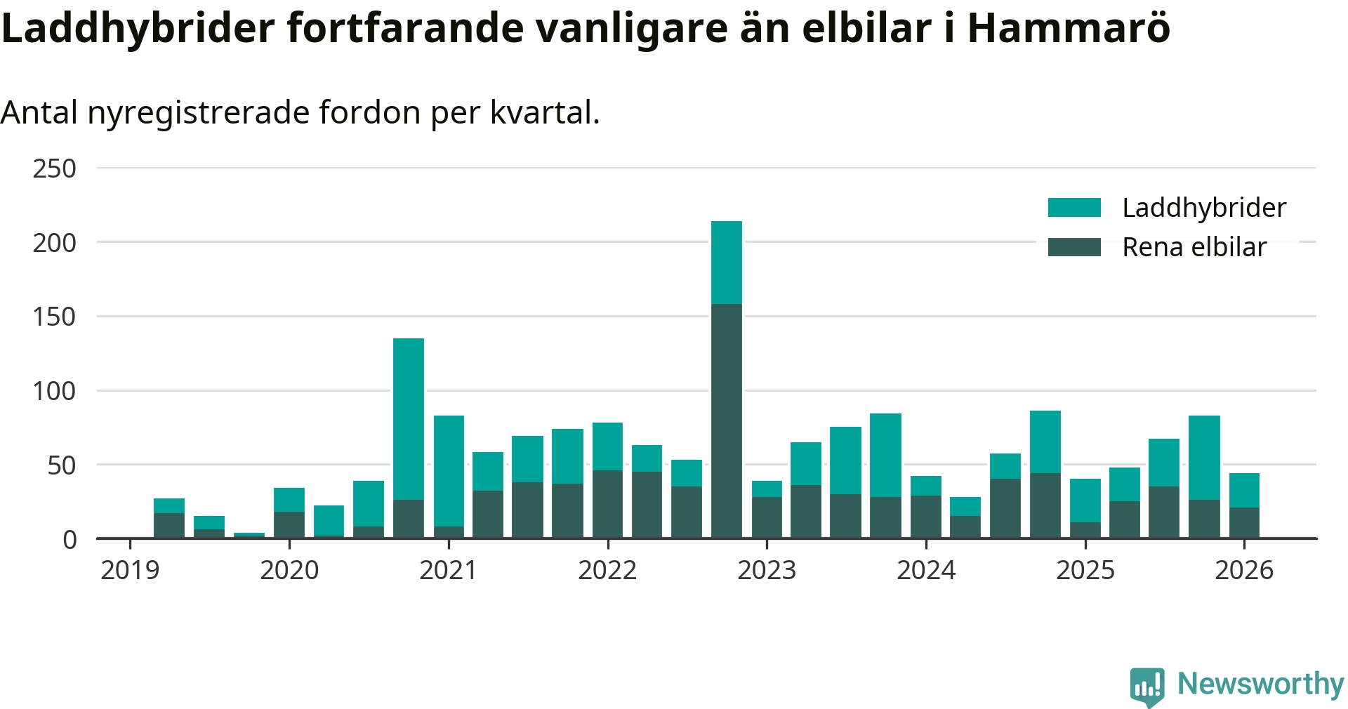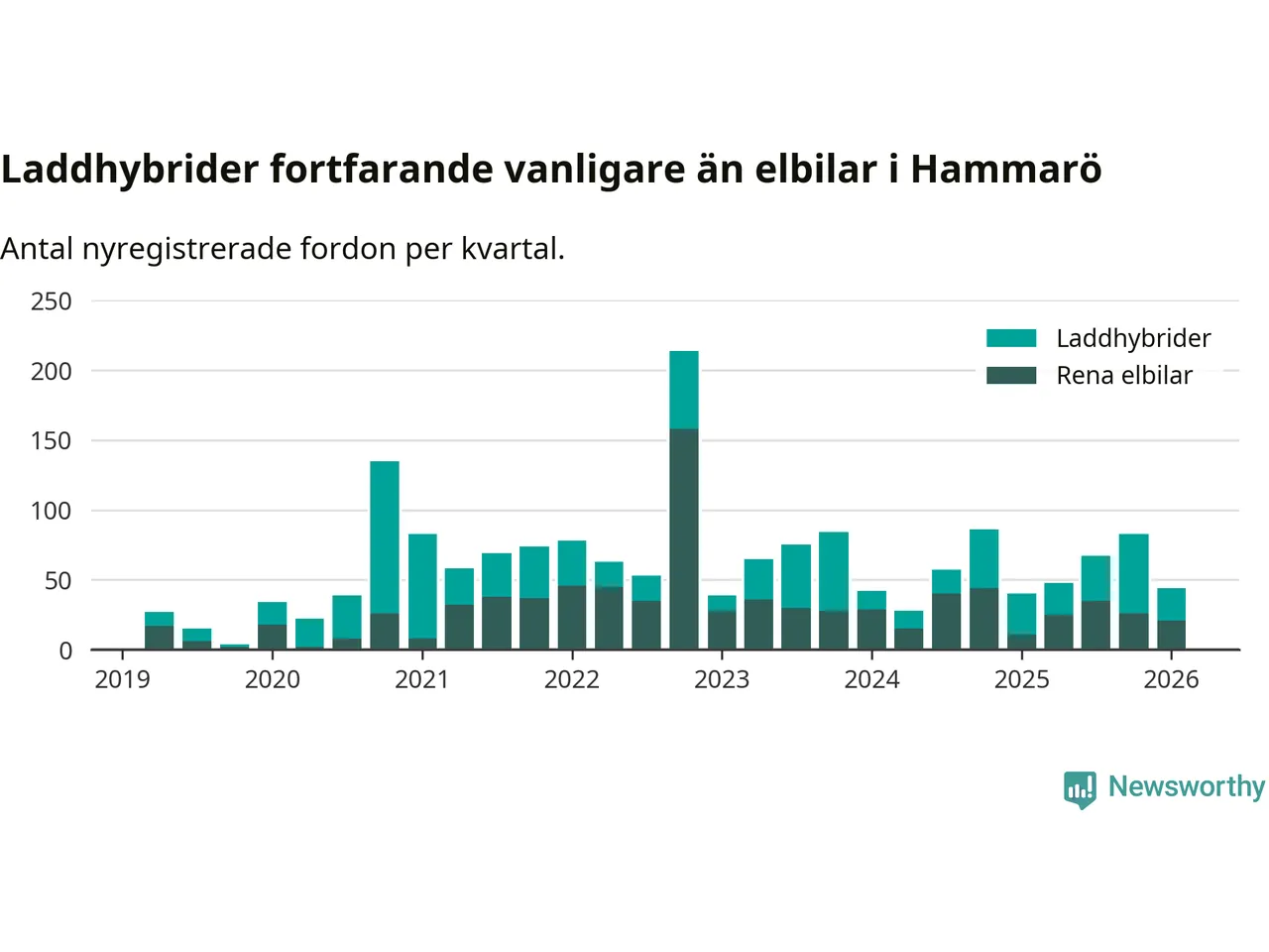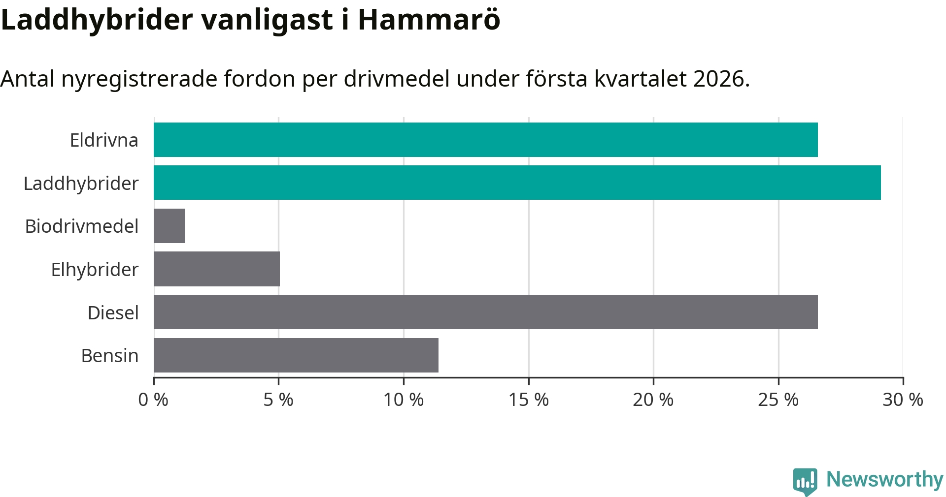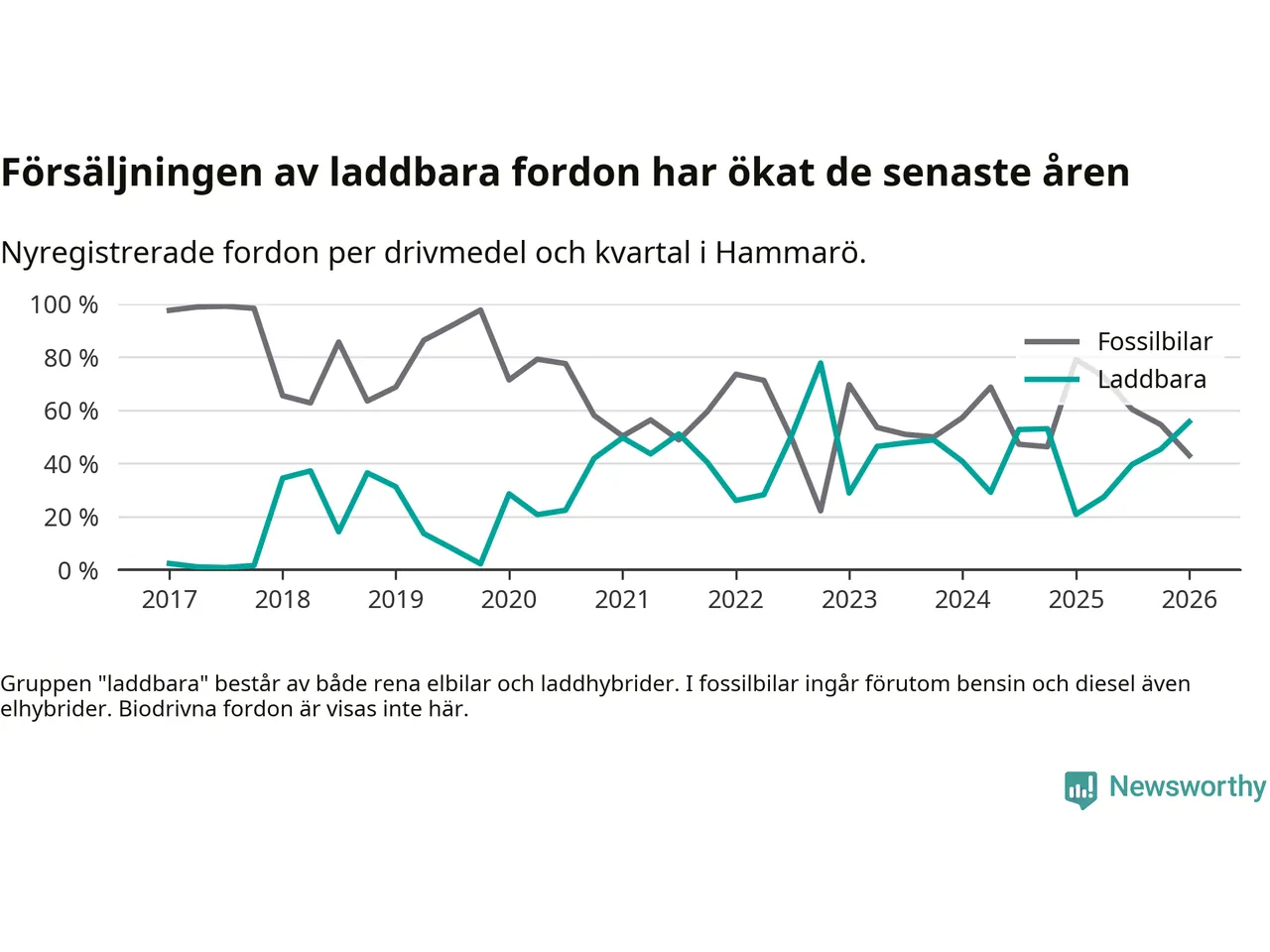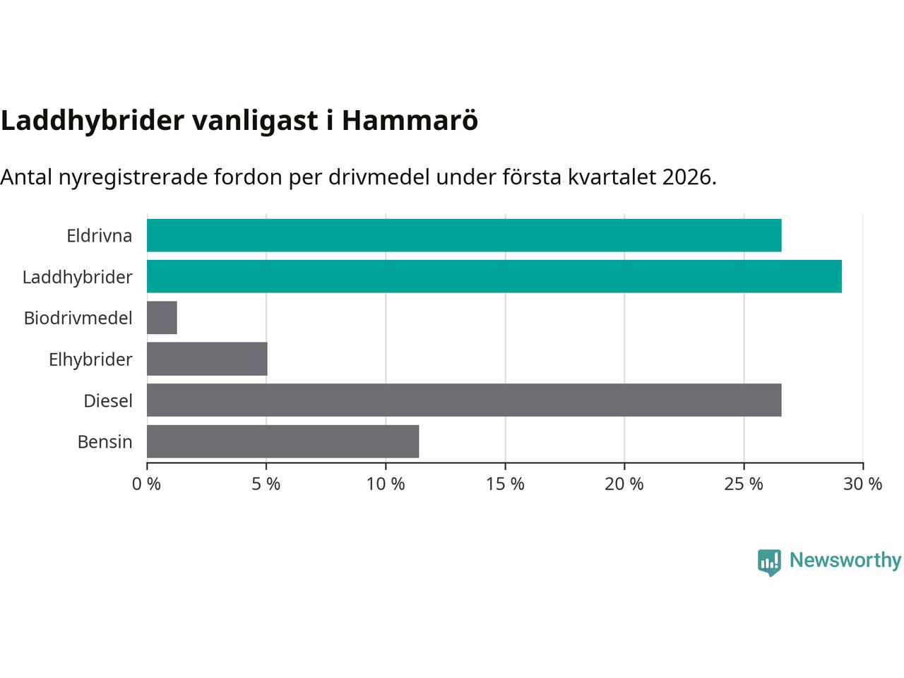 Under första kvartalet 2026 var 56 procent av alla nyregistrerade personbilar på Hammarö laddbara (sammanlagt registrerades 79 nya bilar). Merparten av de laddbara bilarna var så kallade laddhybrider, det vill säga fordon som går att ladda och köra på el, men som även har en förbränningsmotor. 27 procent av alla nya bilar var rena elbilar.