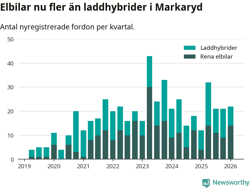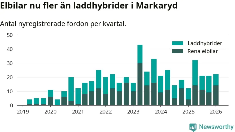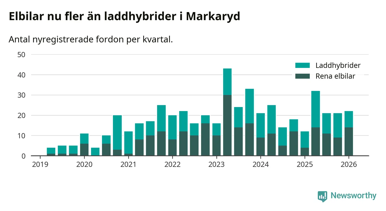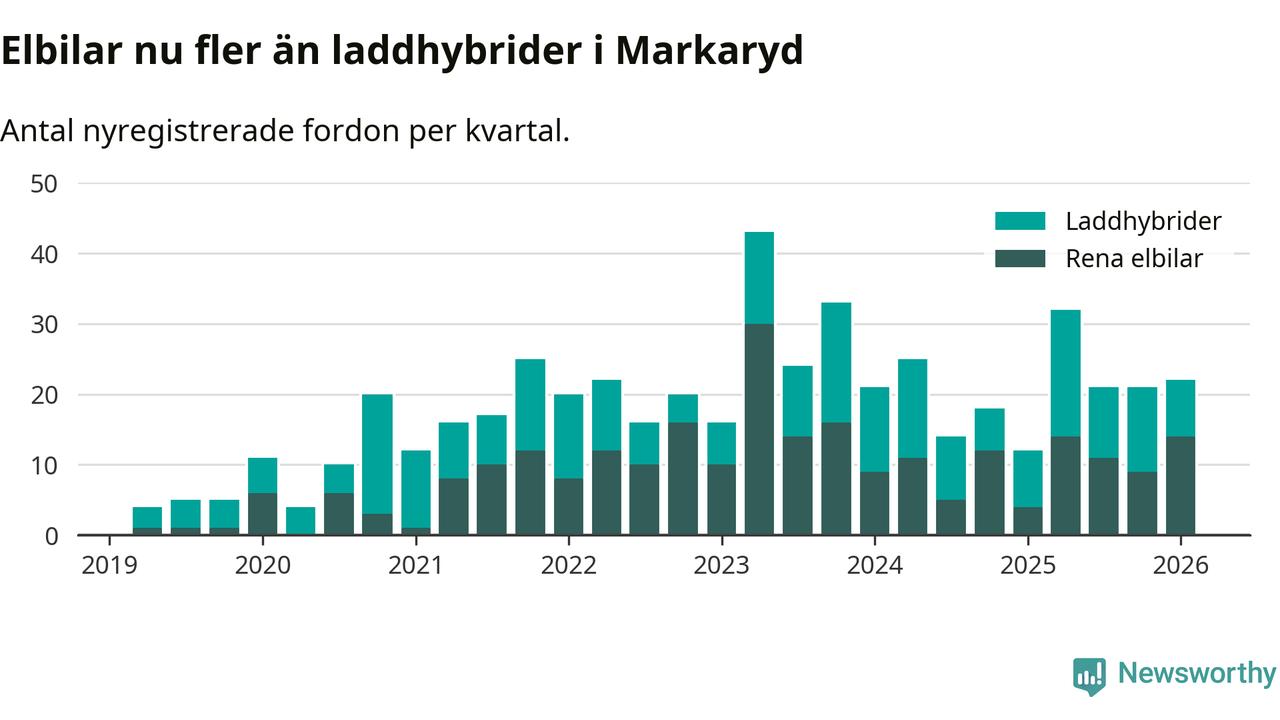Under första kvartalet var sex av tio nyregistrerade bilar i Markaryds kommun rena elbilar eller laddhybrider, en ökning jämfört med kvartalet innan. Även i landet som helhet har elbilsmarknaden tagit ny fart.