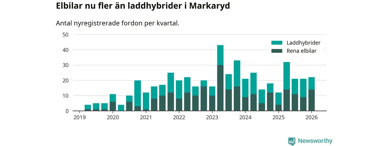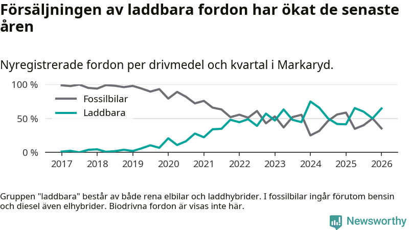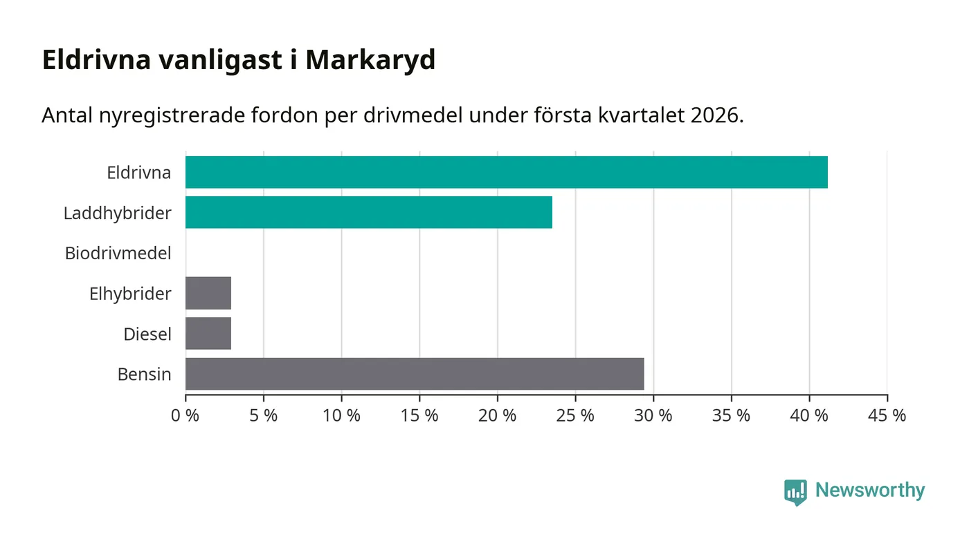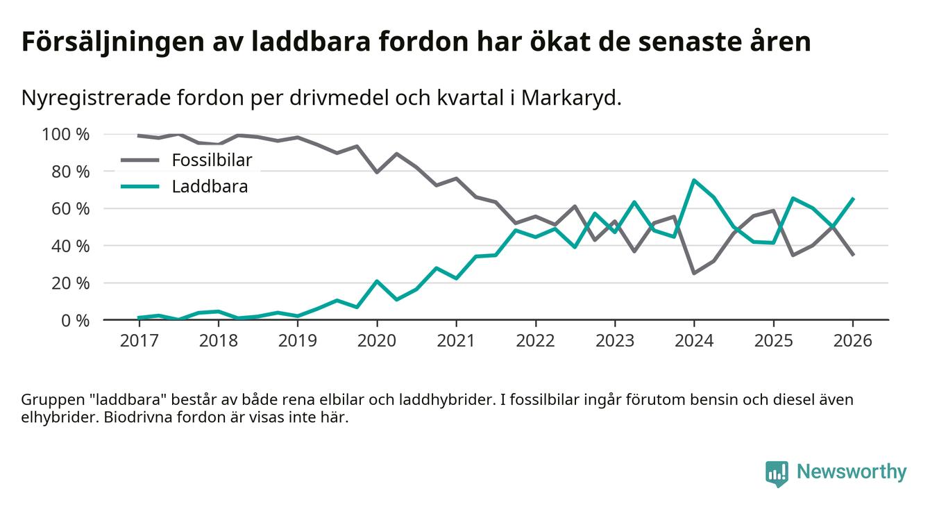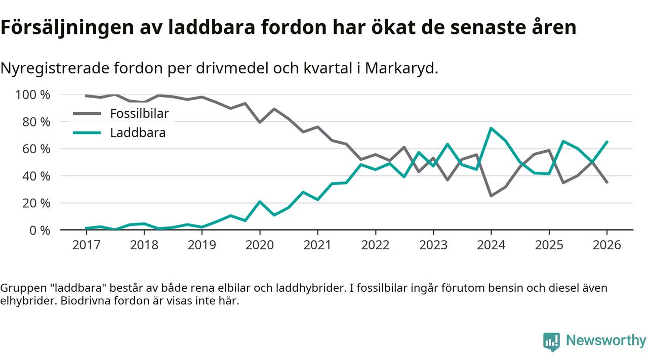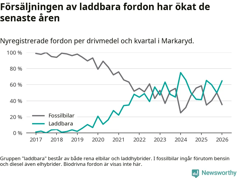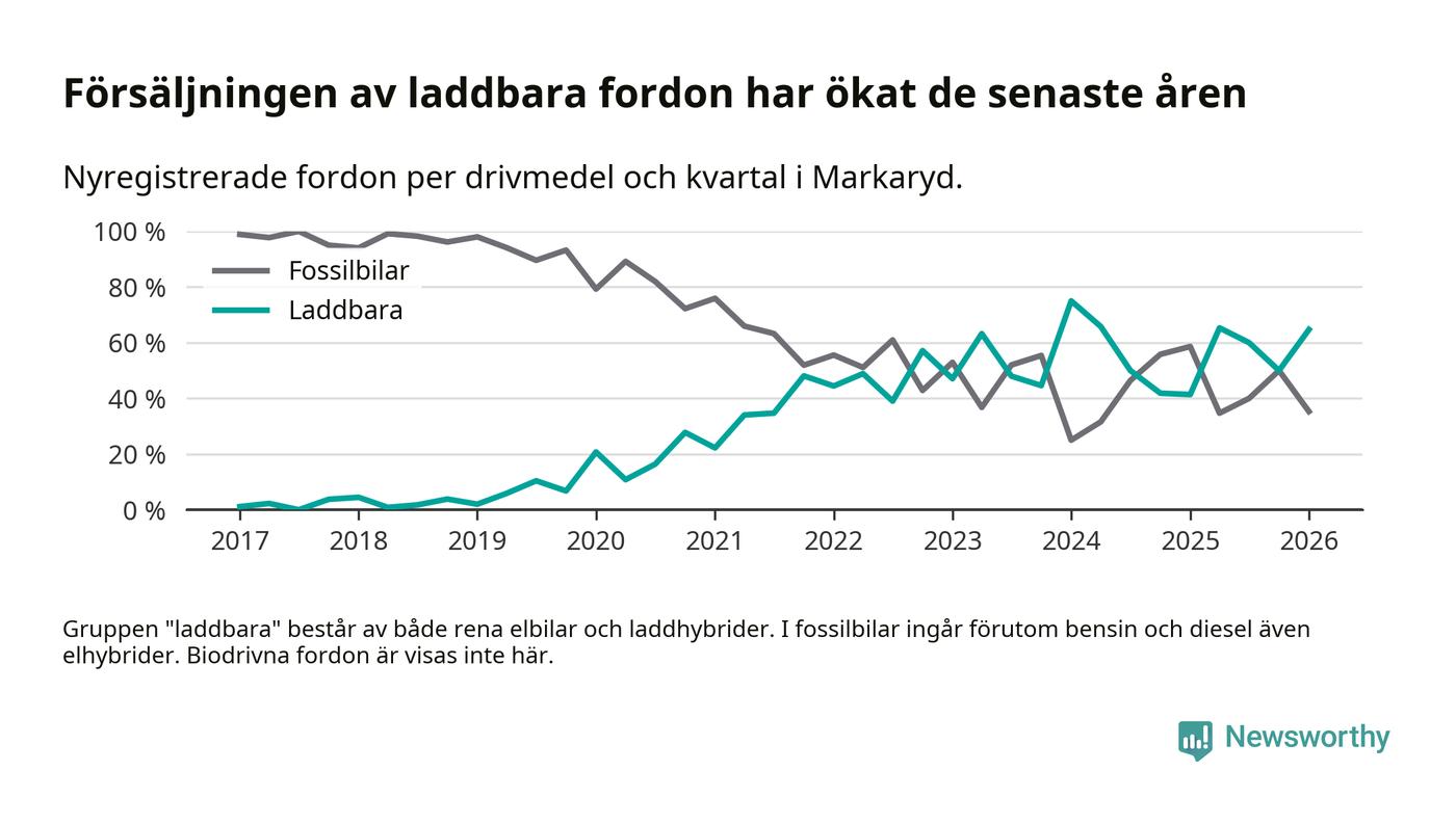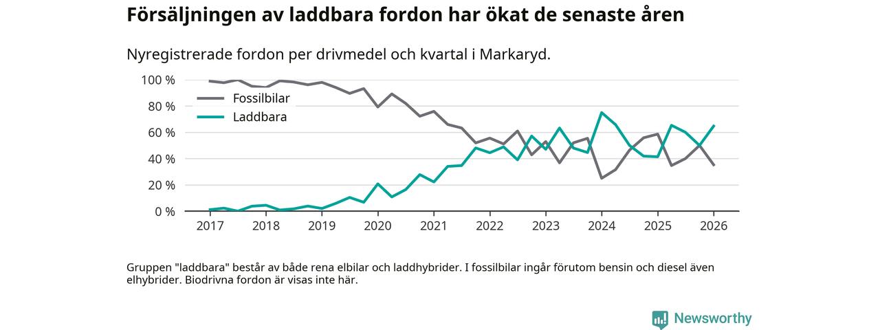 Under första kvartalet 2026 var 65 procent av alla nyregistrerade personbilar i Markaryd laddbara (sammanlagt registrerades 34 nya bilar). Merparten av de laddbara bilarna var rena elbilar (41 procent av alla).