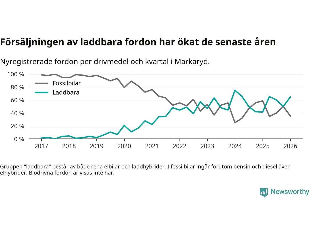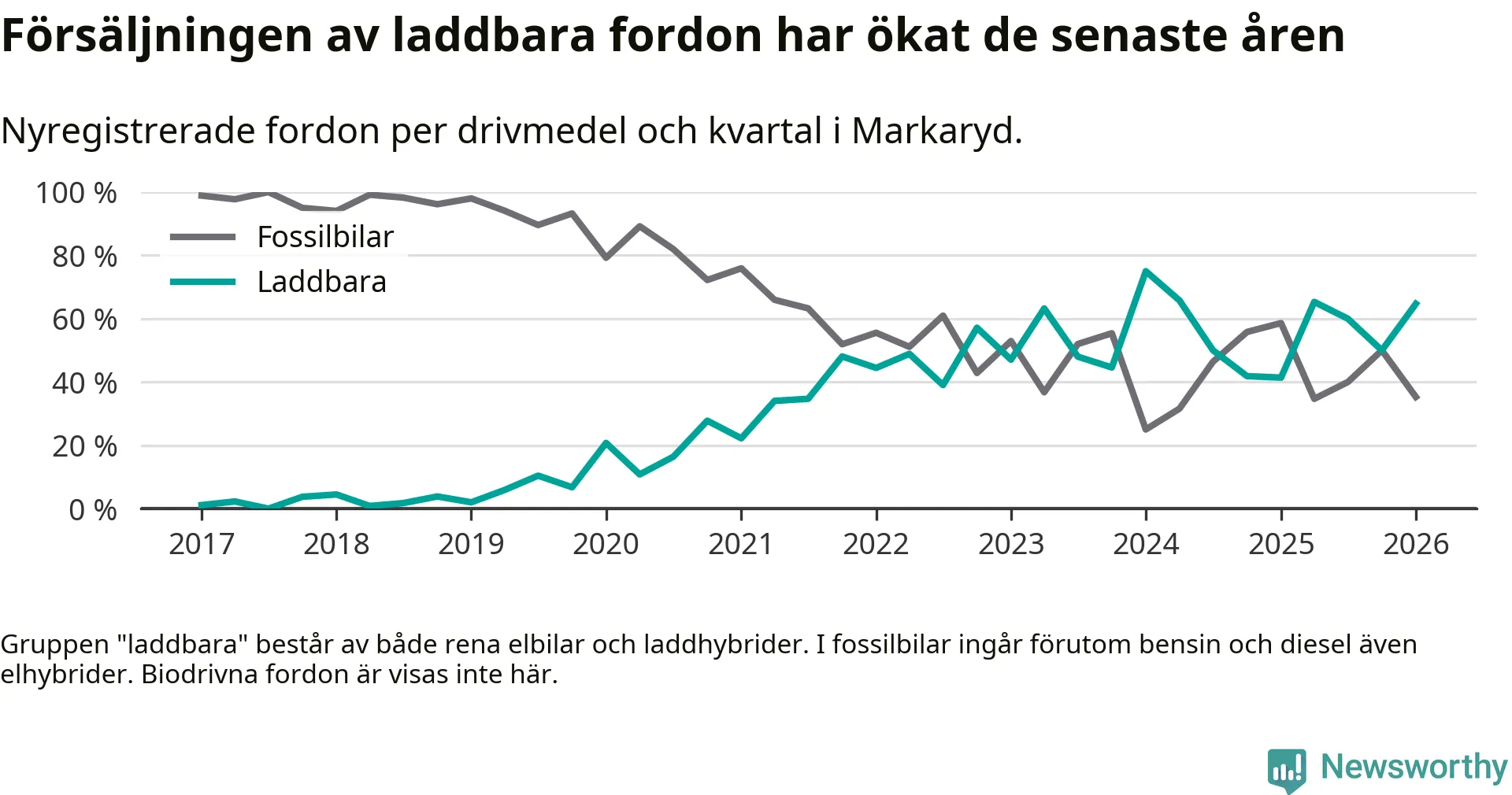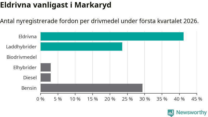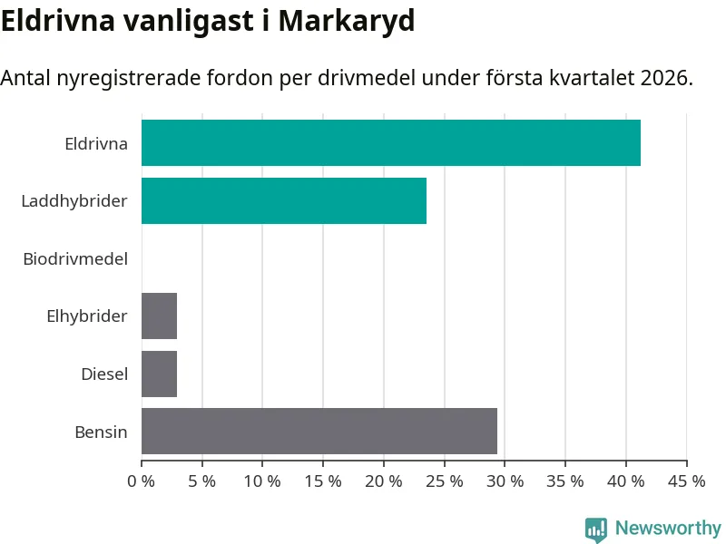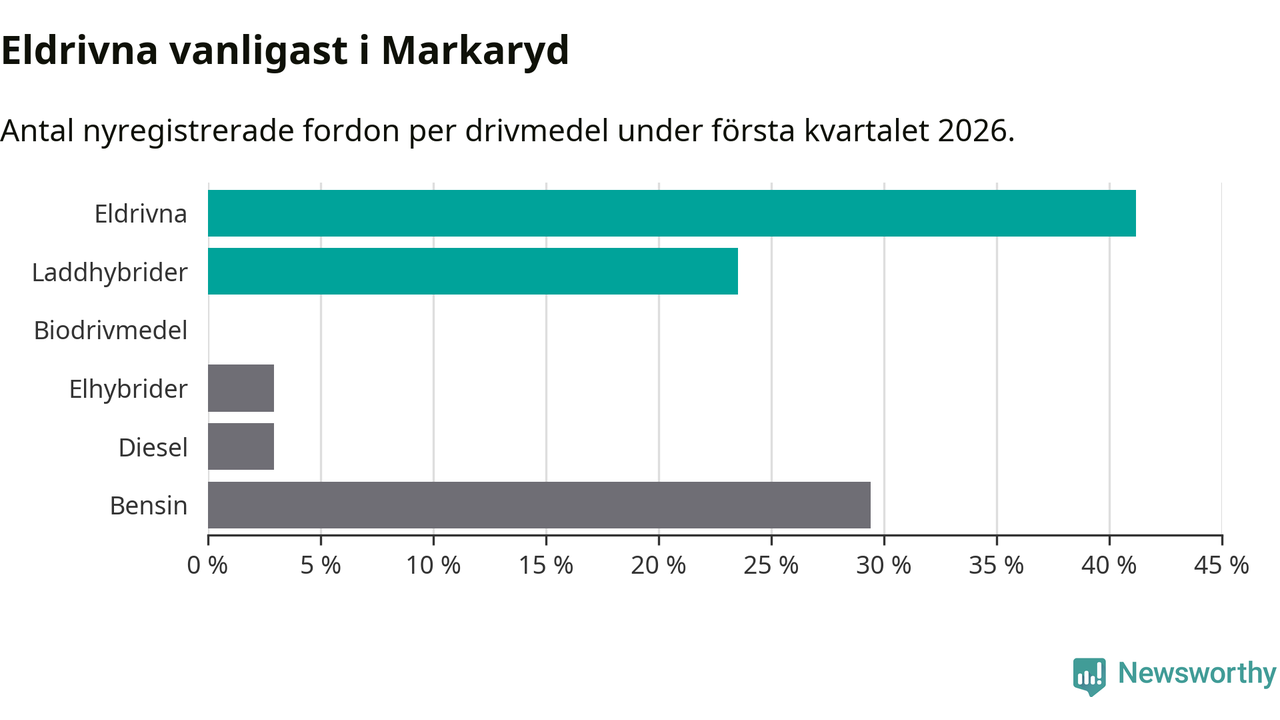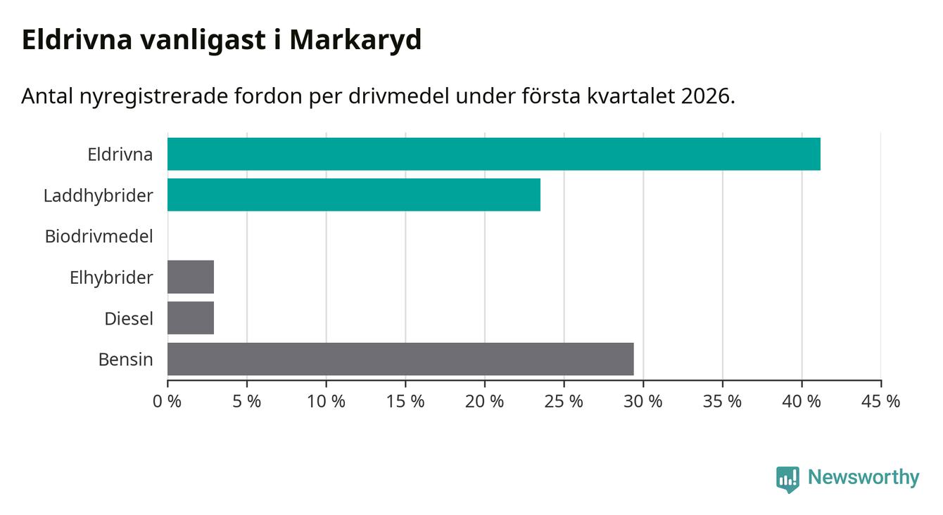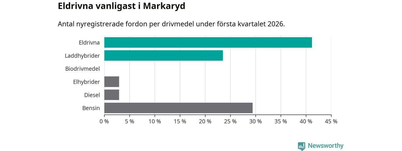 Under första kvartalet 2026 var 65 procent av alla nyregistrerade personbilar i Markaryd laddbara (sammanlagt registrerades 34 nya bilar). Merparten av de laddbara bilarna var rena elbilar (41 procent av alla).