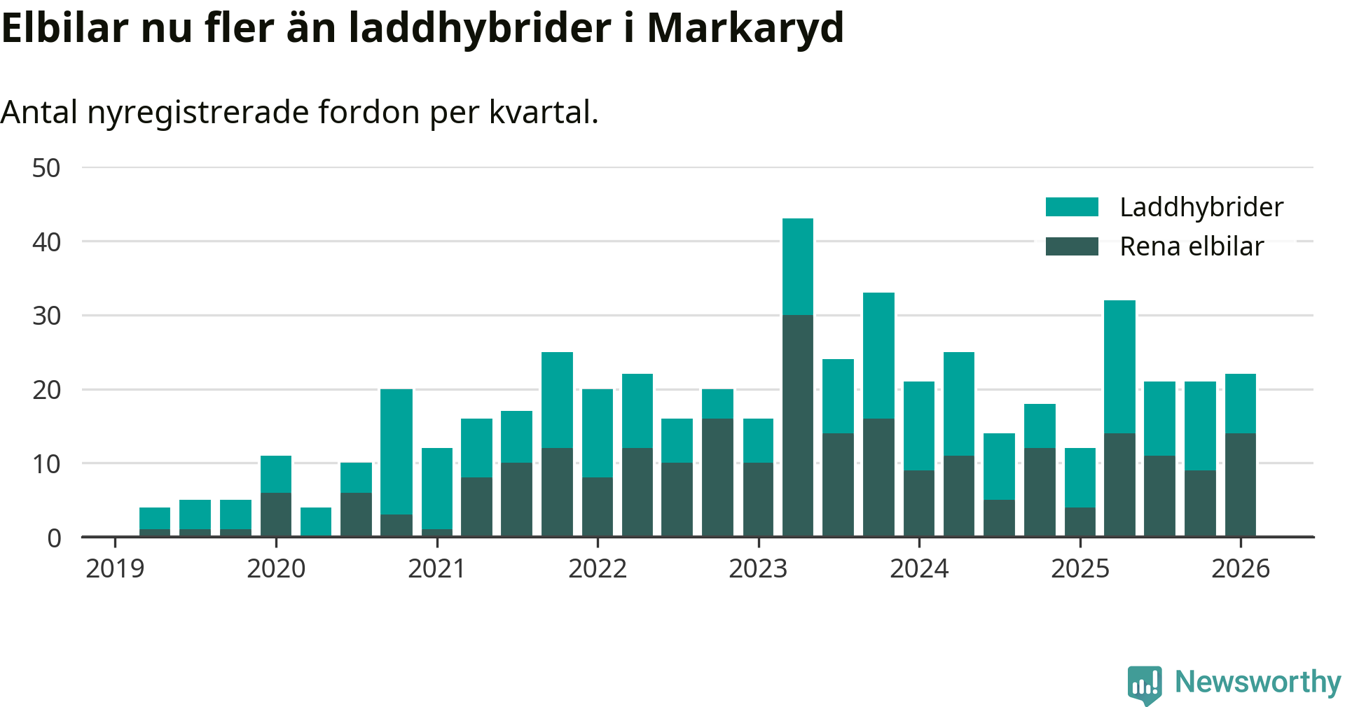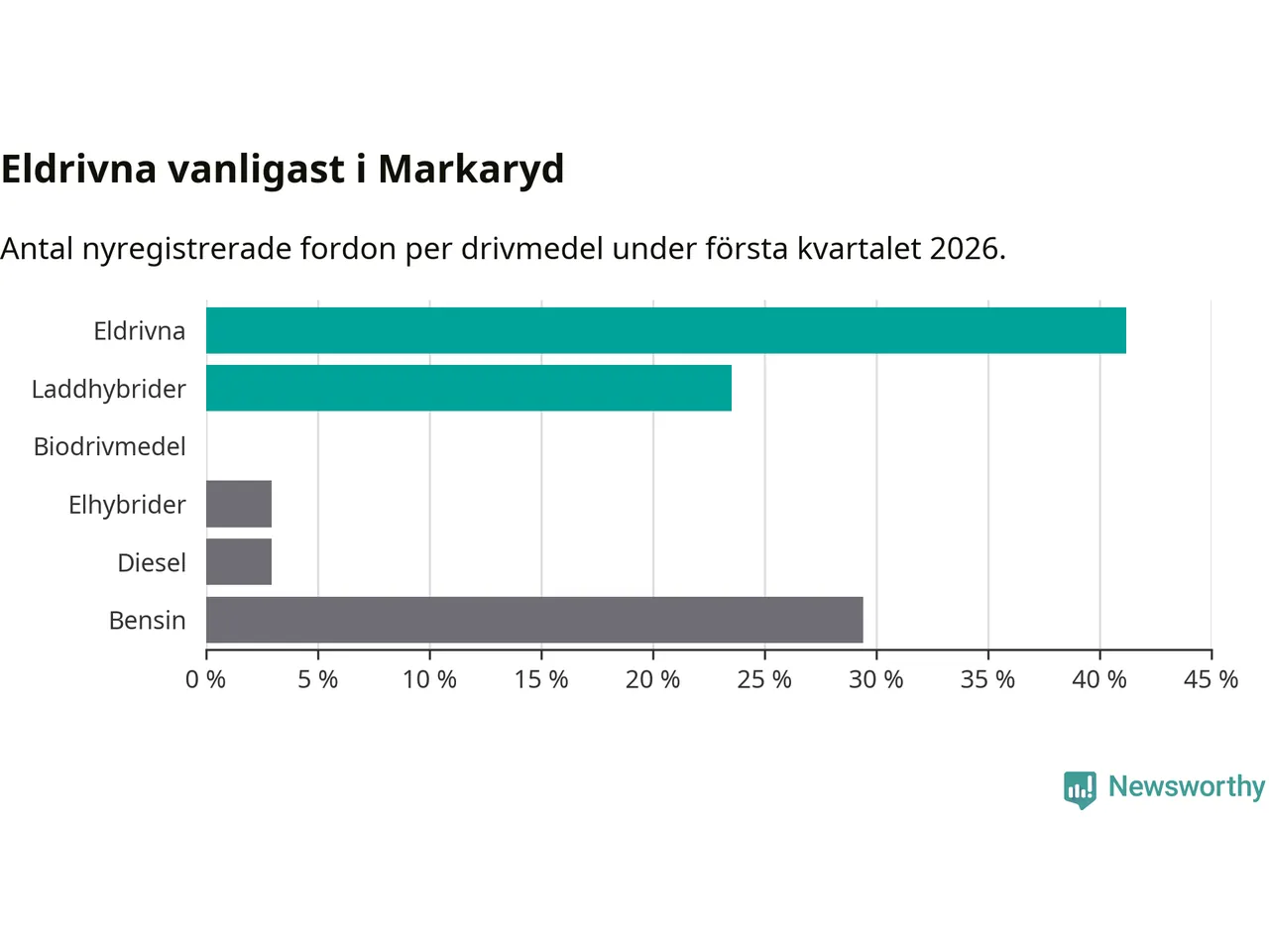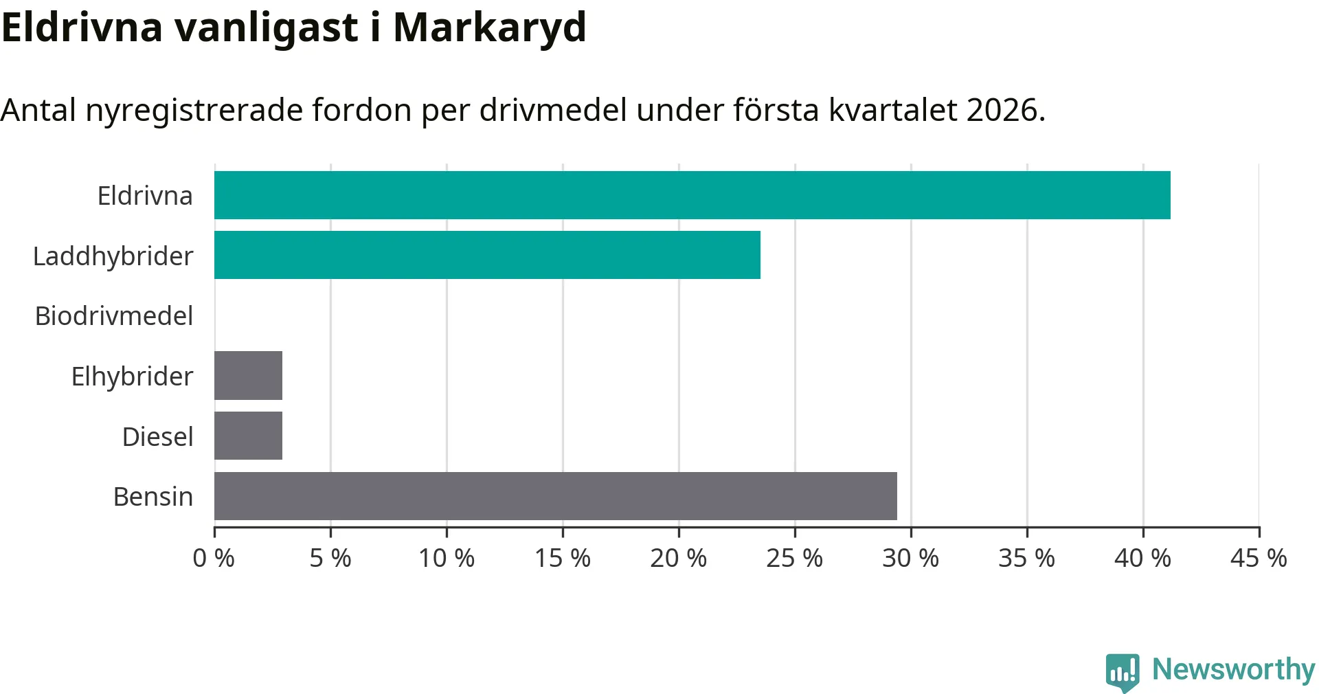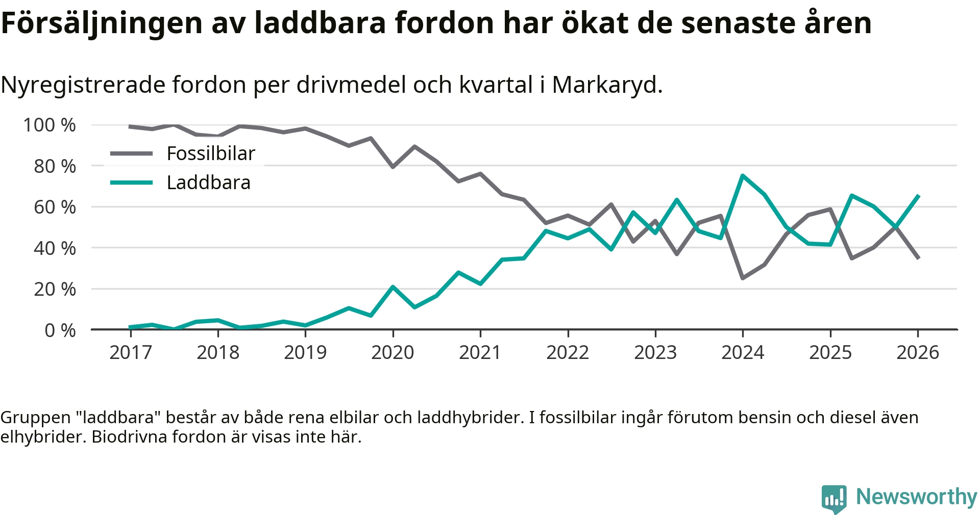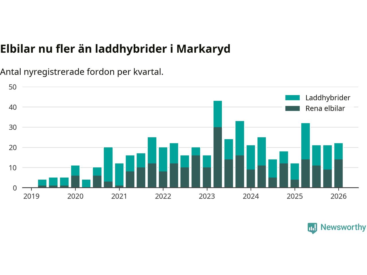 Under första kvartalet 2026 var 65 procent av alla nyregistrerade personbilar i Markaryd laddbara (sammanlagt registrerades 34 nya bilar). Merparten av de laddbara bilarna var rena elbilar (41 procent av alla).