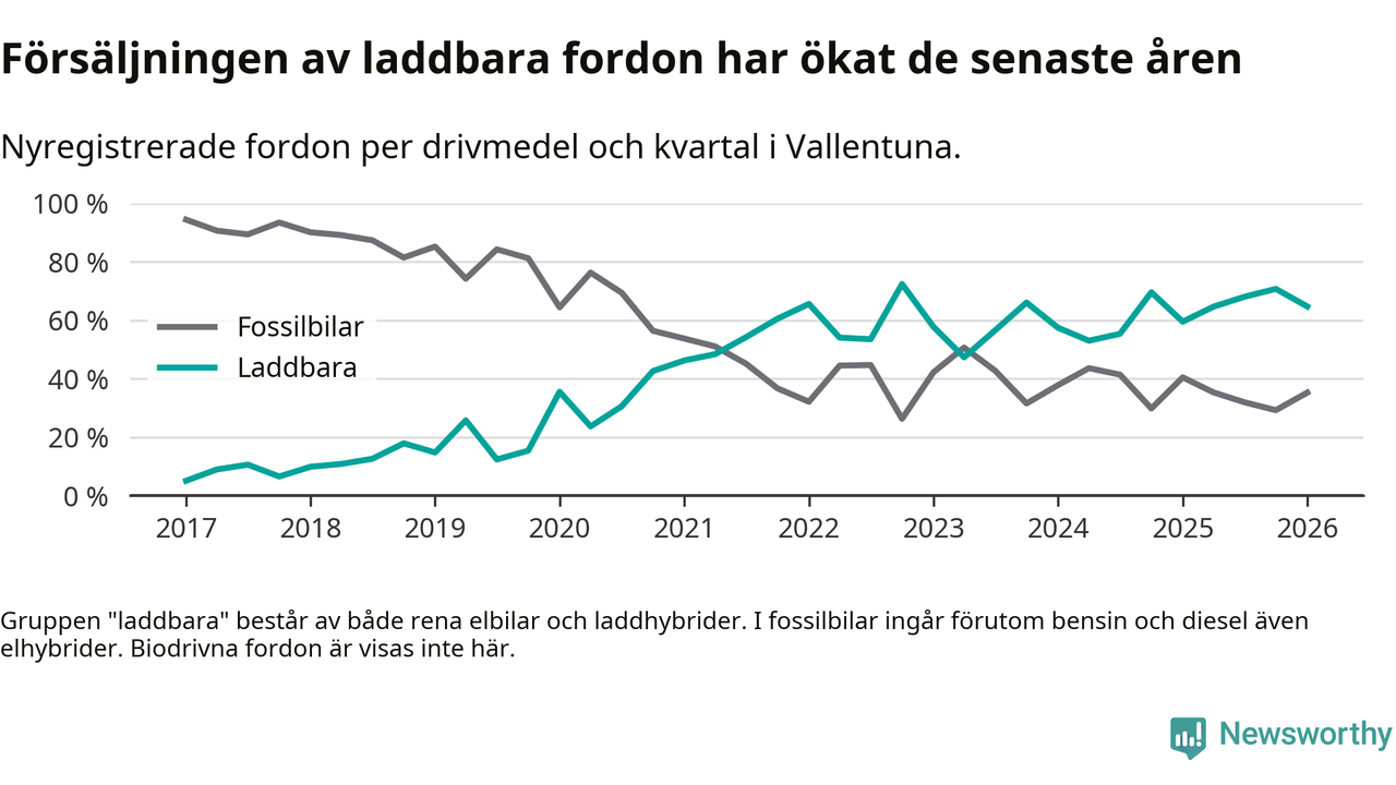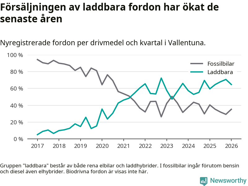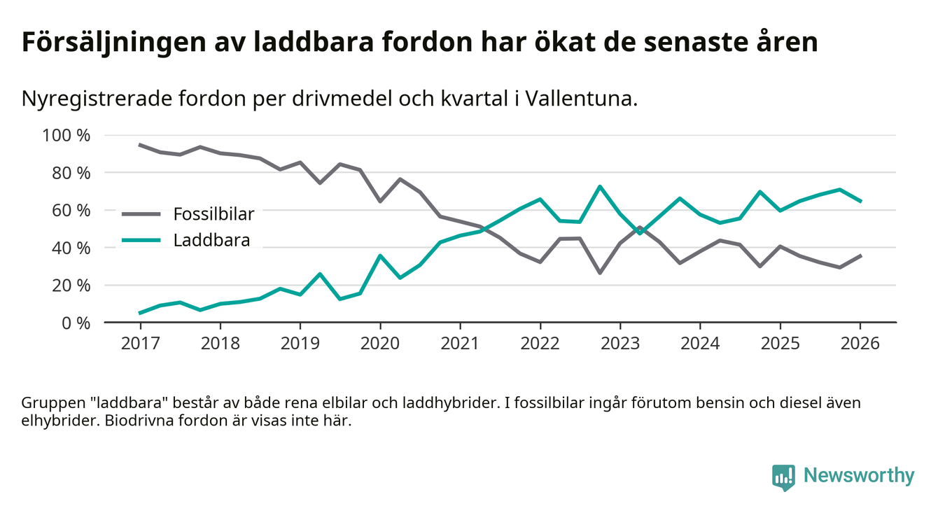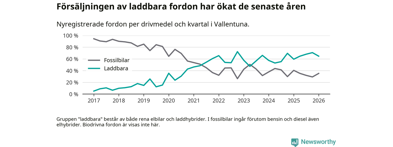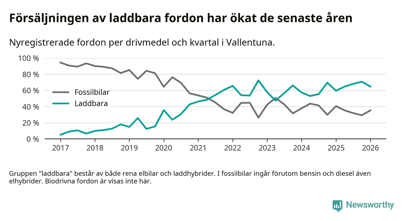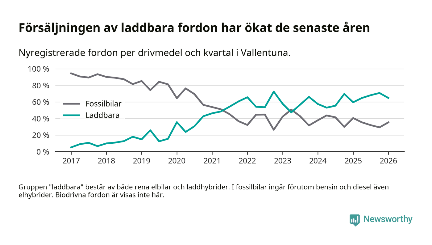 Under första kvartalet 2026 var 65 procent av alla nyregistrerade personbilar i Vallentuna laddbara (sammanlagt registrerades 156 nya bilar). Merparten av de laddbara bilarna var rena elbilar (42 procent av alla).