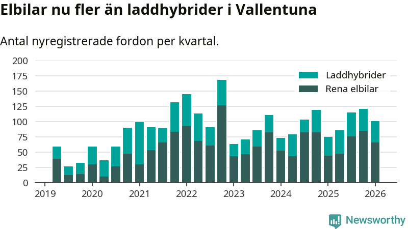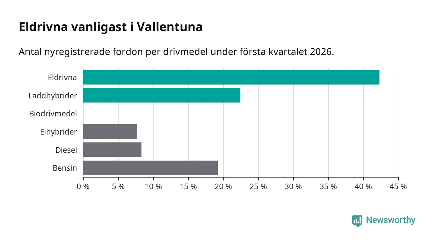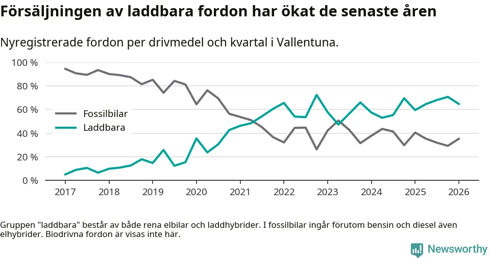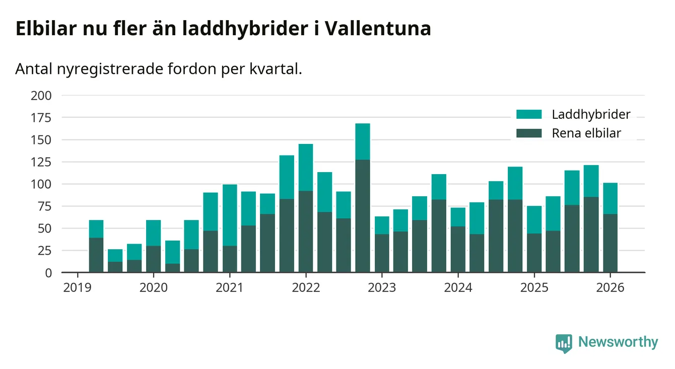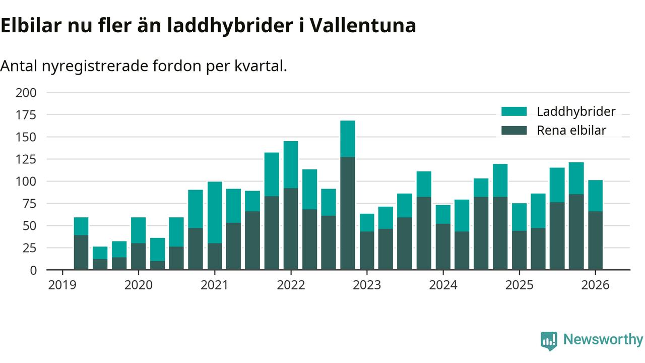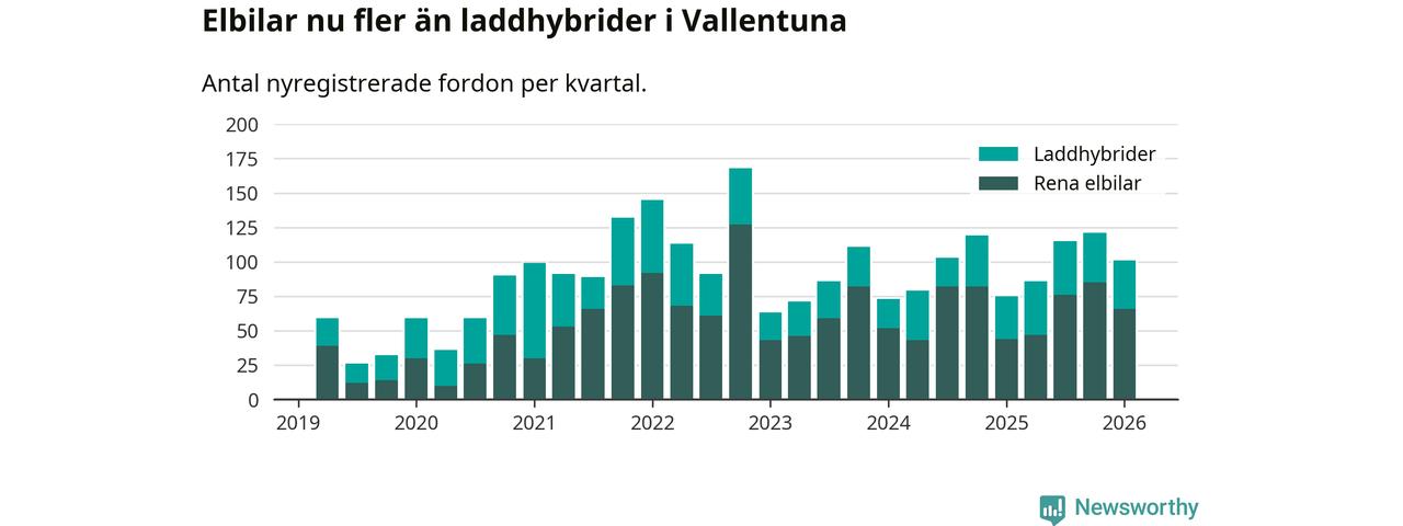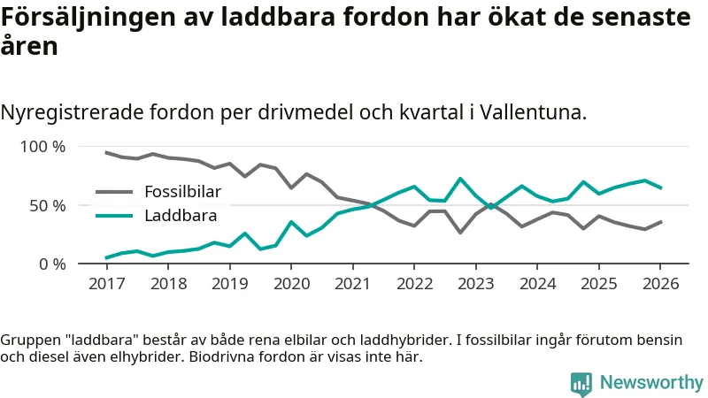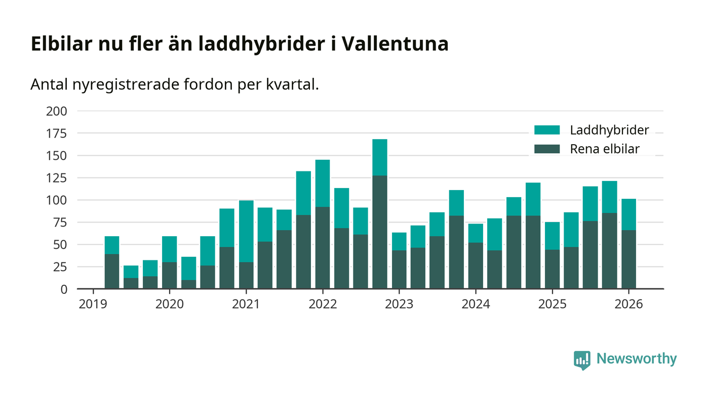 Under första kvartalet 2026 var 65 procent av alla nyregistrerade personbilar i Vallentuna laddbara (sammanlagt registrerades 156 nya bilar). Merparten av de laddbara bilarna var rena elbilar (42 procent av alla).