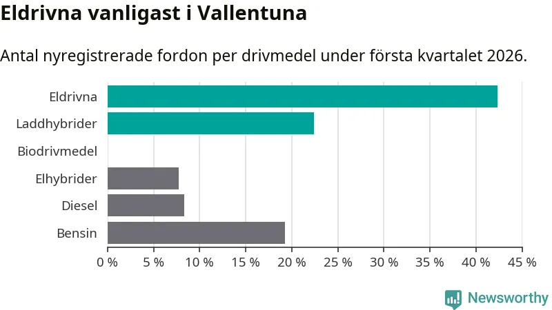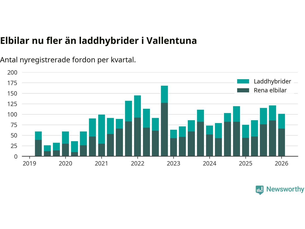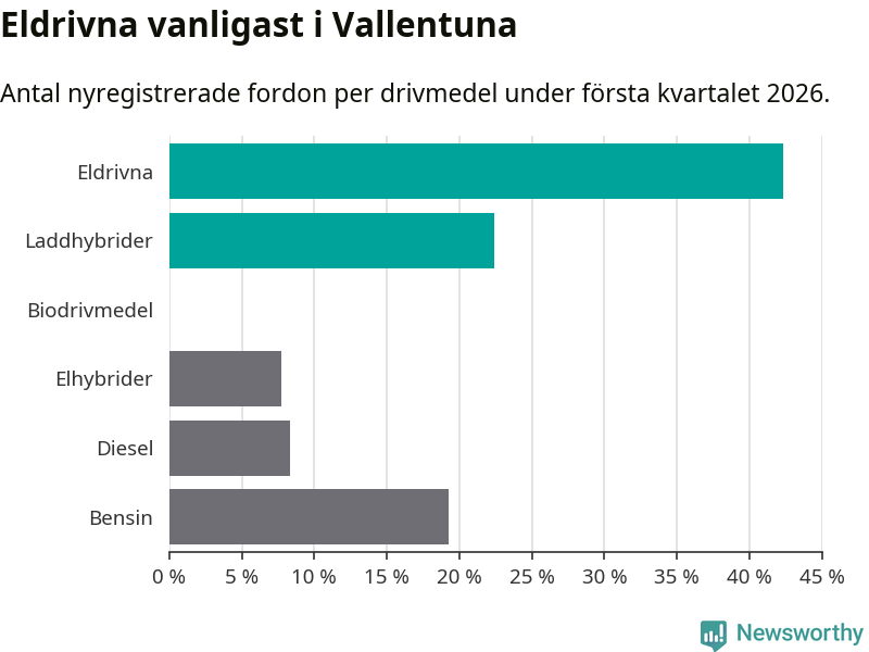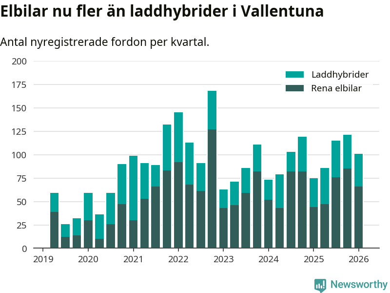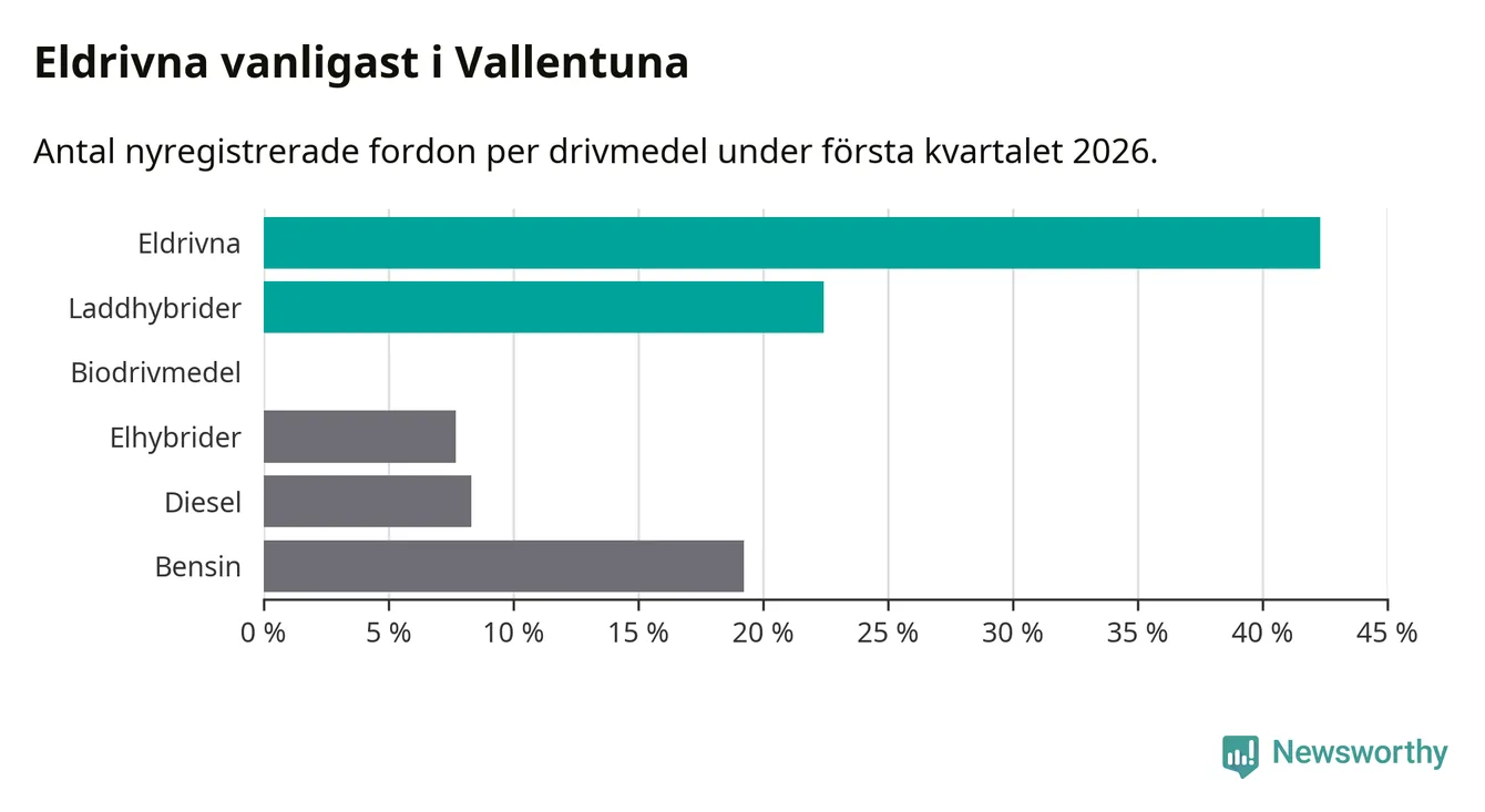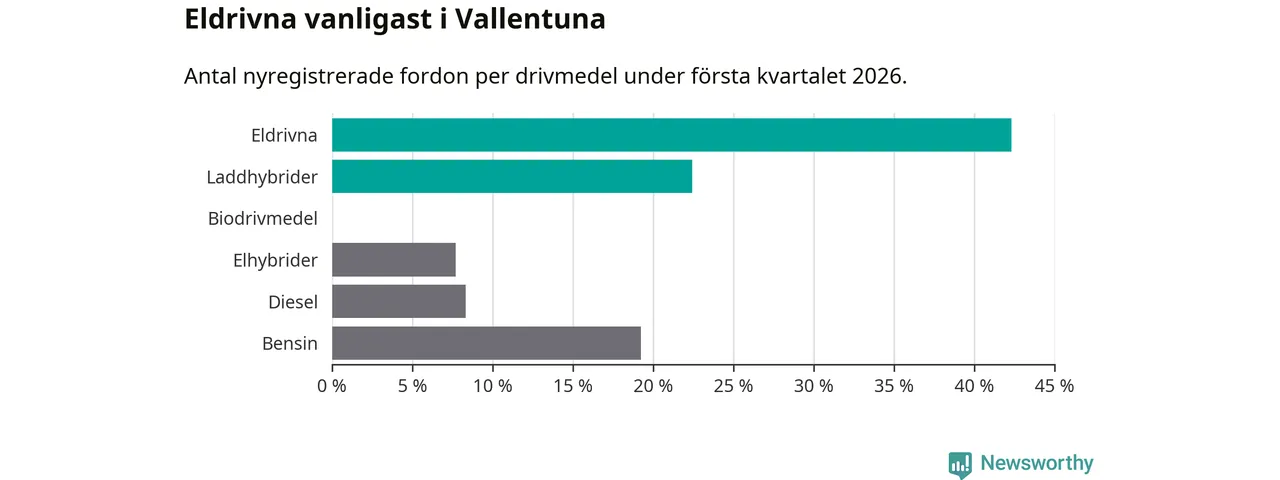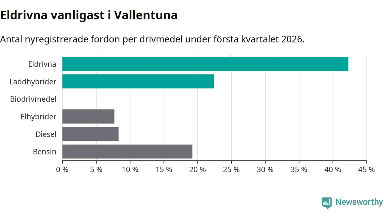 Under första kvartalet 2026 var 65 procent av alla nyregistrerade personbilar i Vallentuna laddbara (sammanlagt registrerades 156 nya bilar). Merparten av de laddbara bilarna var rena elbilar (42 procent av alla).