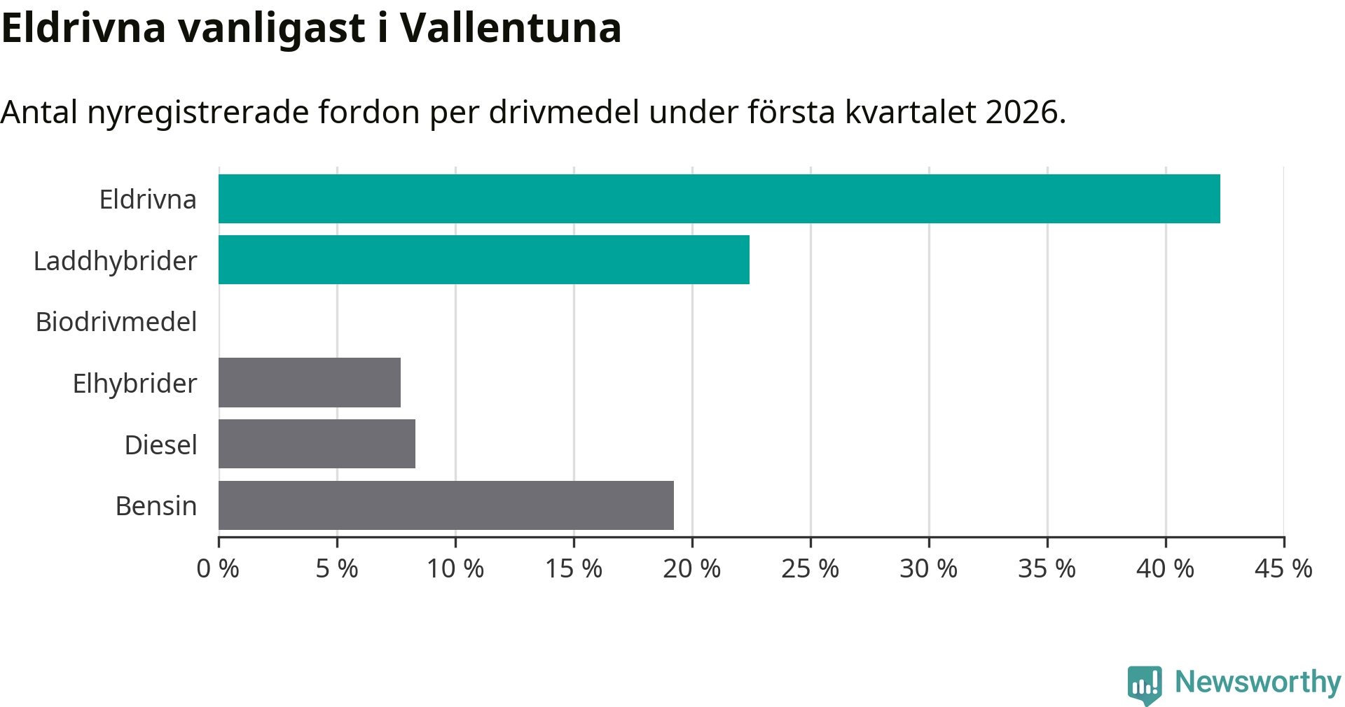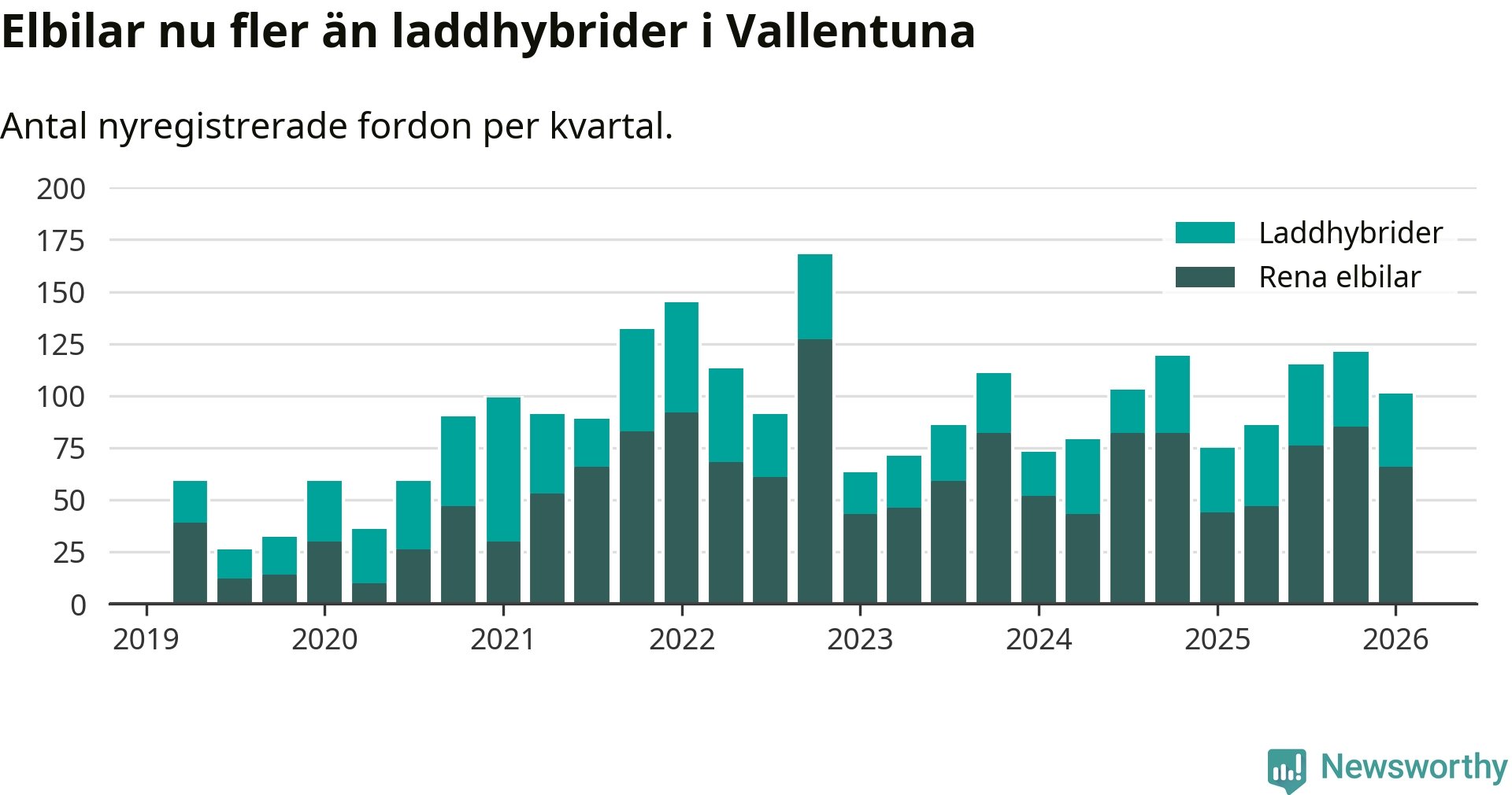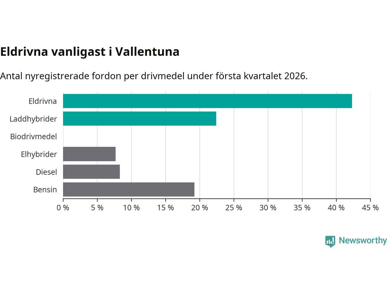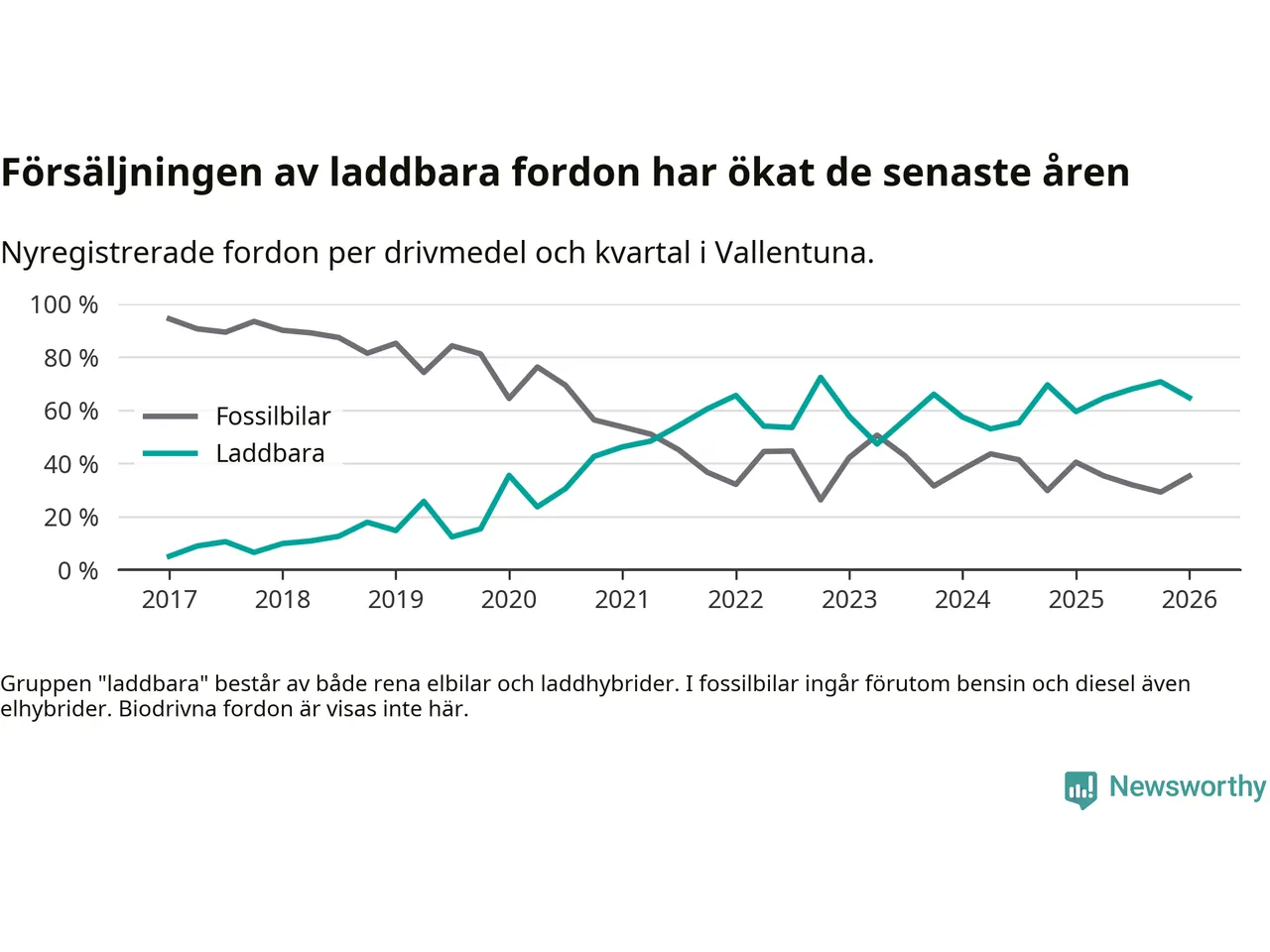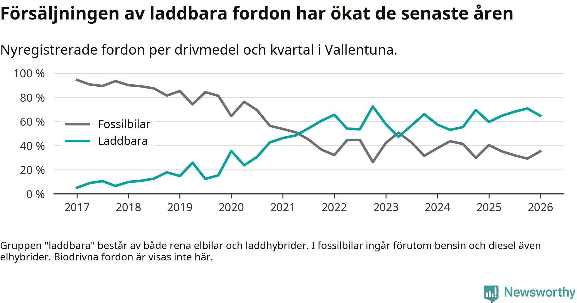 Under första kvartalet 2026 var 65 procent av alla nyregistrerade personbilar i Vallentuna laddbara (sammanlagt registrerades 156 nya bilar). Merparten av de laddbara bilarna var rena elbilar (42 procent av alla).