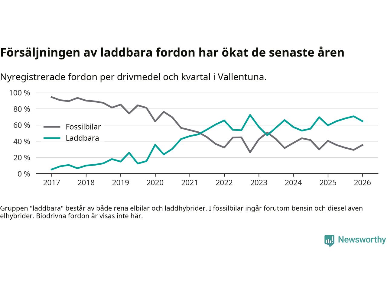 I Vallentuna minskade andelen laddbara bilar under första kvartalet jämfört med kvartalet innan (−6 procentenheter). Nyregistreringen peakade under fjärde kvartalet 2022 då 72 procent av de nya bilarna var laddbara.