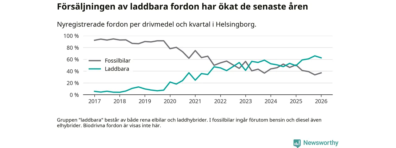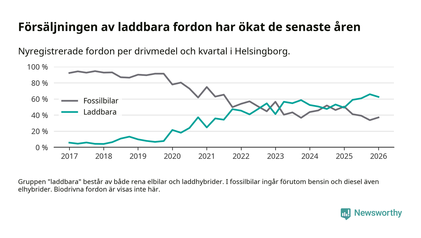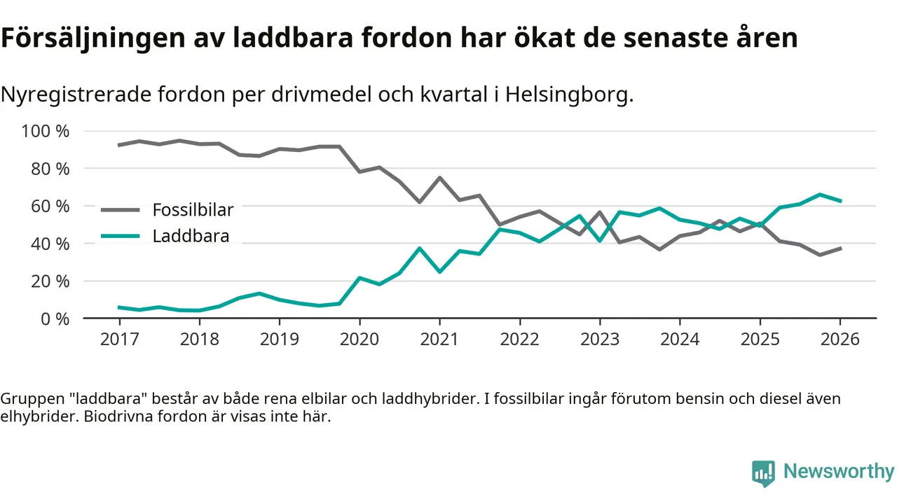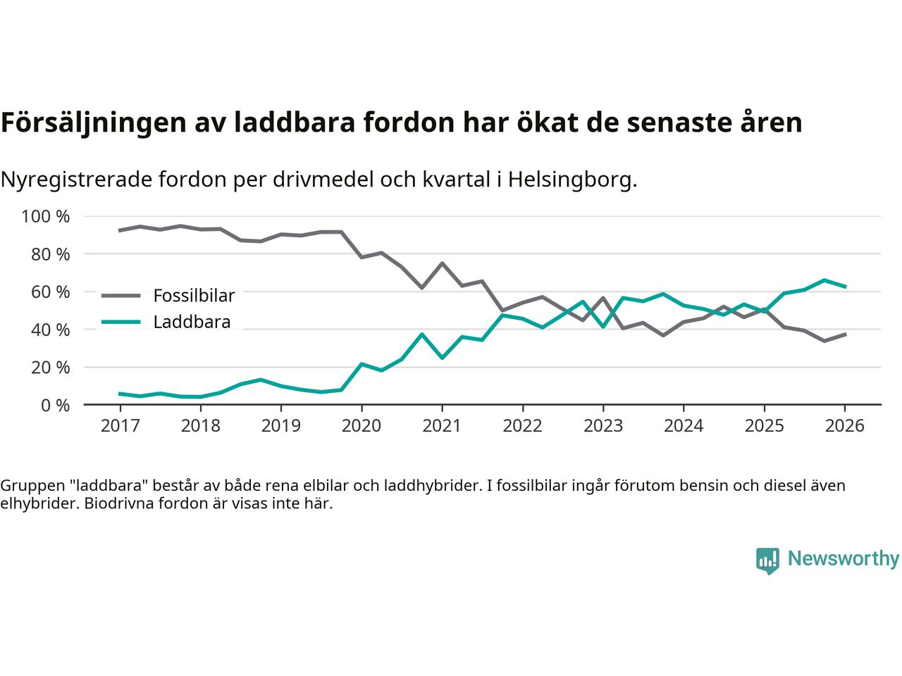 I Helsingborg minskade andelen laddbara bilar under första kvartalet jämfört med kvartalet innan (−3,3 procentenheter). Nyregistreringen peakade under fjärde kvartalet 2025 då 66 procent av de nya bilarna var laddbara.