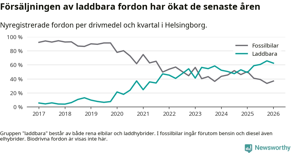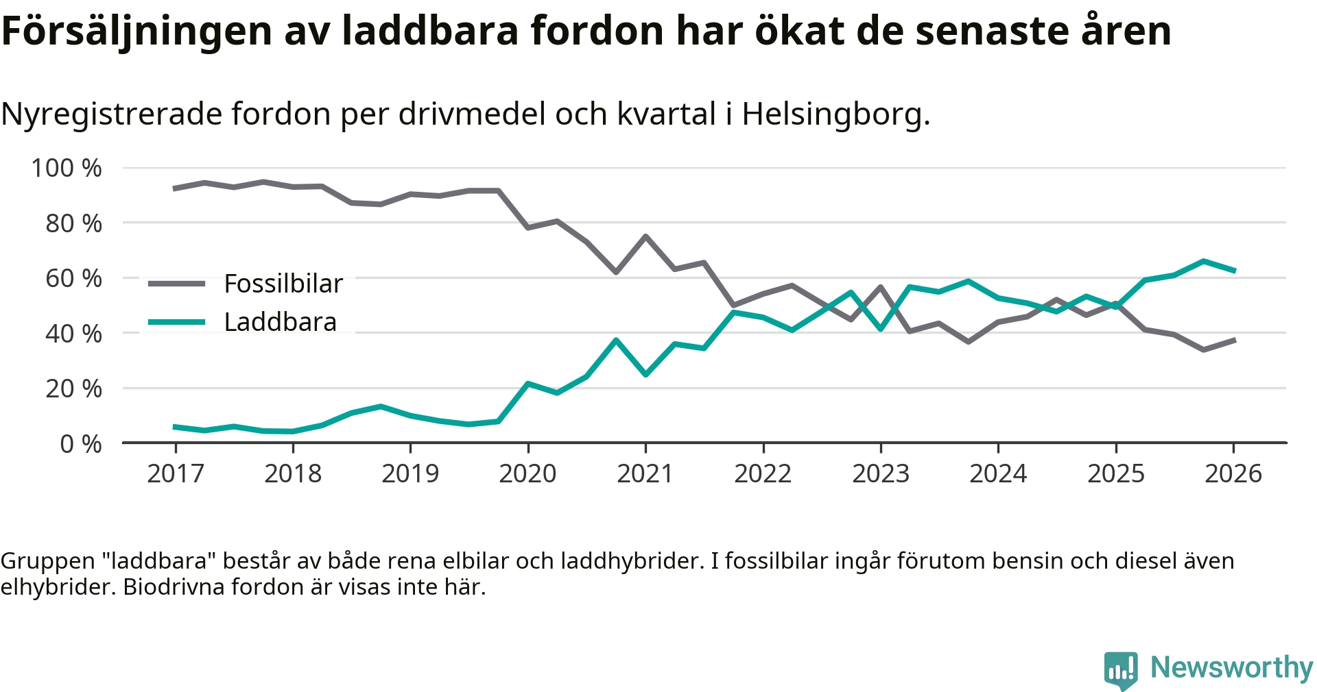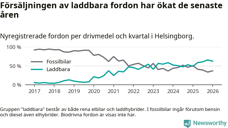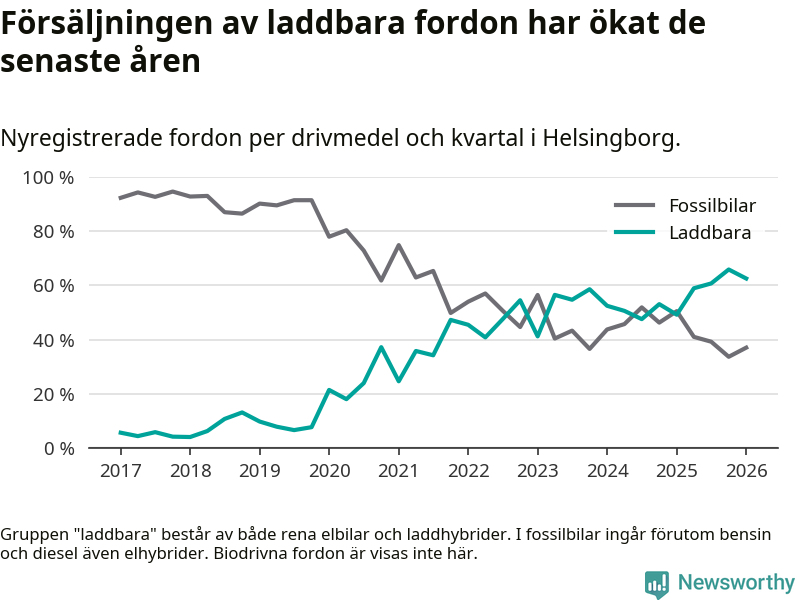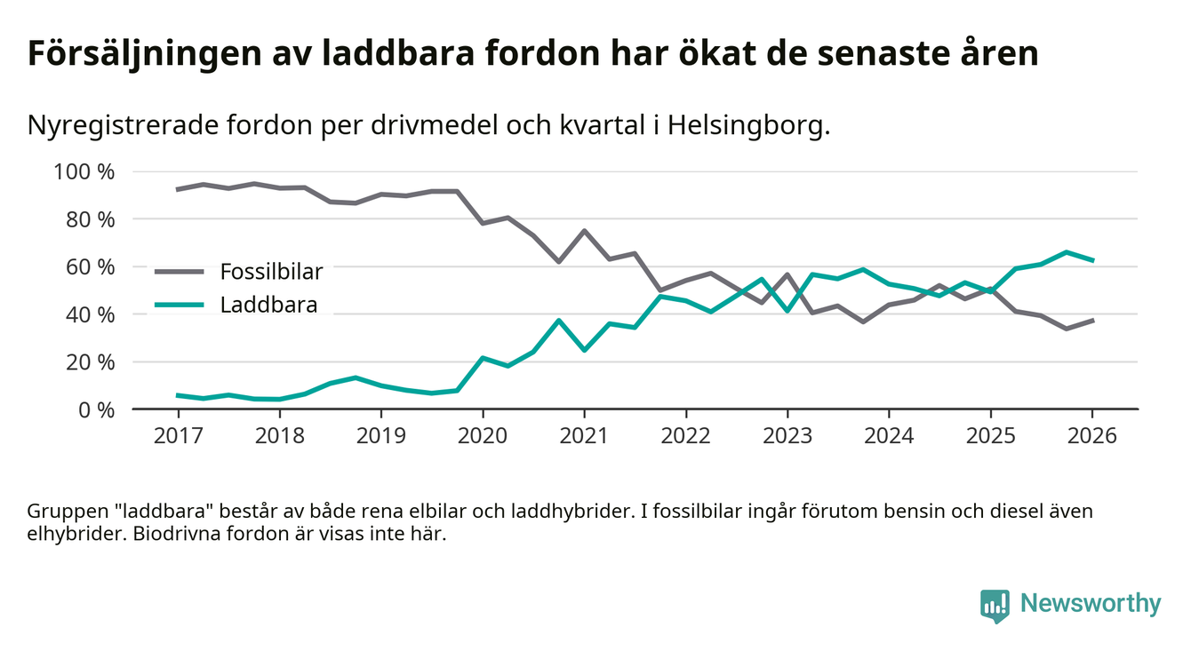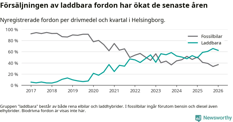 I Helsingborg minskade andelen laddbara bilar under första kvartalet jämfört med kvartalet innan (−3,3 procentenheter). Nyregistreringen peakade under fjärde kvartalet 2025 då 66 procent av de nya bilarna var laddbara.