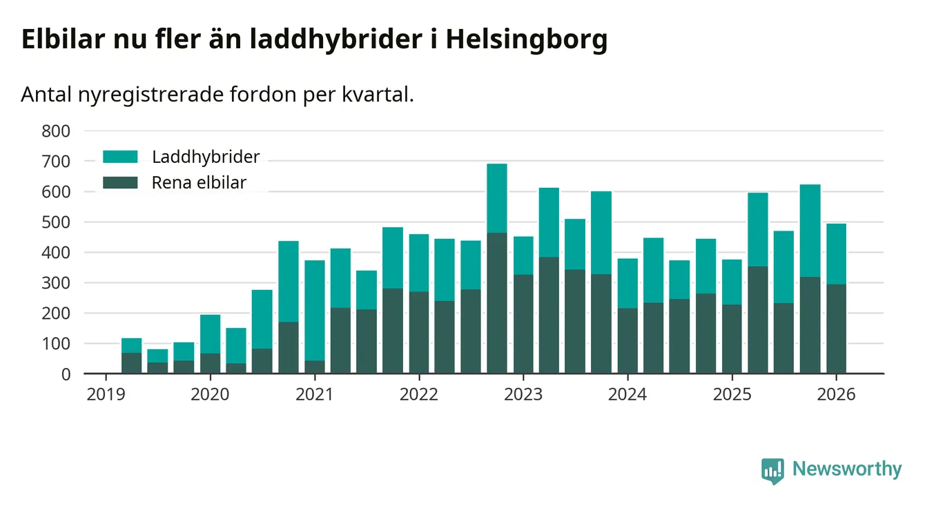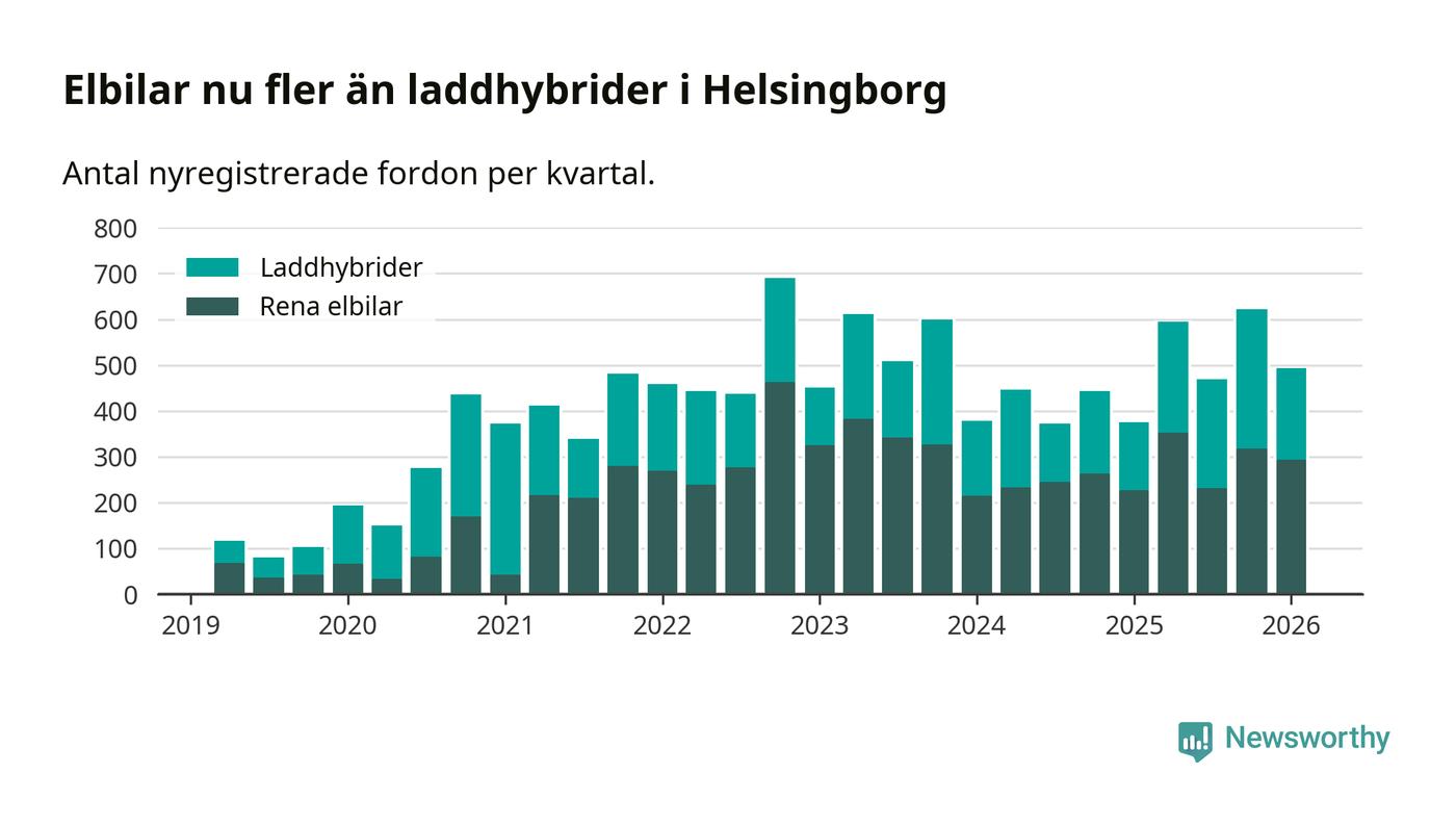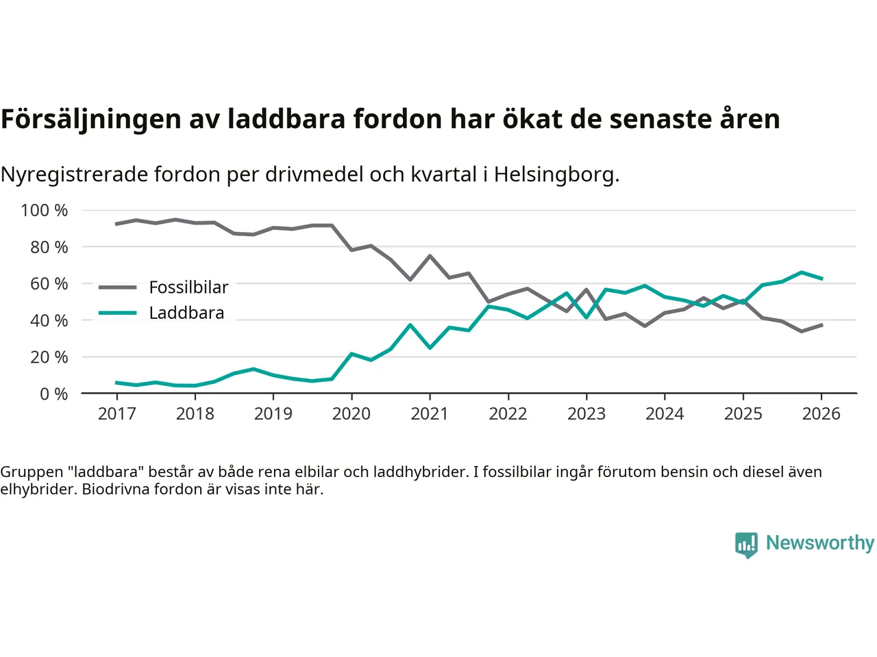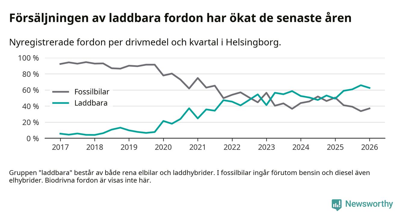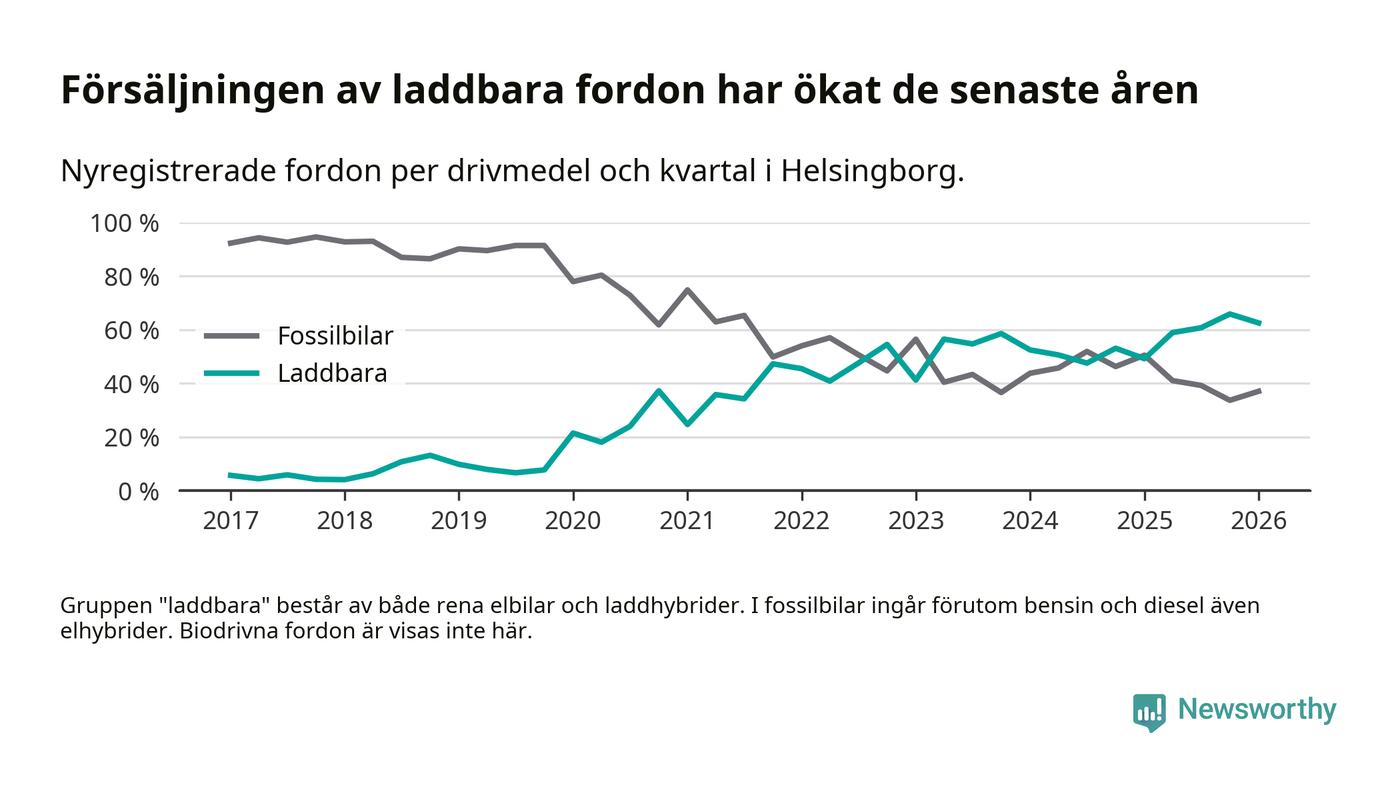 Under första kvartalet 2026 var 63 procent av alla nyregistrerade personbilar i Helsingborg laddbara (sammanlagt registrerades 788 nya bilar). Merparten av de laddbara bilarna var rena elbilar (37 procent av alla).