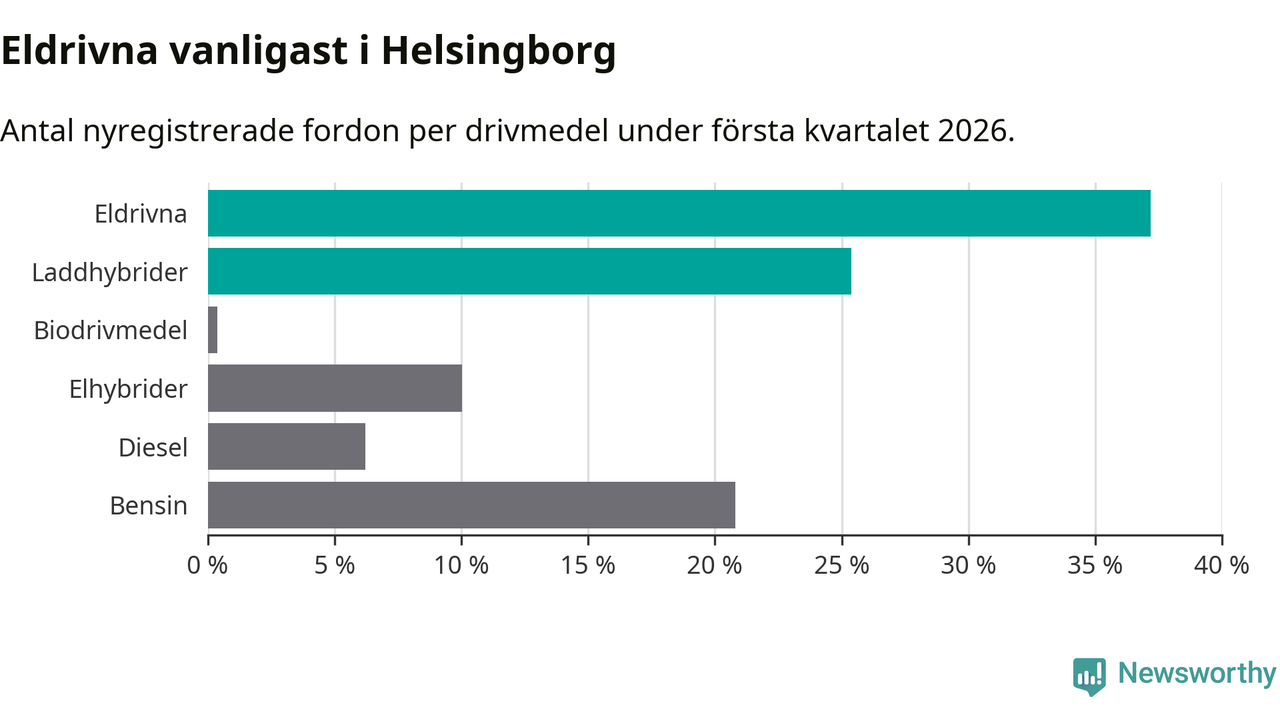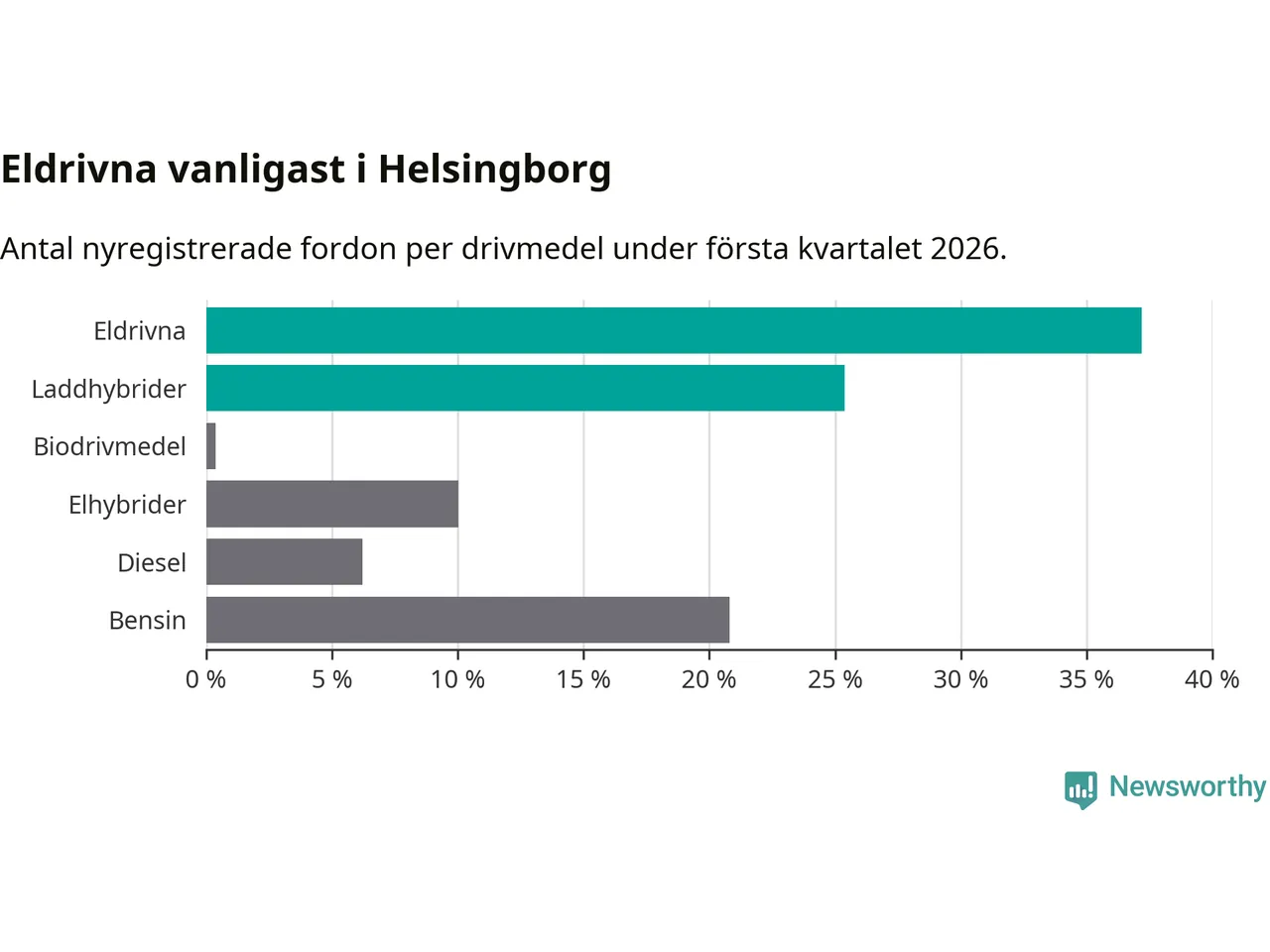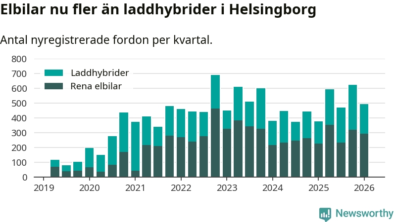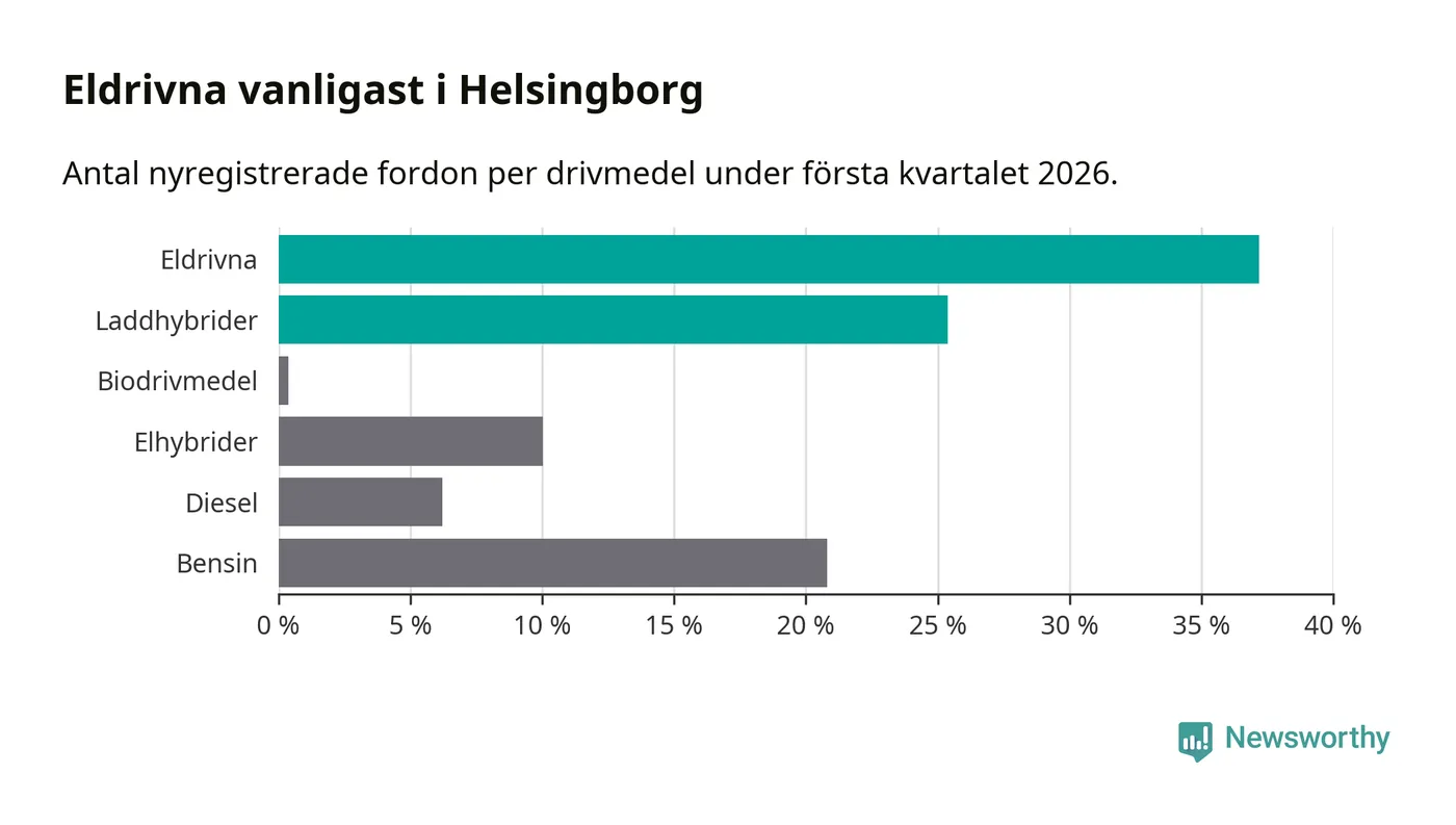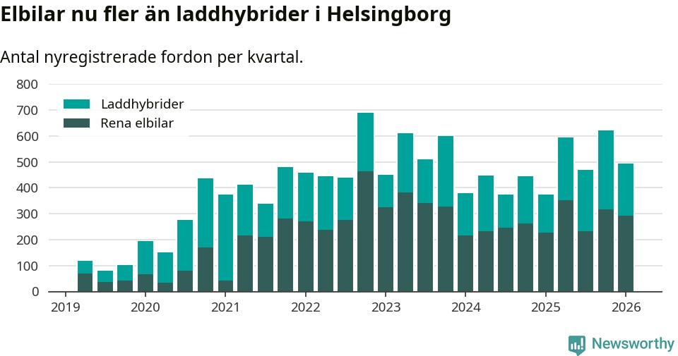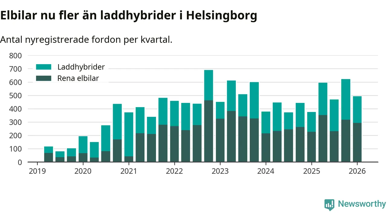 Under första kvartalet 2026 var 63 procent av alla nyregistrerade personbilar i Helsingborg laddbara (sammanlagt registrerades 788 nya bilar). Merparten av de laddbara bilarna var rena elbilar (37 procent av alla).