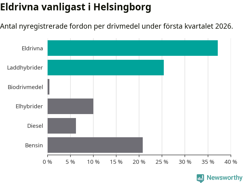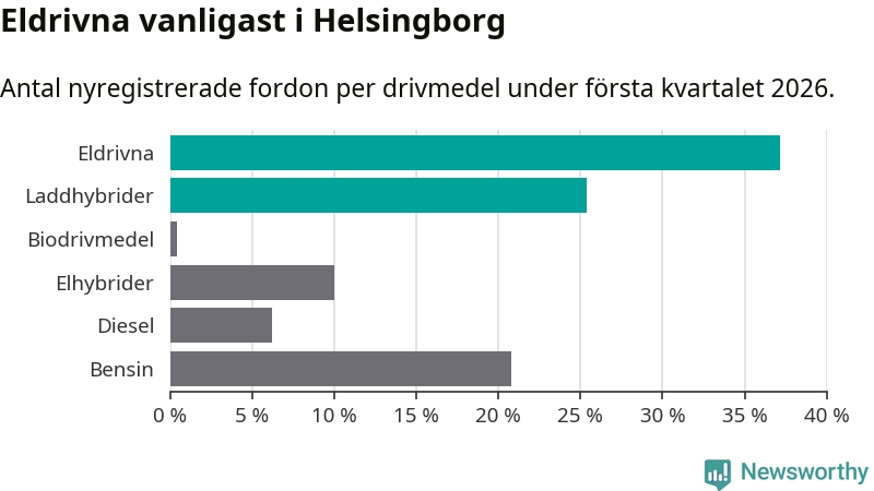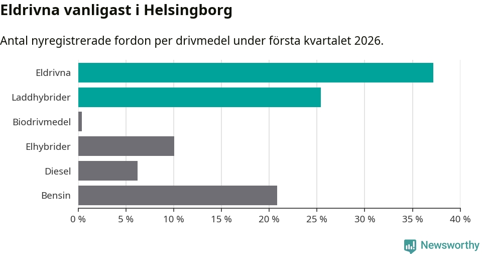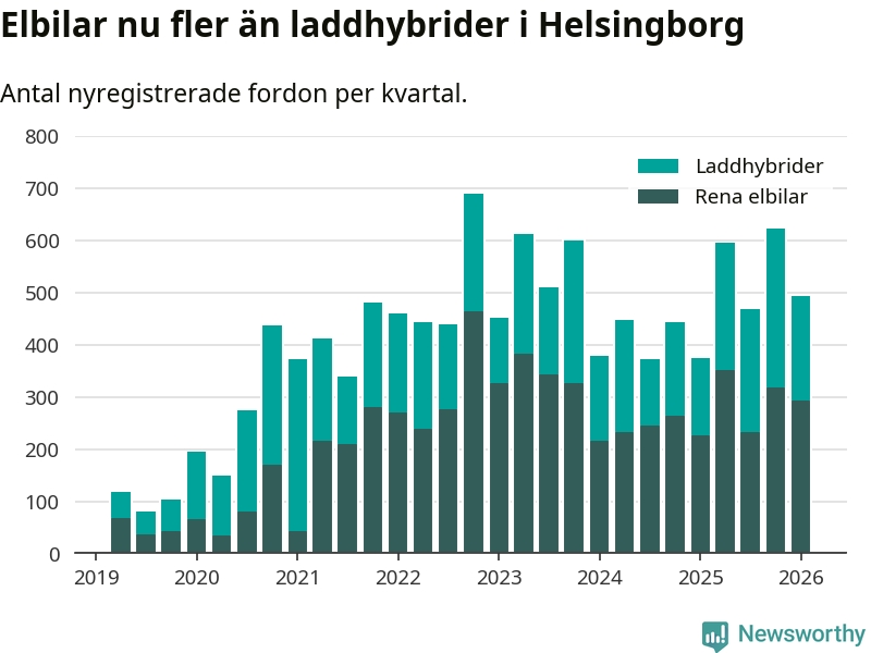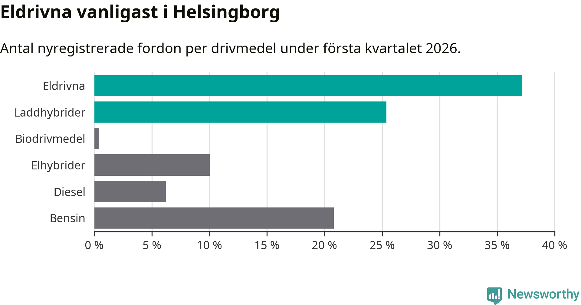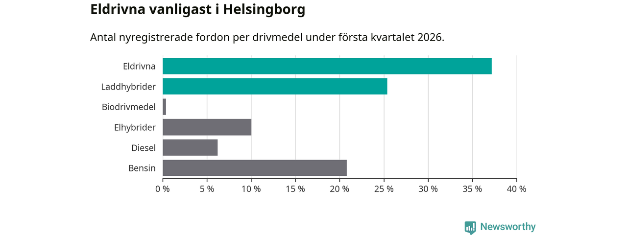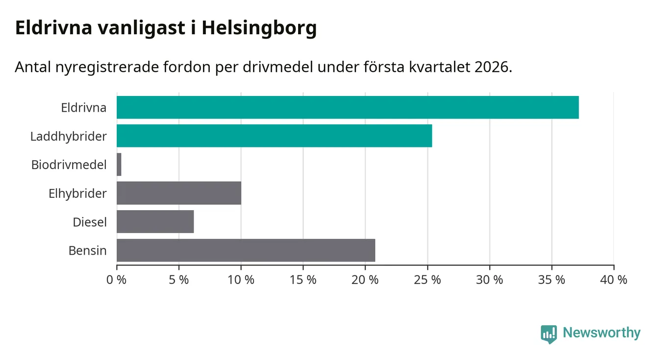 Under första kvartalet 2026 var 63 procent av alla nyregistrerade personbilar i Helsingborg laddbara (sammanlagt registrerades 788 nya bilar). Merparten av de laddbara bilarna var rena elbilar (37 procent av alla).
