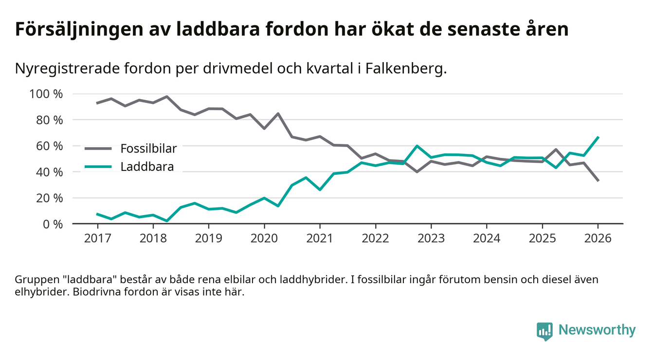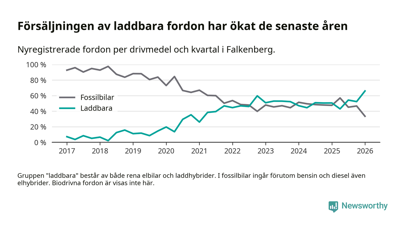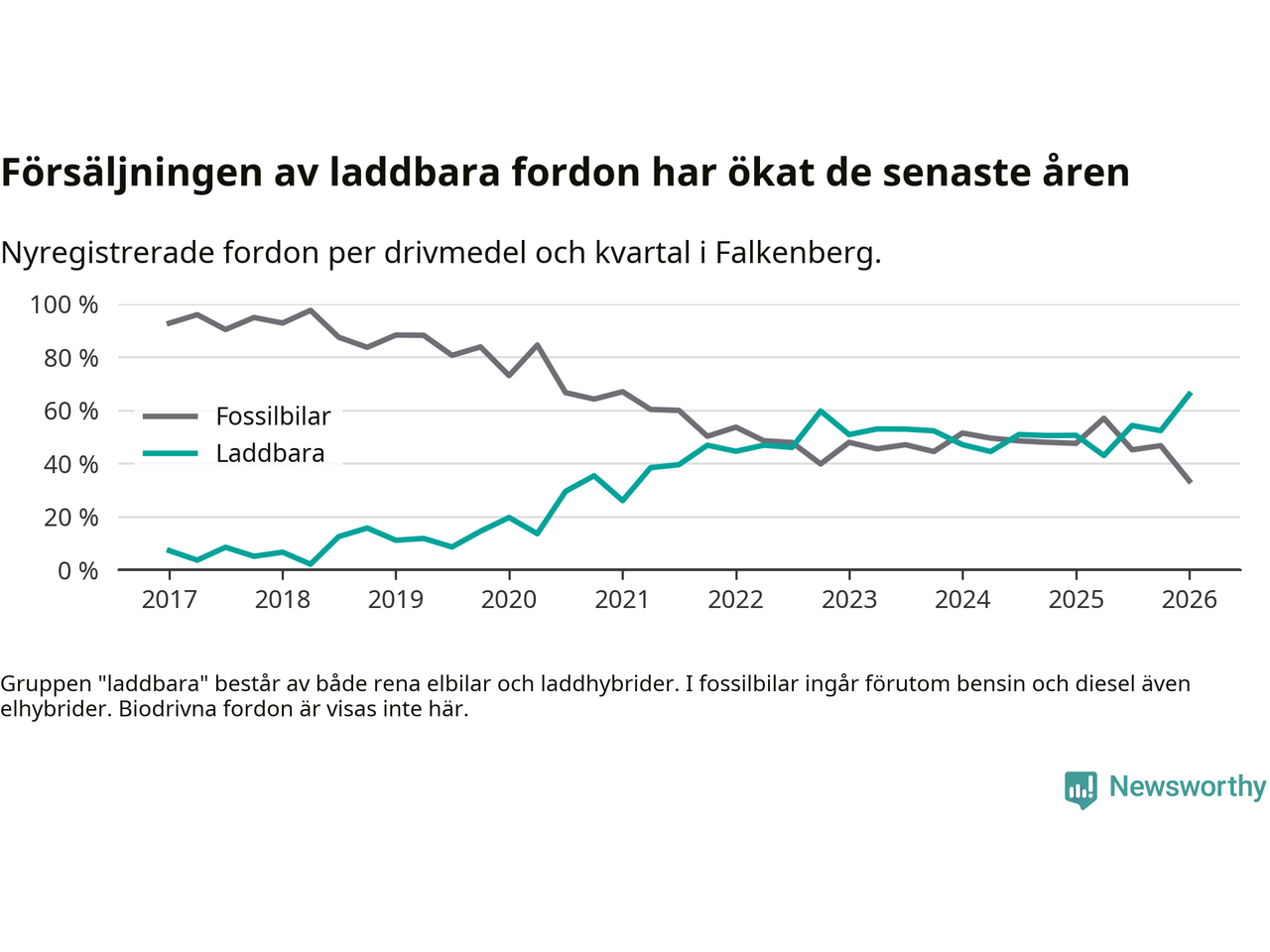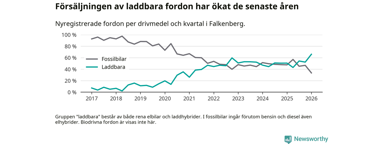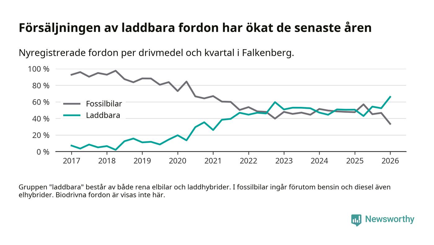 Under första kvartalet 2026 var 66 procent av alla nyregistrerade personbilar i Falkenberg laddbara (sammanlagt registrerades 209 nya bilar). Merparten av de laddbara bilarna var rena elbilar (44 procent av alla).
