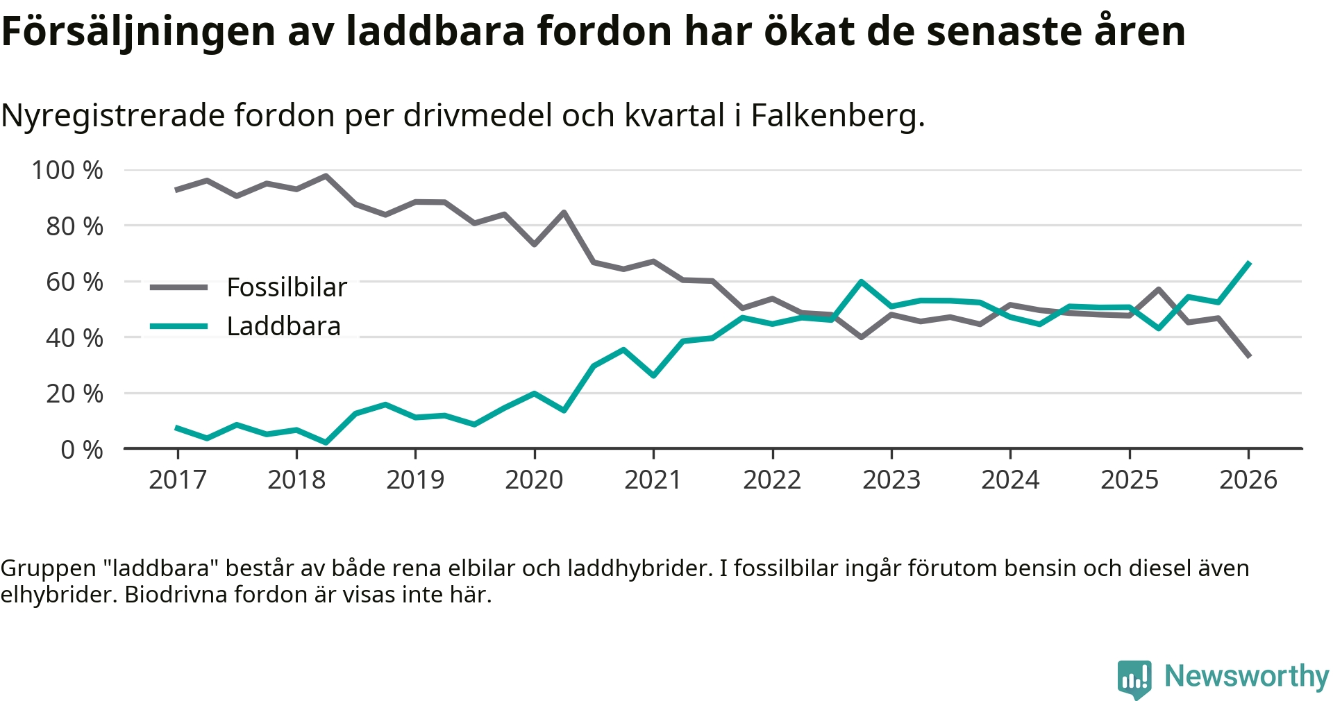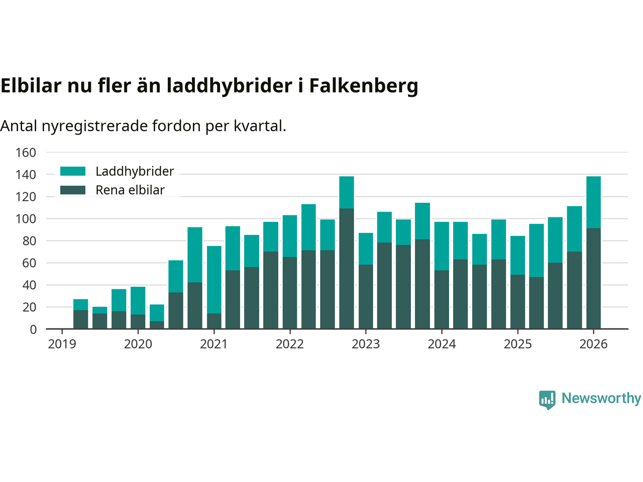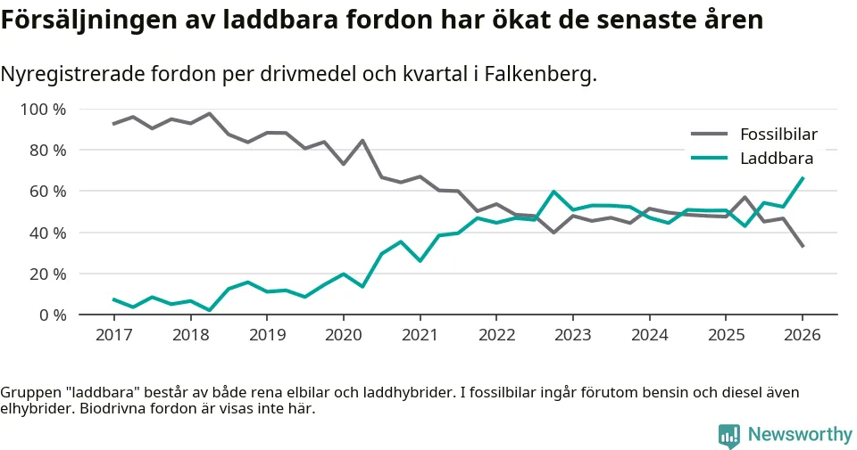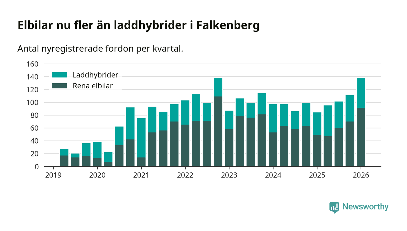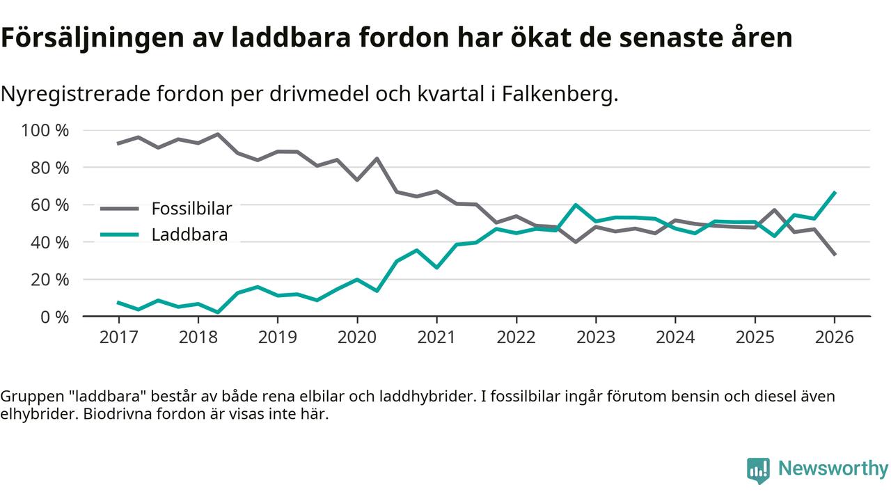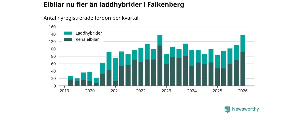 Under första kvartalet 2026 var 66 procent av alla nyregistrerade personbilar i Falkenberg laddbara (sammanlagt registrerades 209 nya bilar). Merparten av de laddbara bilarna var rena elbilar (44 procent av alla).