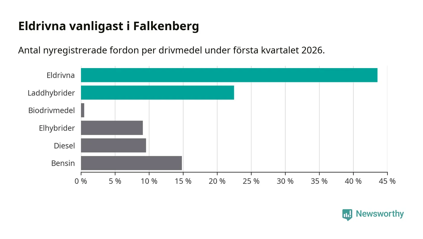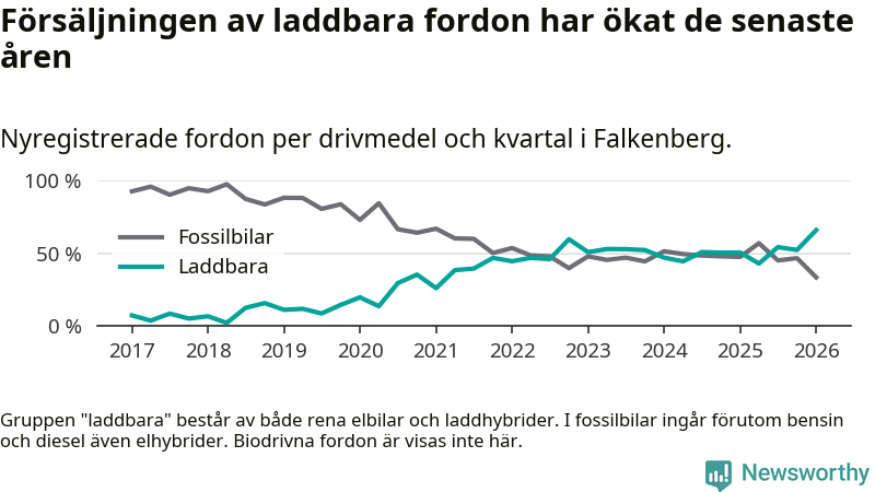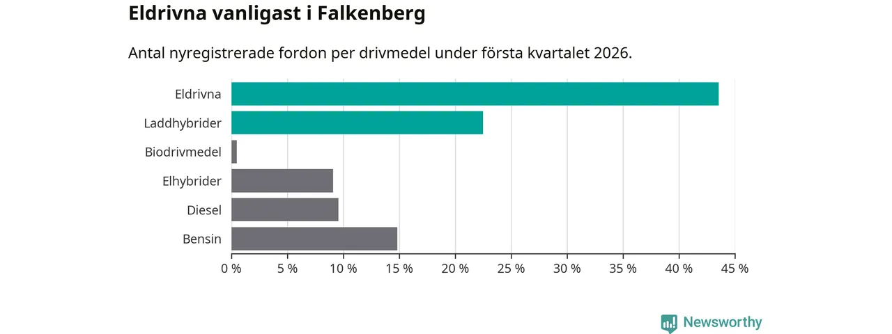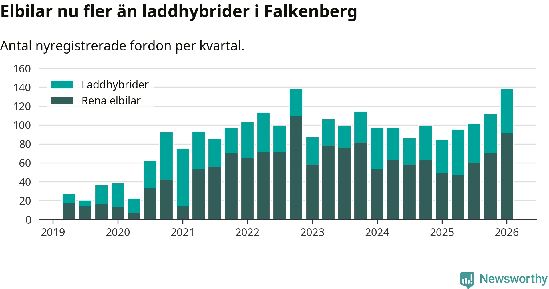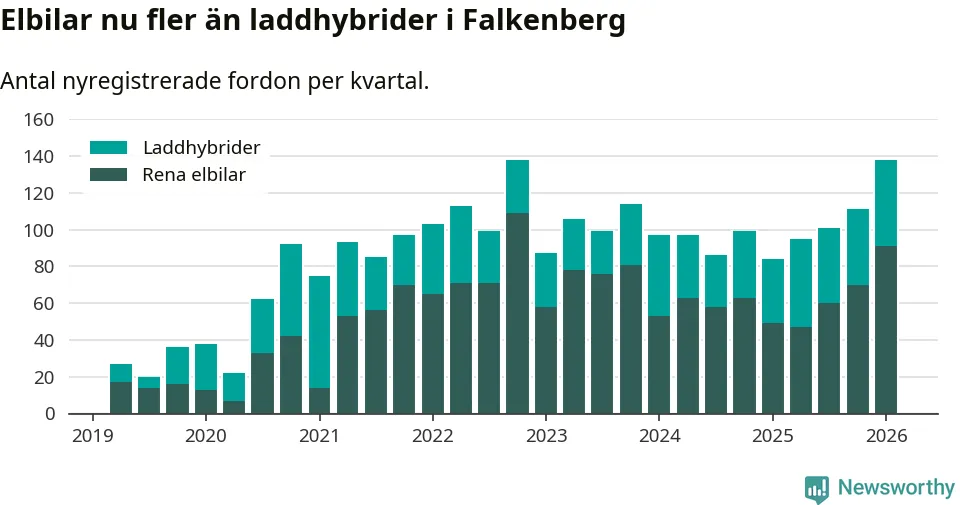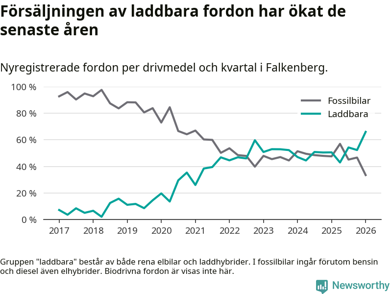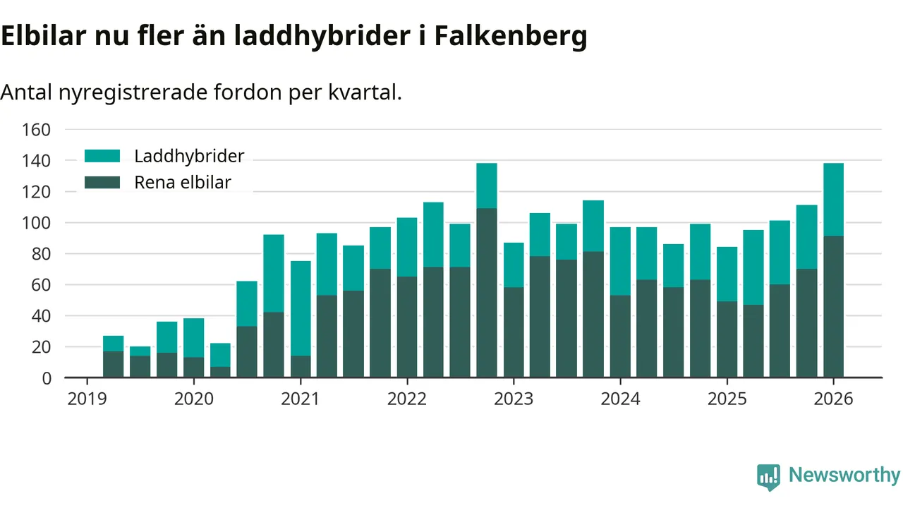 Under första kvartalet 2026 var 66 procent av alla nyregistrerade personbilar i Falkenberg laddbara (sammanlagt registrerades 209 nya bilar). Merparten av de laddbara bilarna var rena elbilar (44 procent av alla).