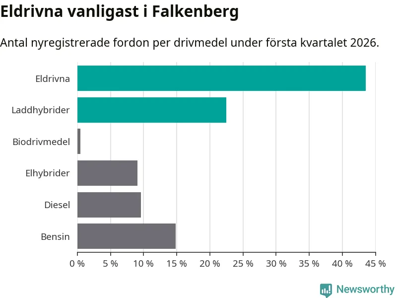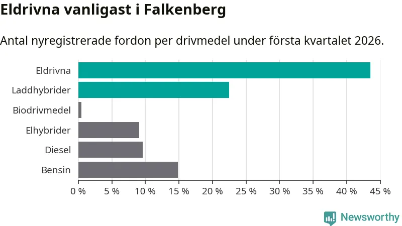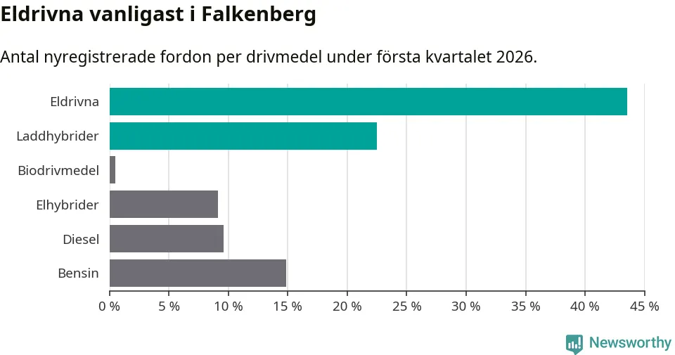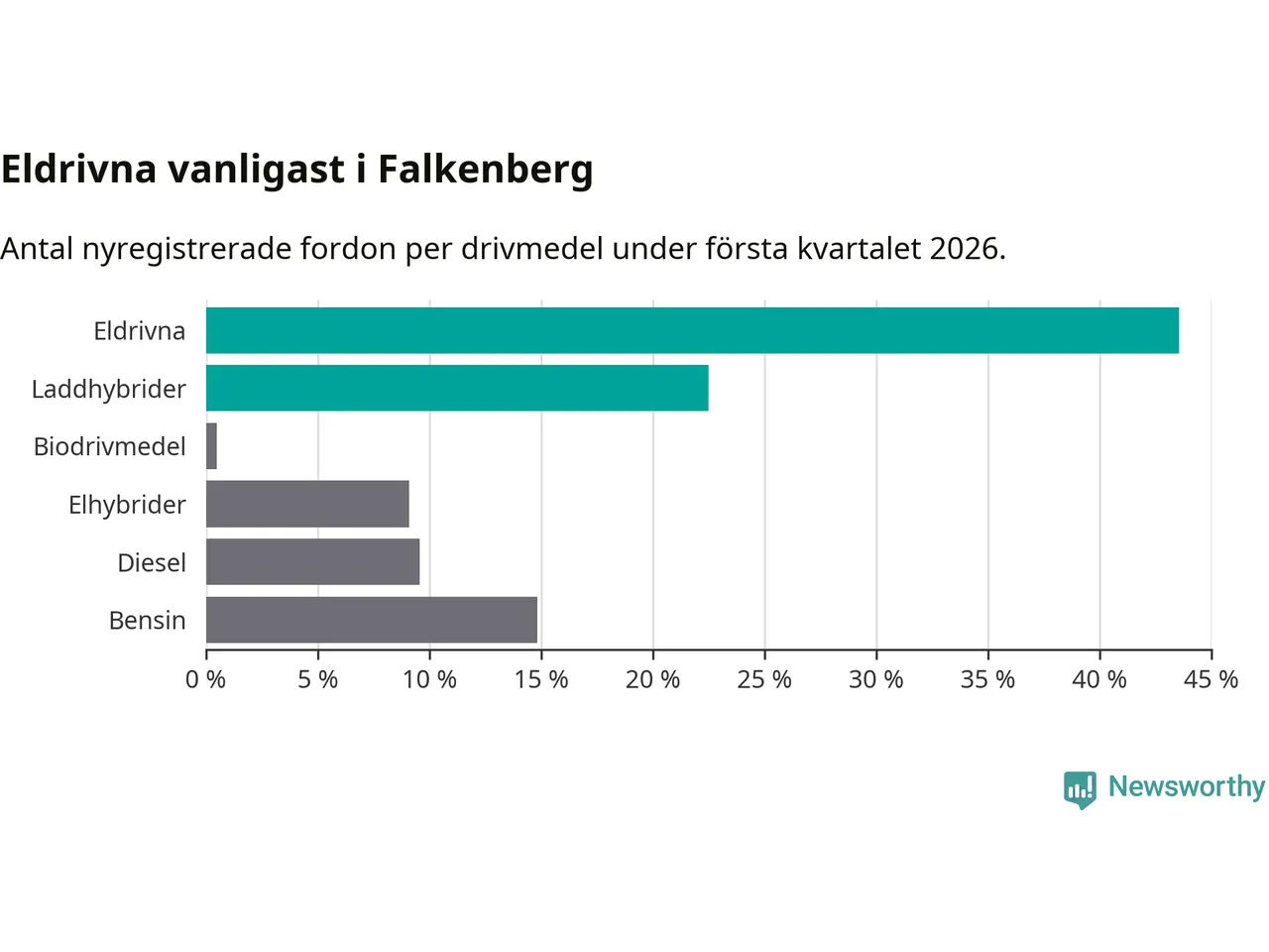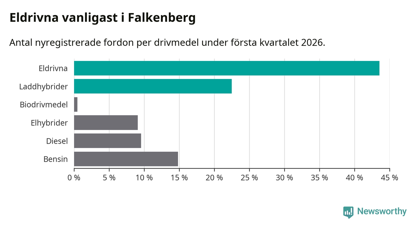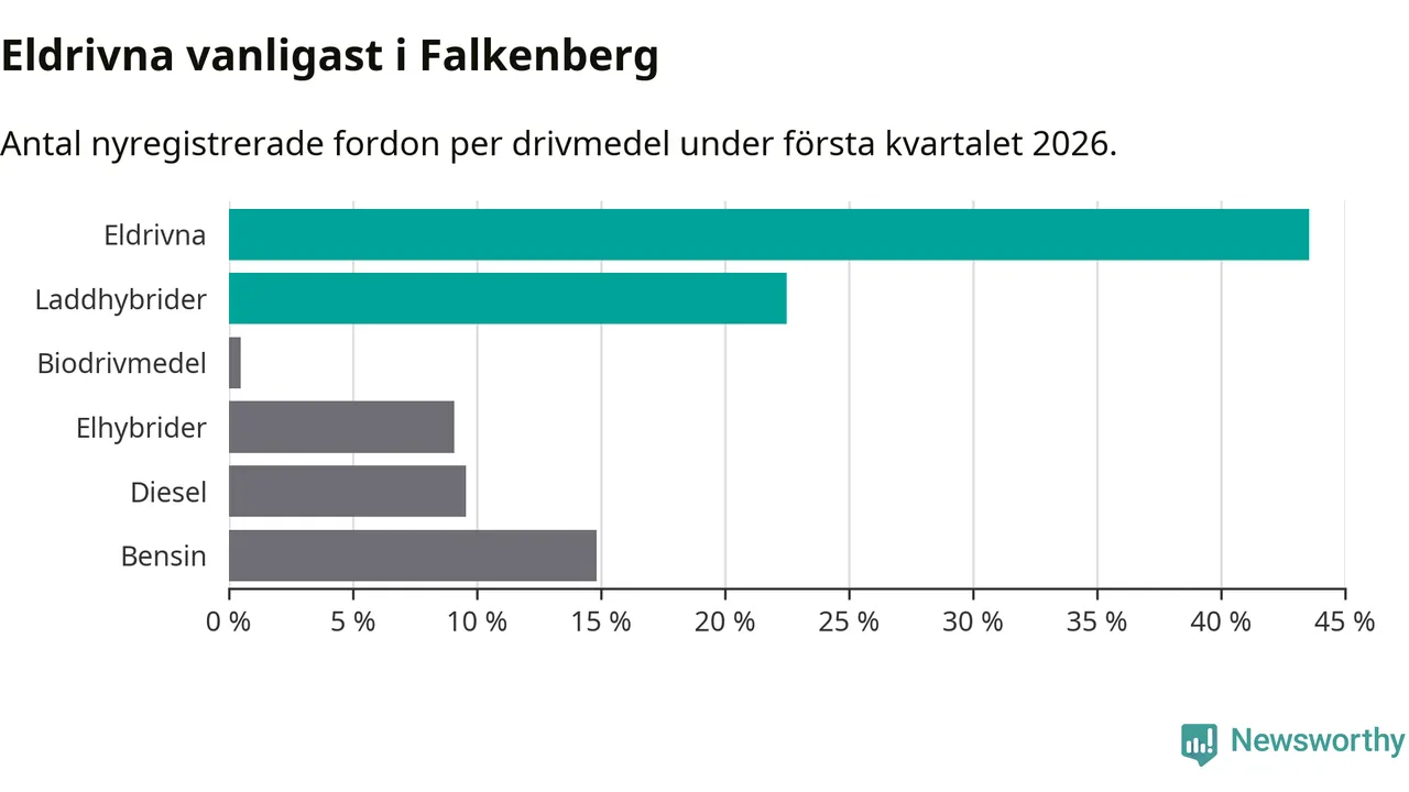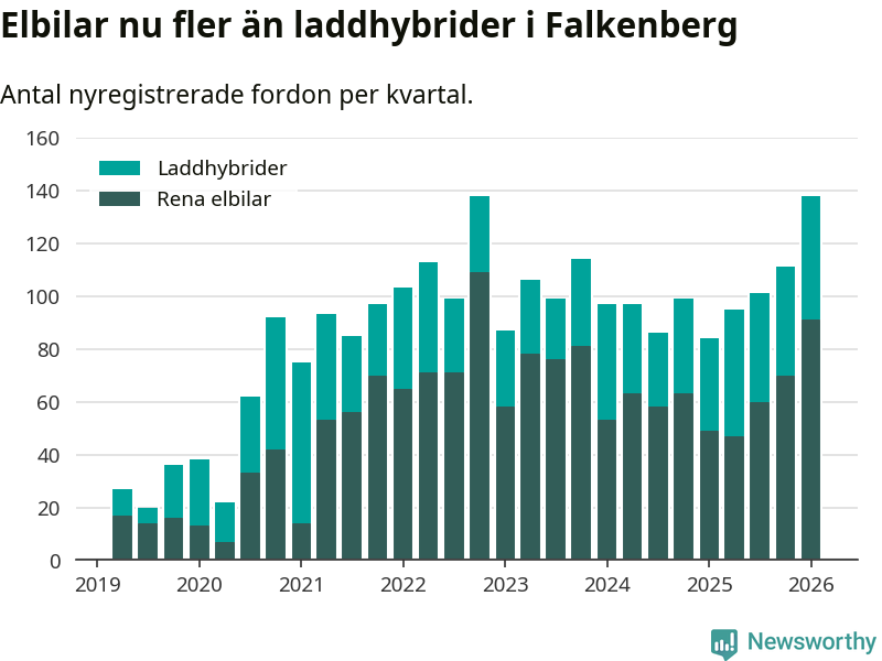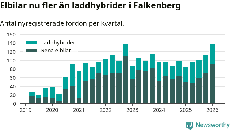 Under första kvartalet 2026 var 66 procent av alla nyregistrerade personbilar i Falkenberg laddbara (sammanlagt registrerades 209 nya bilar). Merparten av de laddbara bilarna var rena elbilar (44 procent av alla).