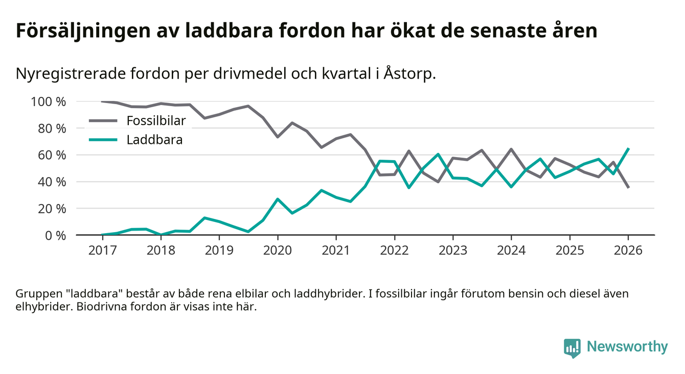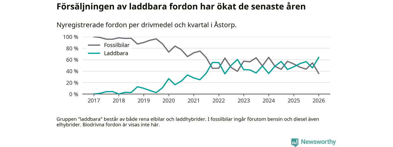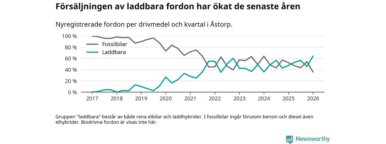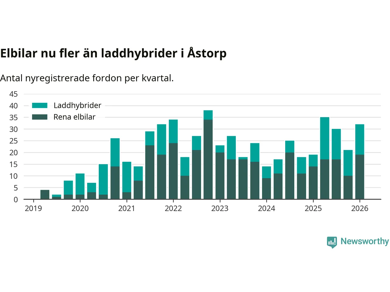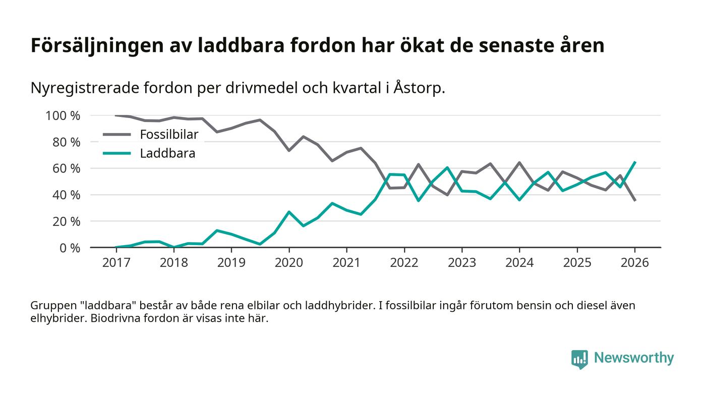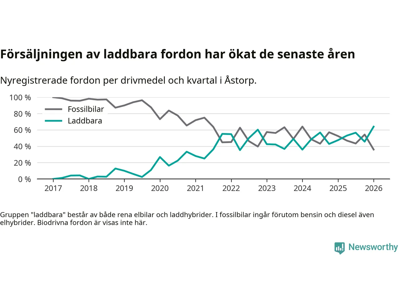 Under första kvartalet 2026 var 64 procent av alla nyregistrerade personbilar i Åstorp laddbara (sammanlagt registrerades 50 nya bilar). Merparten av de laddbara bilarna var rena elbilar (38 procent av alla).