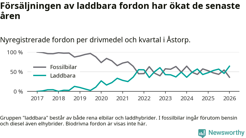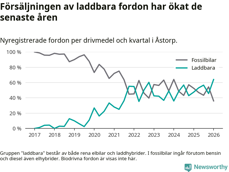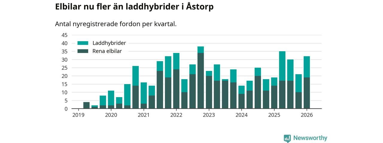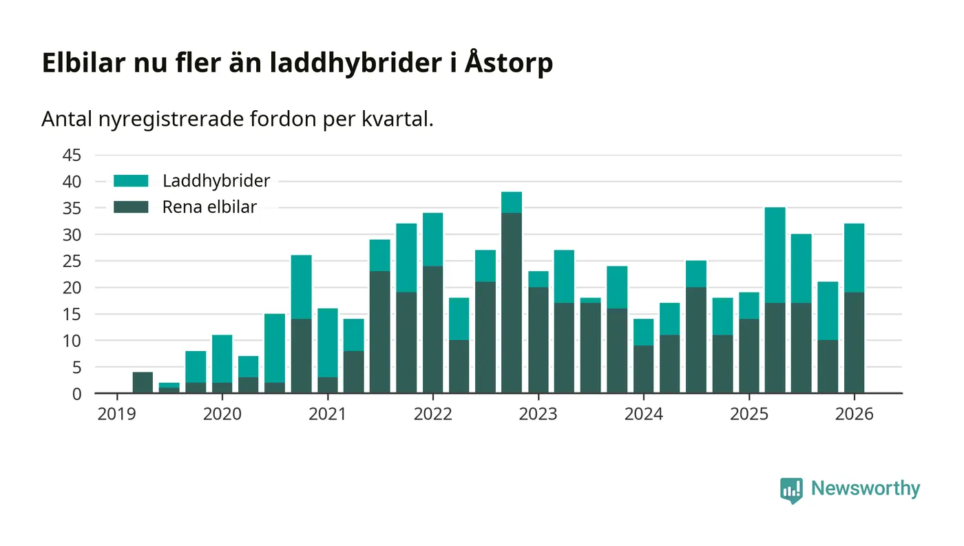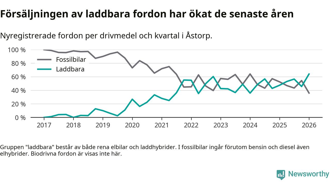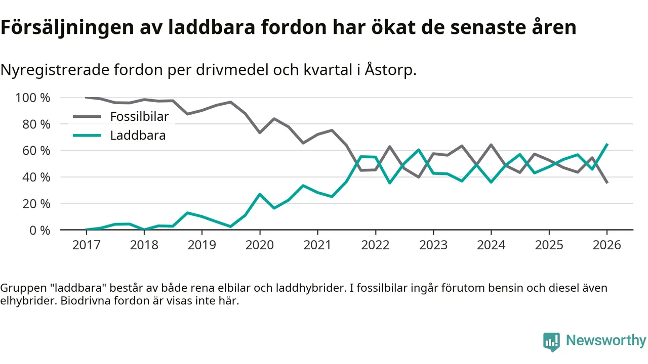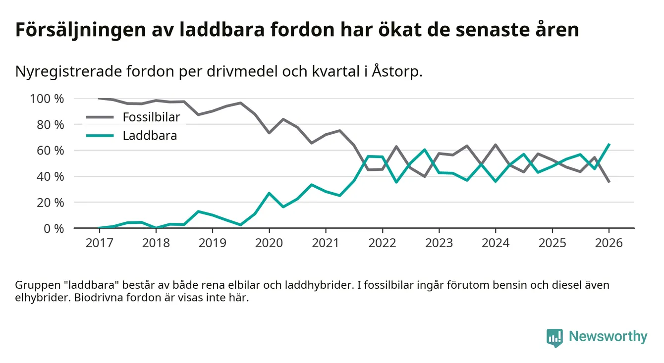Under första kvartalet 2026 var 64 procent av alla nyregistrerade personbilar i Åstorp laddbara (sammanlagt registrerades 50 nya bilar). Merparten av de laddbara bilarna var rena elbilar (38 procent av alla).