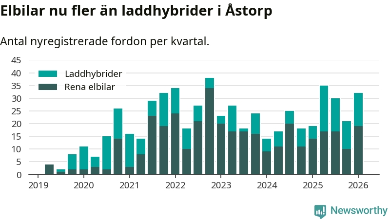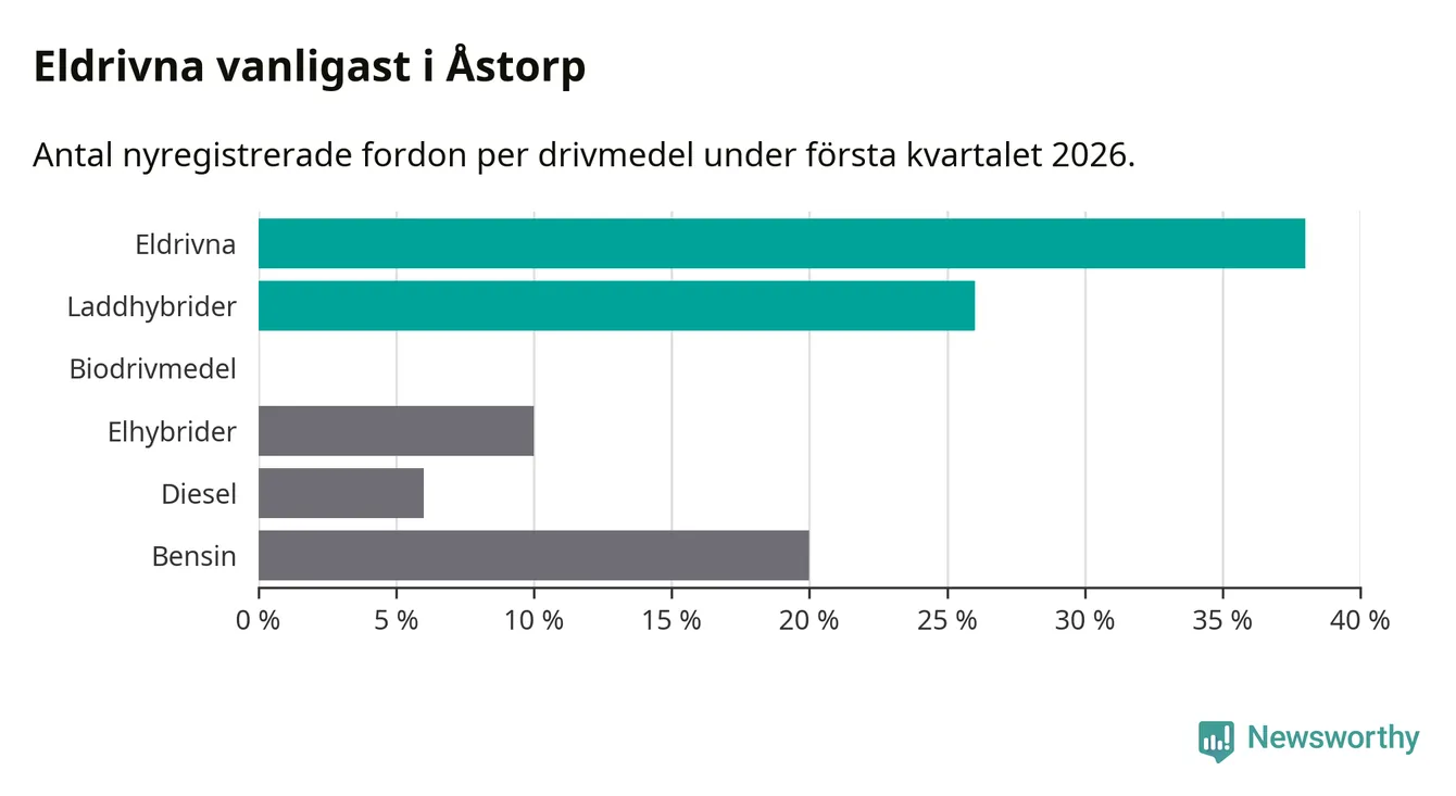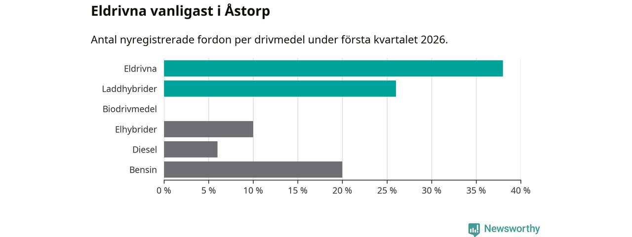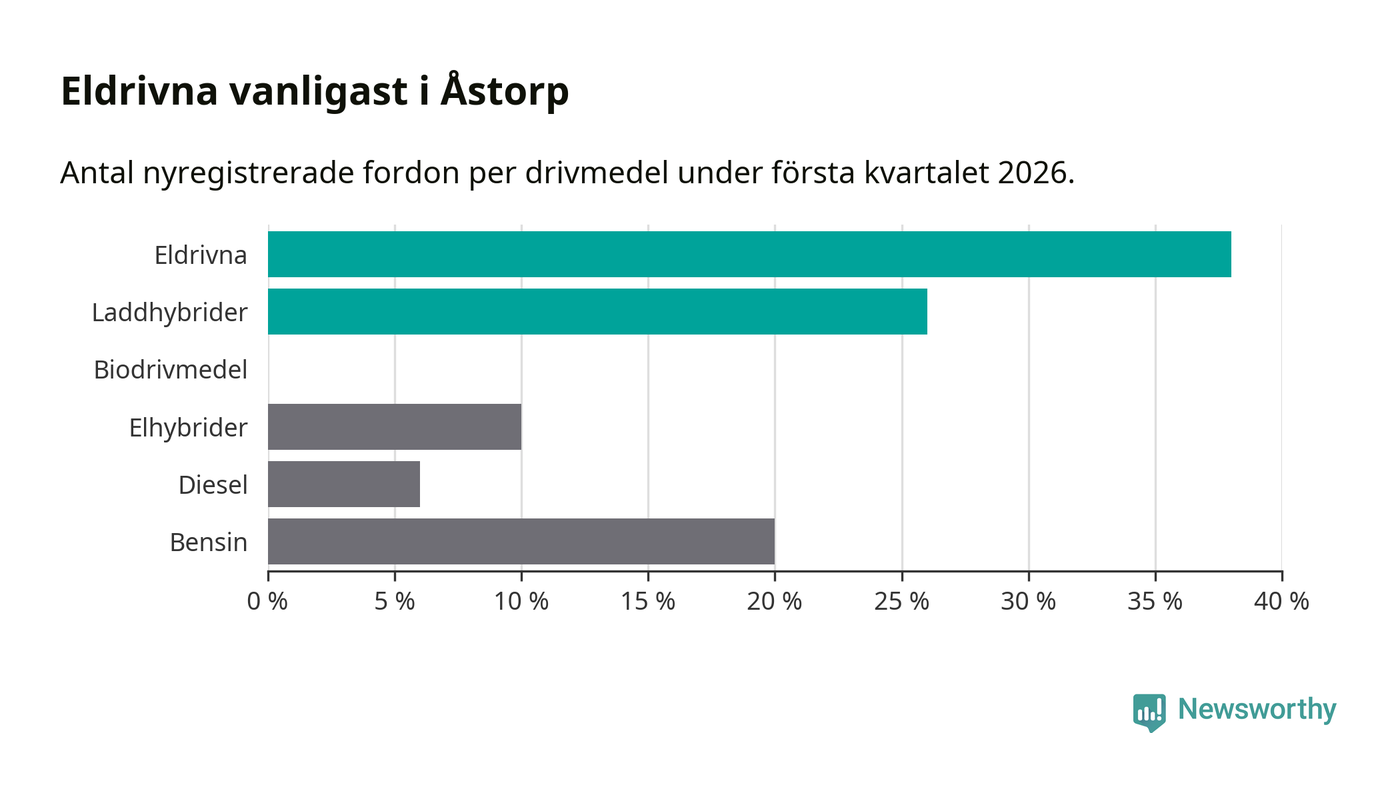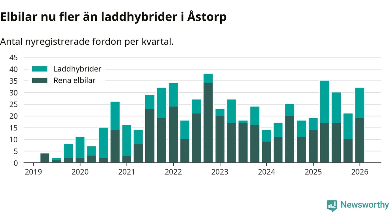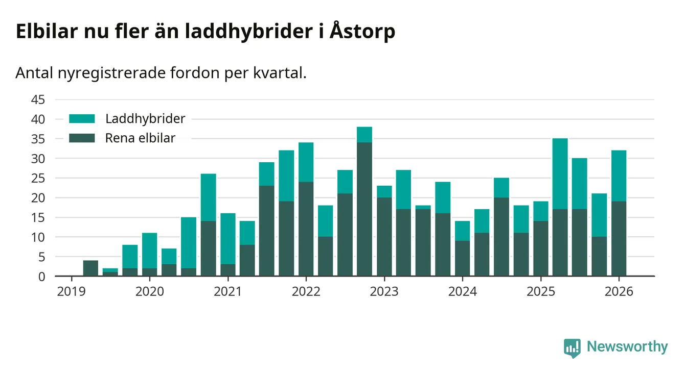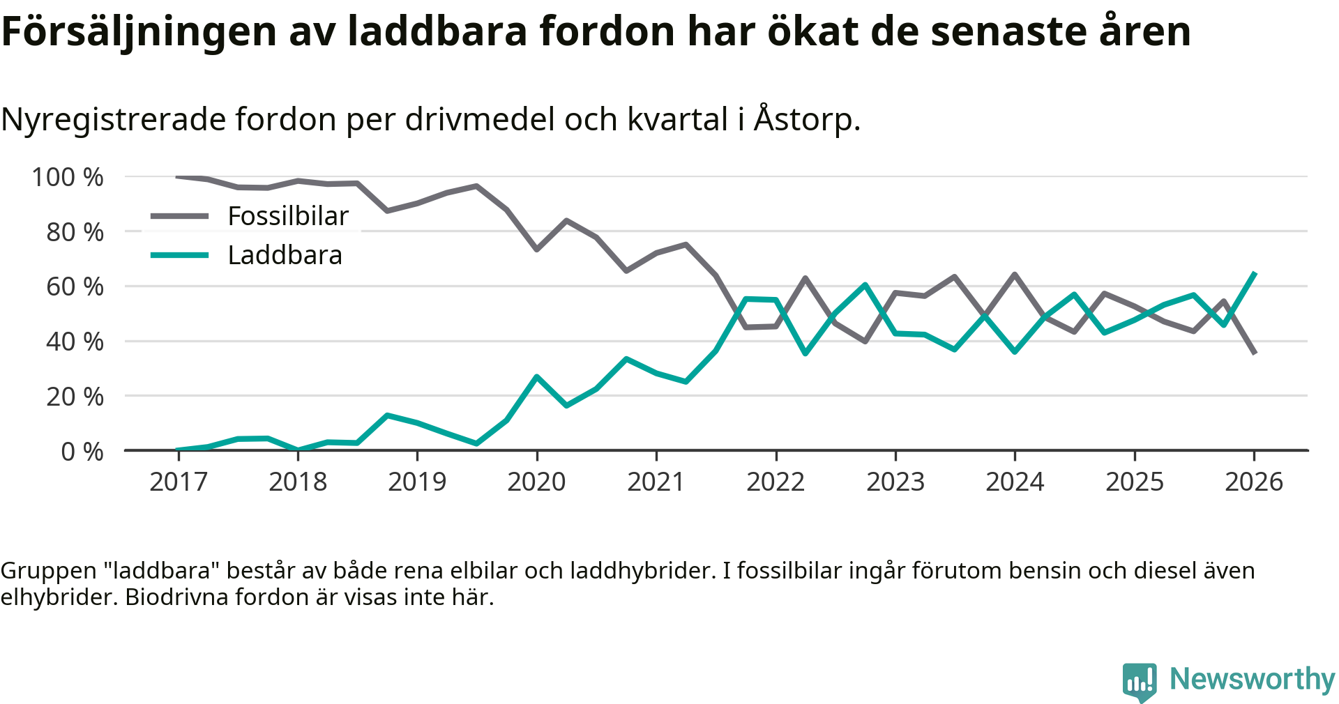 Under första kvartalet 2026 var 64 procent av alla nyregistrerade personbilar i Åstorp laddbara (sammanlagt registrerades 50 nya bilar). Merparten av de laddbara bilarna var rena elbilar (38 procent av alla).