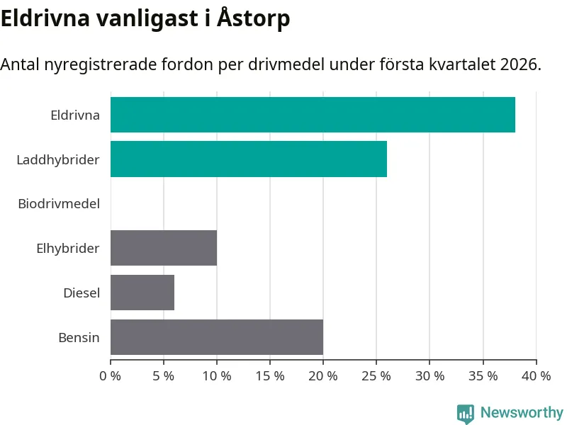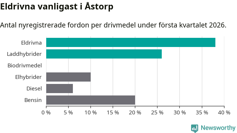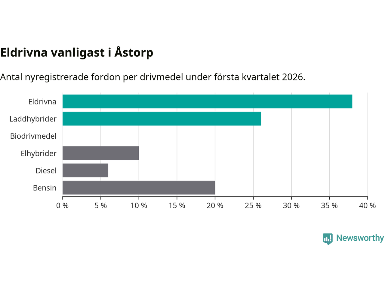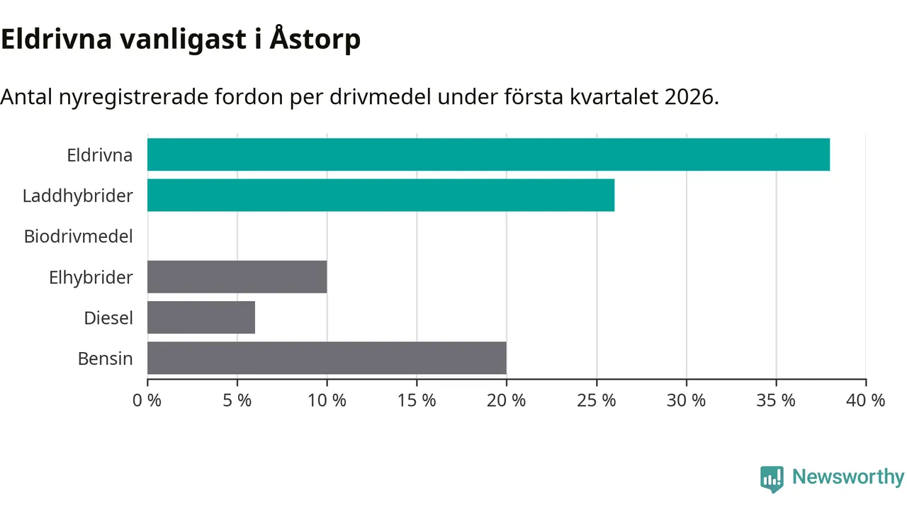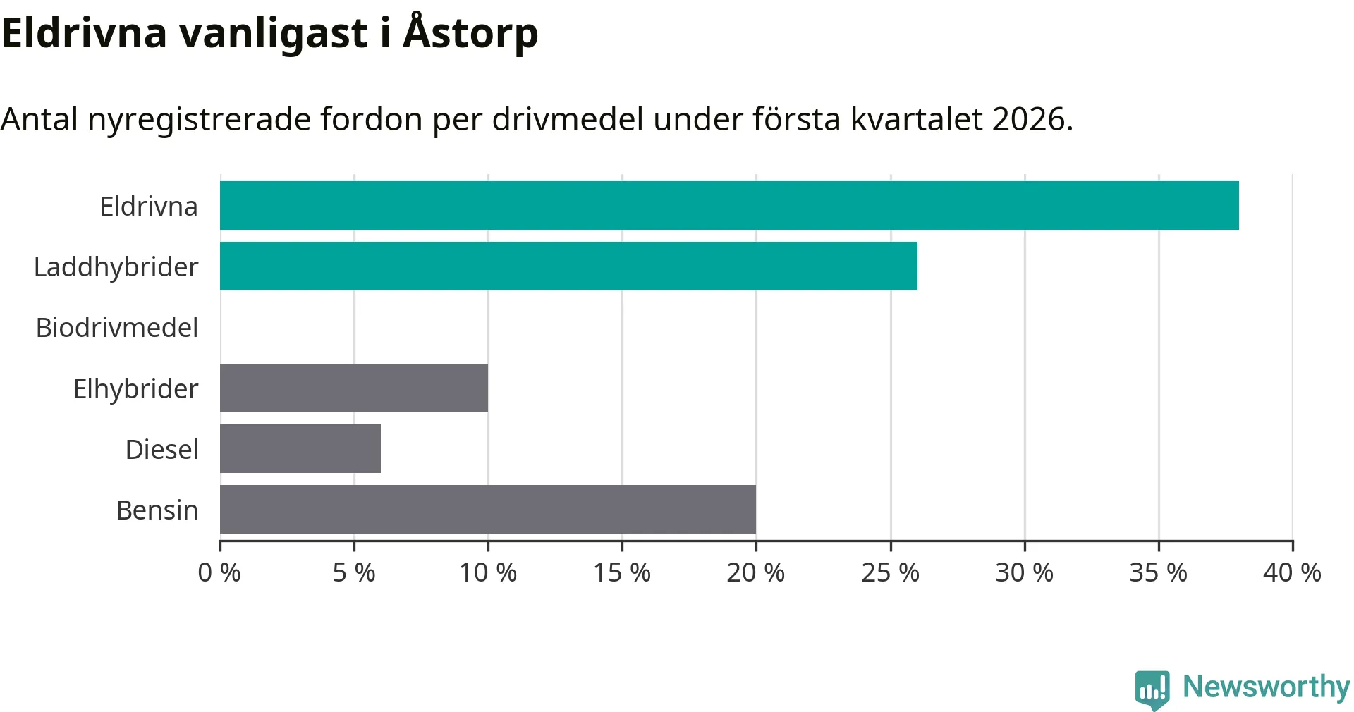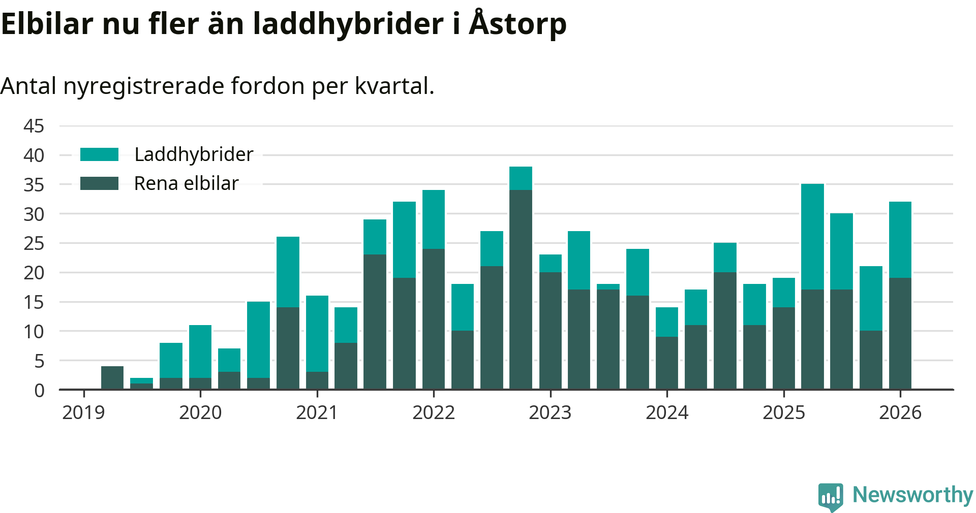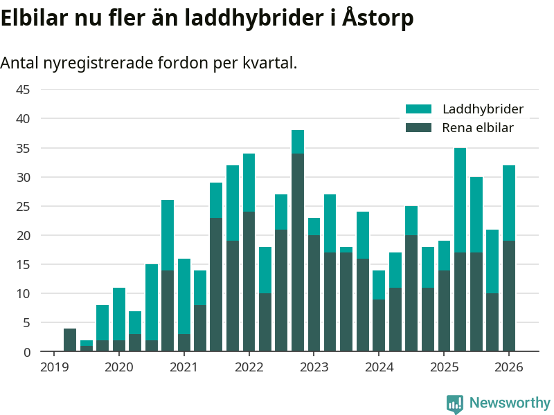 Under första kvartalet 2026 var 64 procent av alla nyregistrerade personbilar i Åstorp laddbara (sammanlagt registrerades 50 nya bilar). Merparten av de laddbara bilarna var rena elbilar (38 procent av alla).