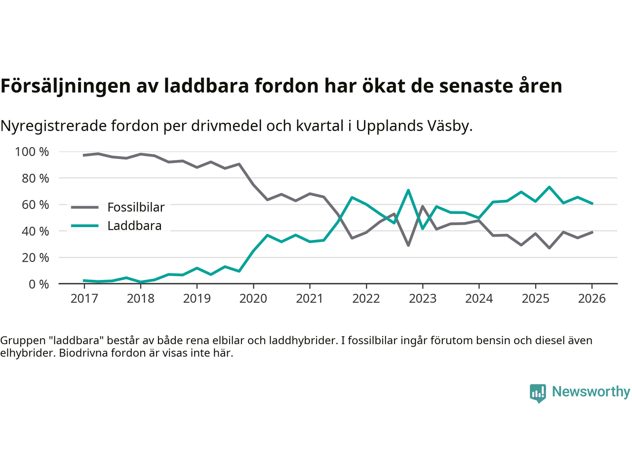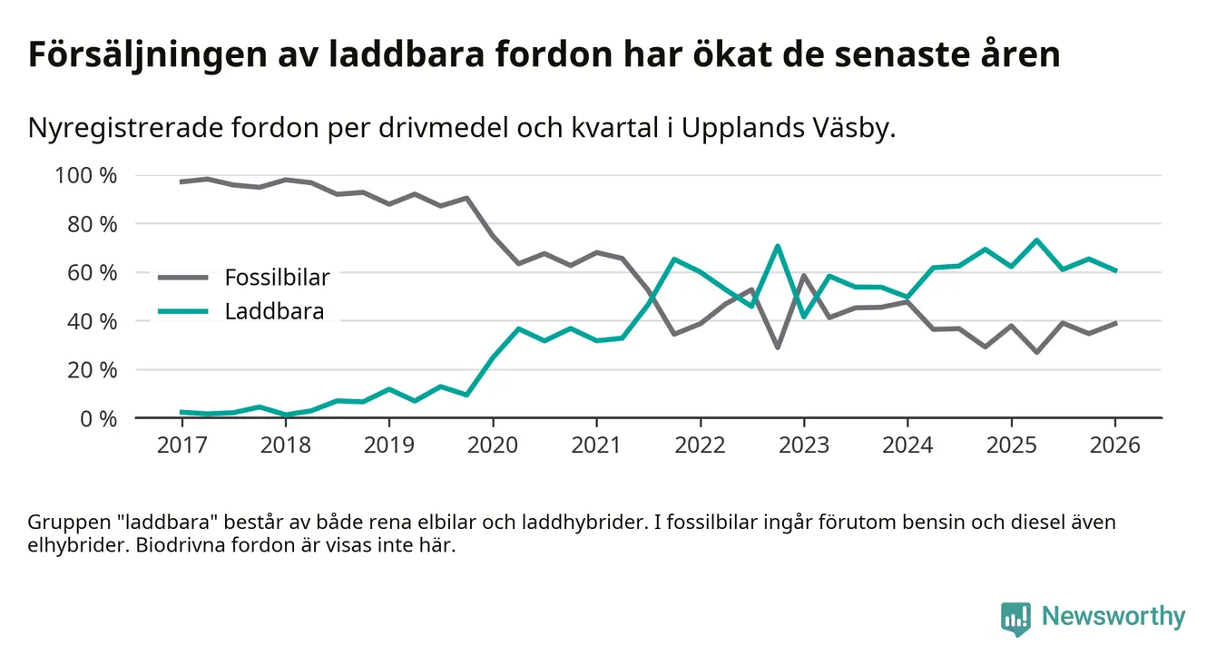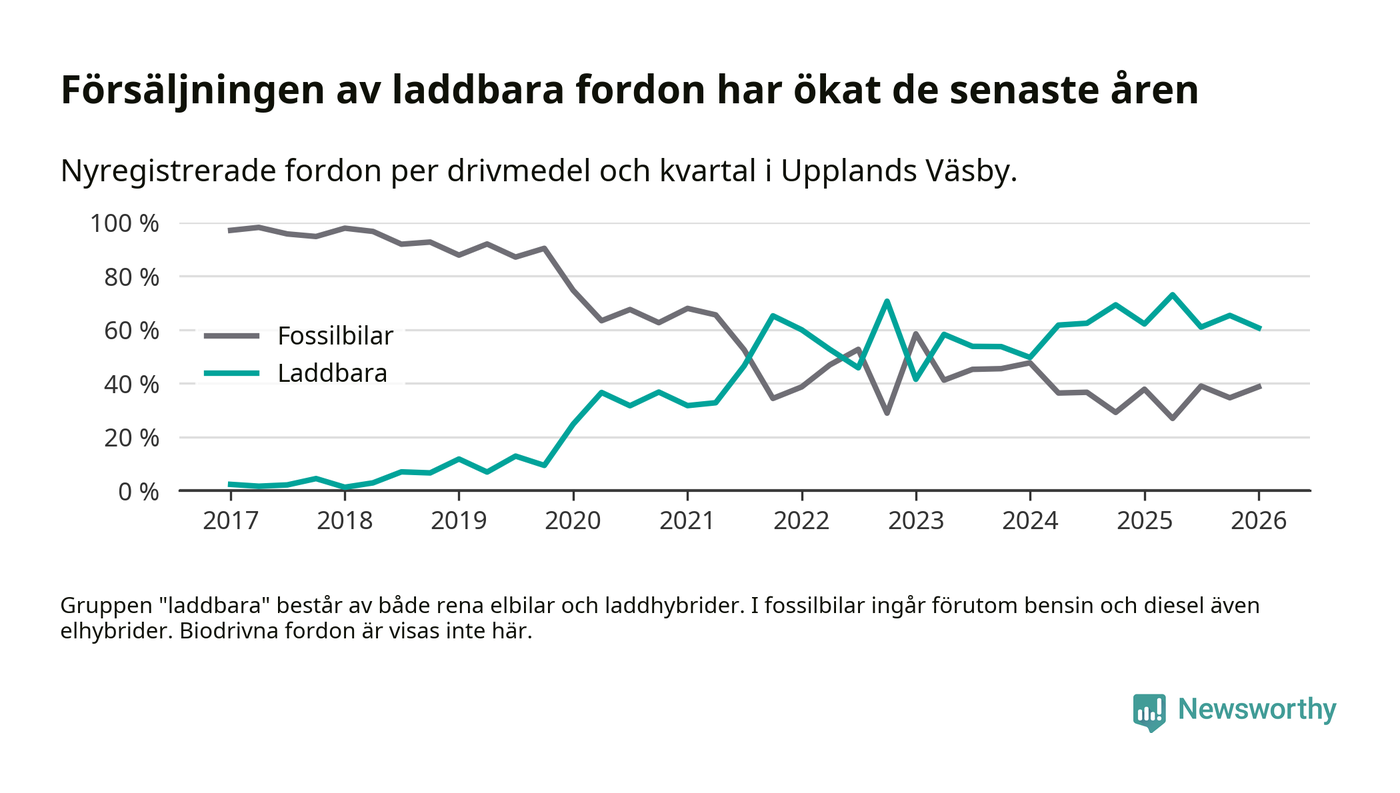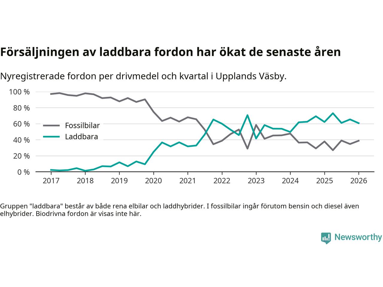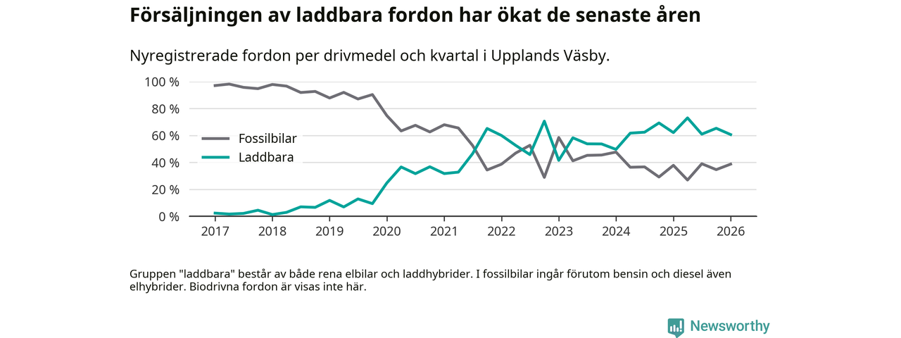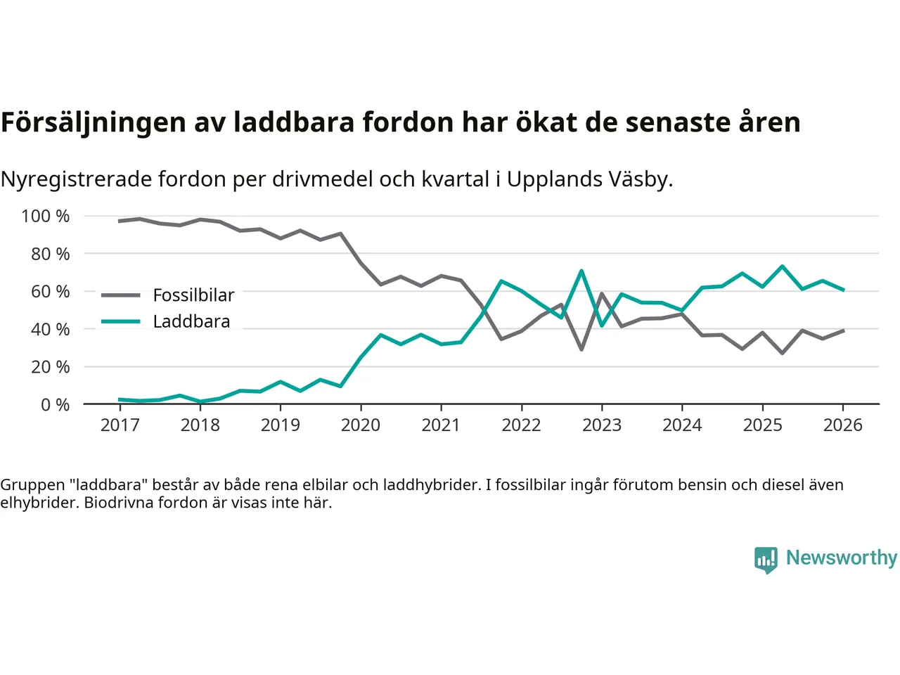 Under första kvartalet 2026 var 61 procent av alla nyregistrerade personbilar i Upplands Väsby laddbara (sammanlagt registrerades 173 nya bilar). Merparten av de laddbara bilarna var rena elbilar (41 procent av alla).
