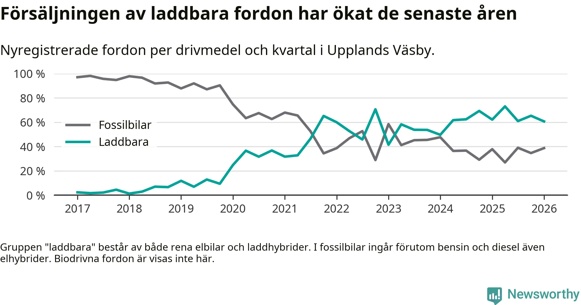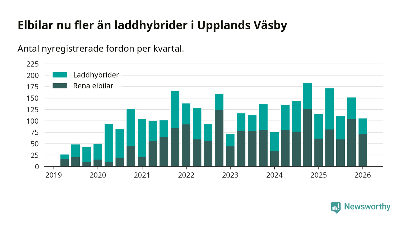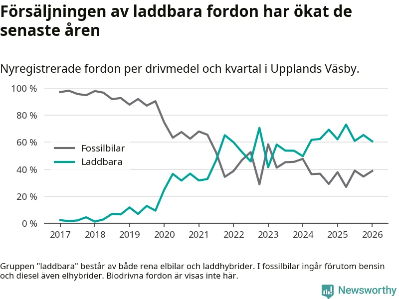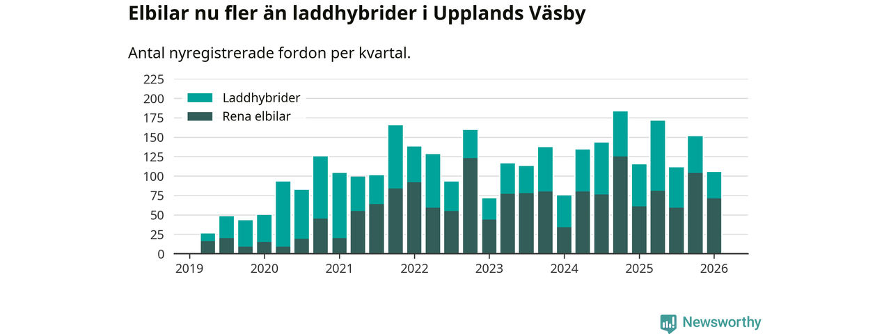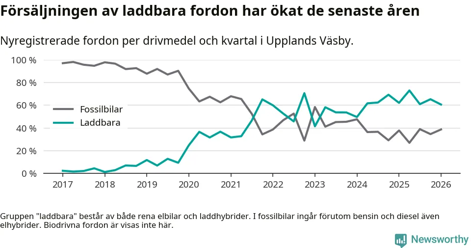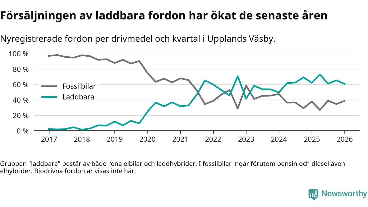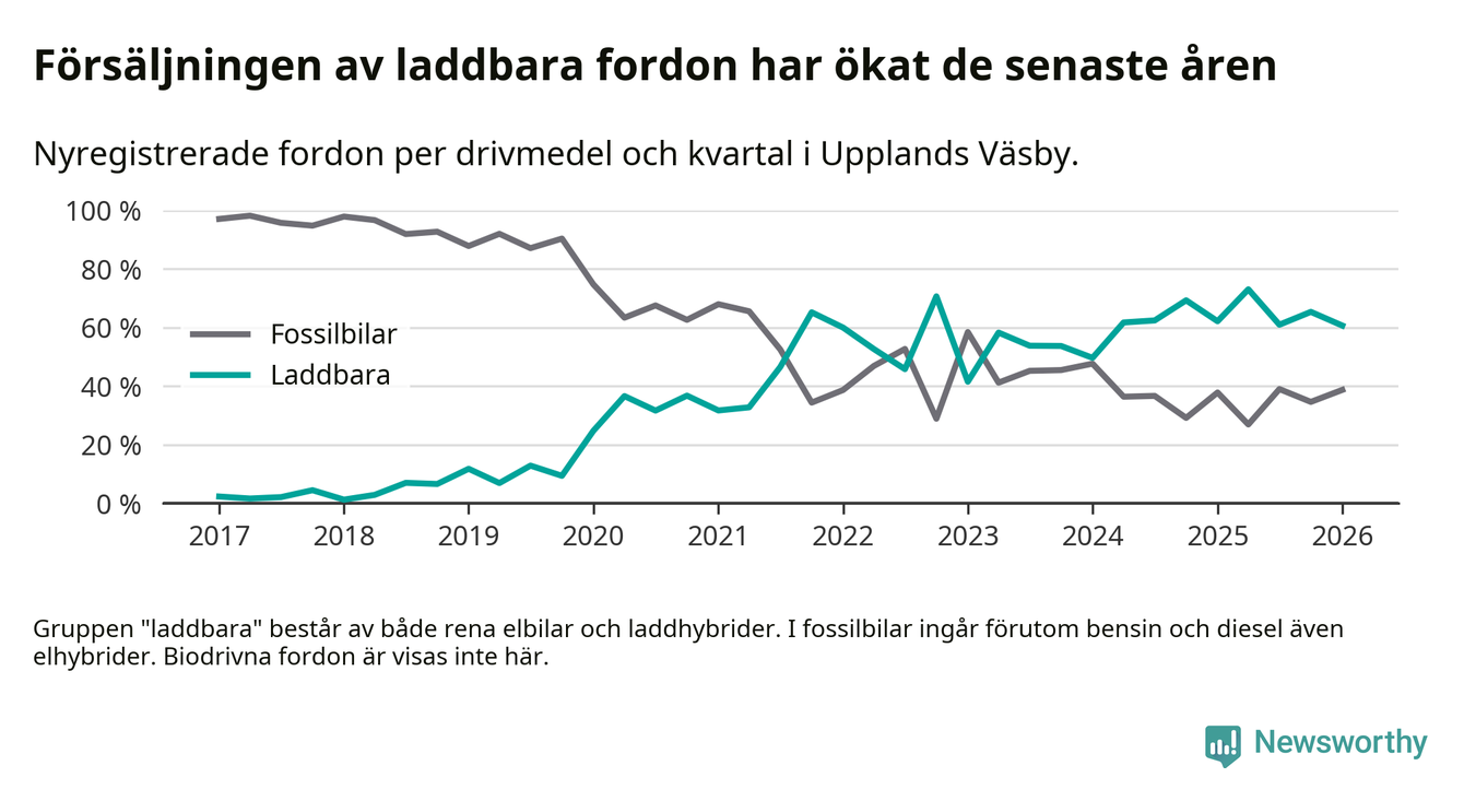 Under första kvartalet 2026 var 61 procent av alla nyregistrerade personbilar i Upplands Väsby laddbara (sammanlagt registrerades 173 nya bilar). Merparten av de laddbara bilarna var rena elbilar (41 procent av alla).