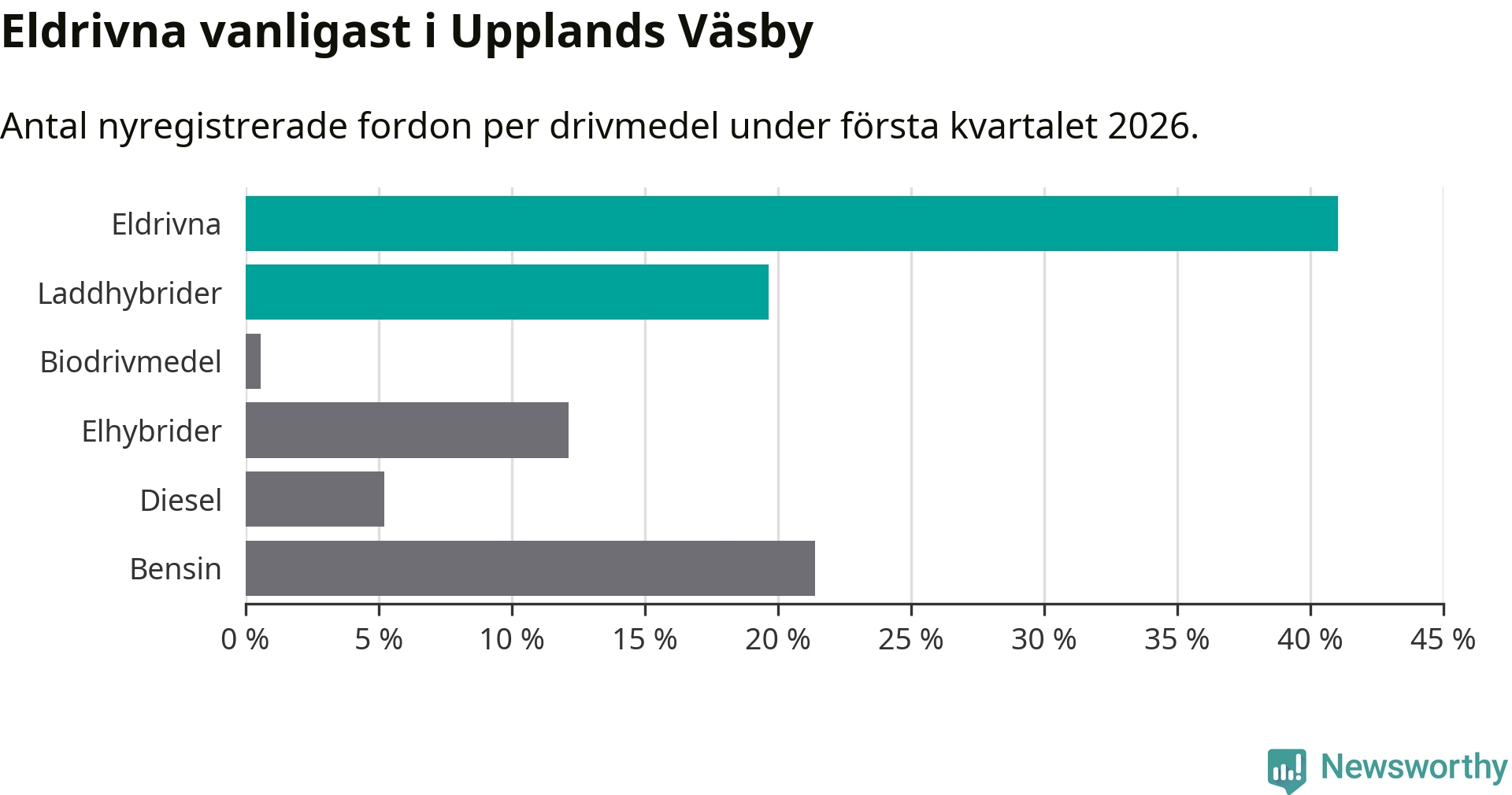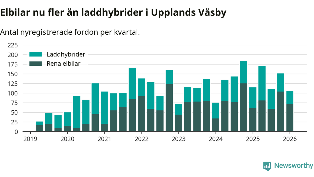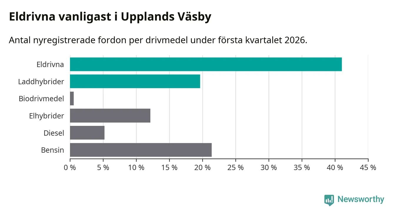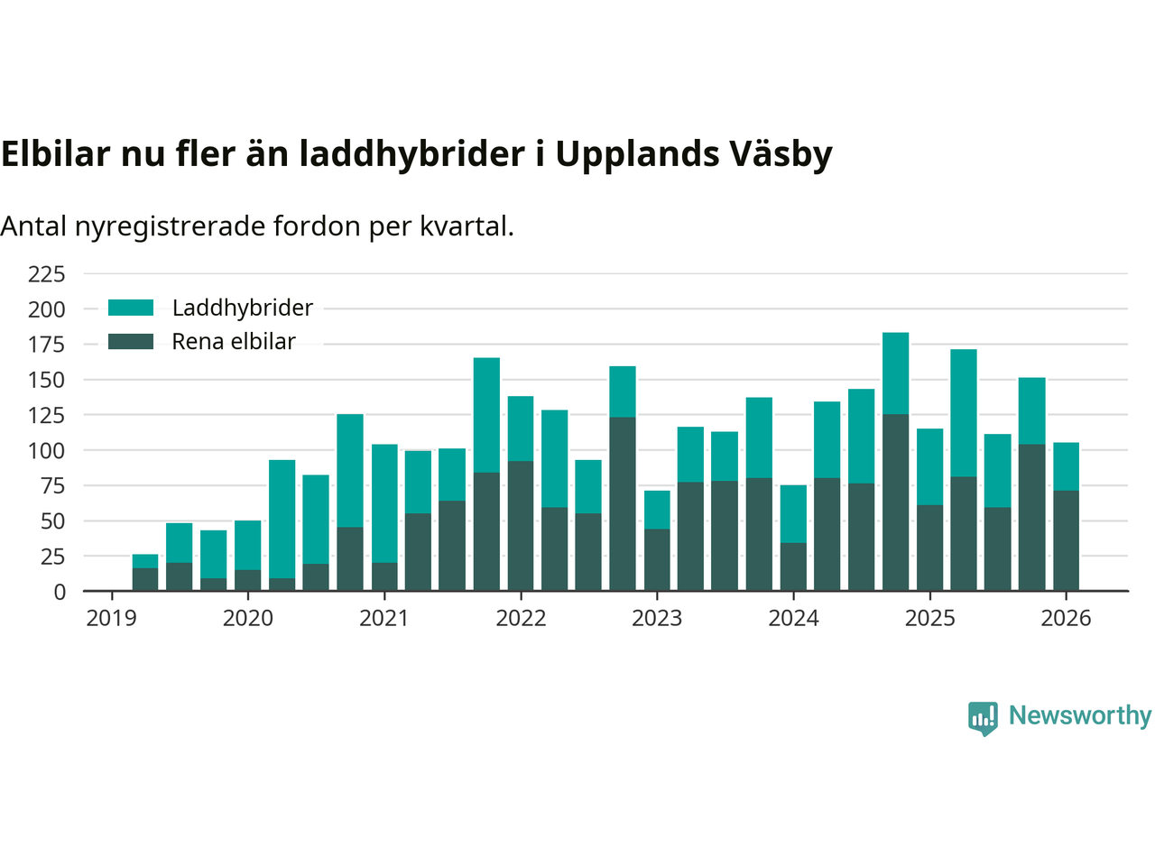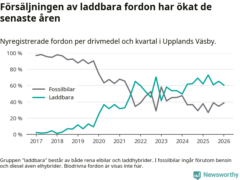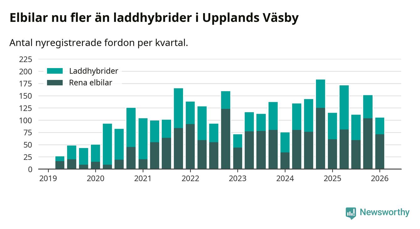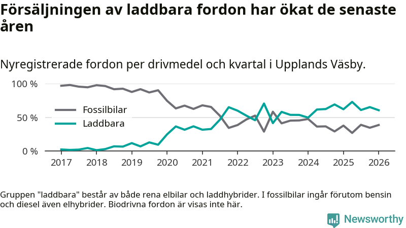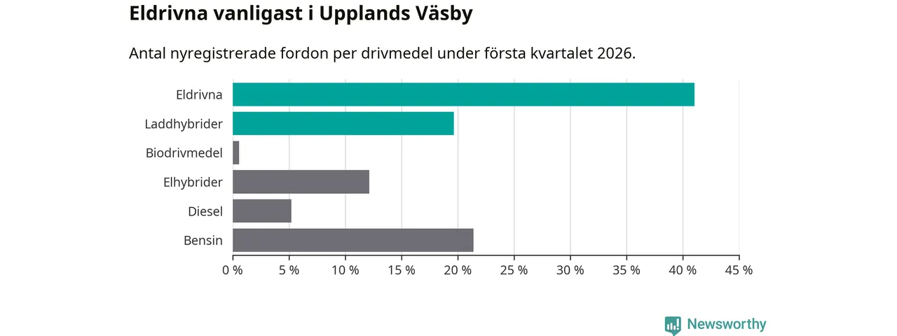 Under första kvartalet 2026 var 61 procent av alla nyregistrerade personbilar i Upplands Väsby laddbara (sammanlagt registrerades 173 nya bilar). Merparten av de laddbara bilarna var rena elbilar (41 procent av alla).