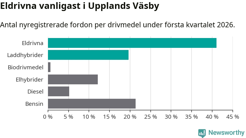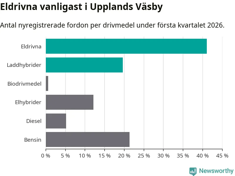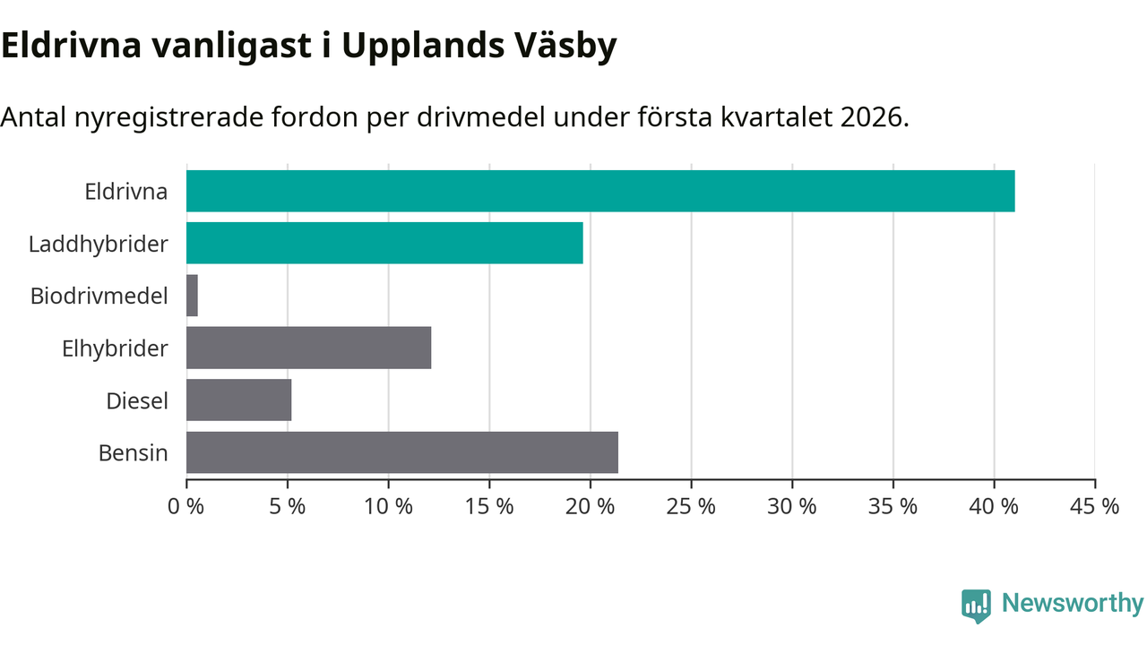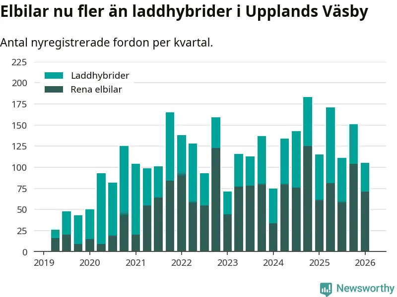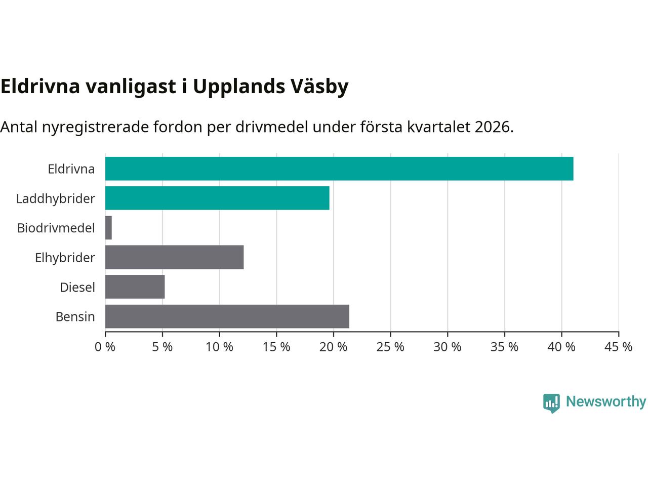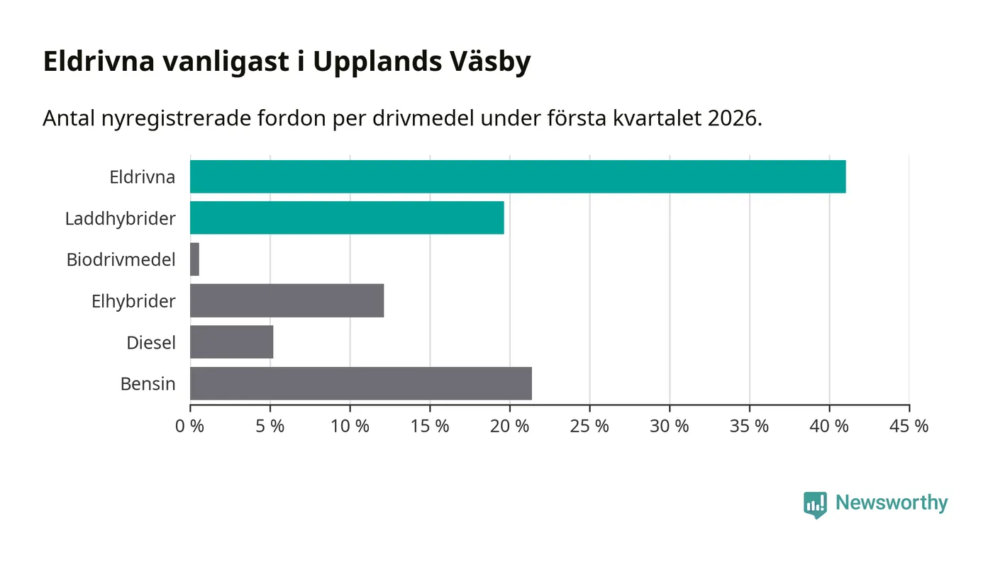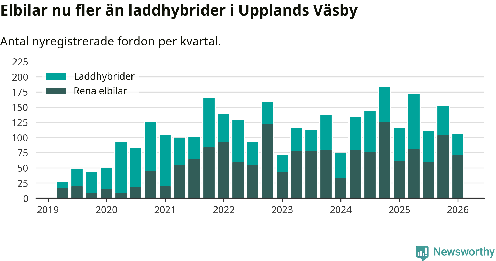 Under första kvartalet 2026 var 61 procent av alla nyregistrerade personbilar i Upplands Väsby laddbara (sammanlagt registrerades 173 nya bilar). Merparten av de laddbara bilarna var rena elbilar (41 procent av alla).