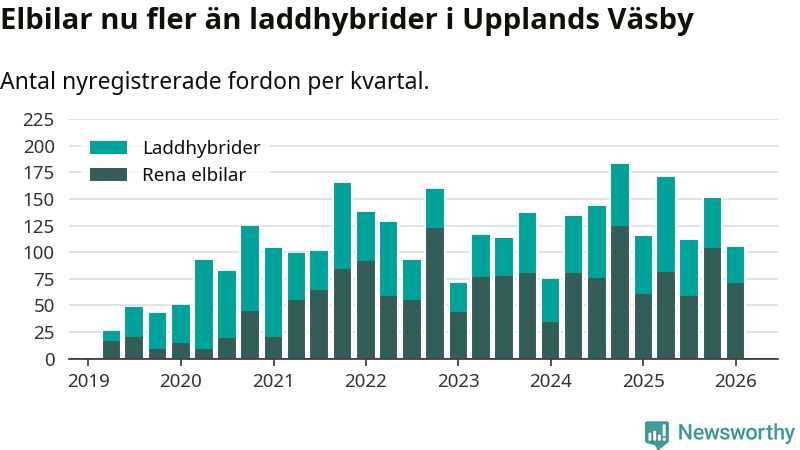 I Upplands Väsby minskade andelen laddbara bilar under första kvartalet jämfört med kvartalet innan (−4,7 procentenheter). Nyregistreringen peakade under andra kvartalet 2025 då 73 procent av de nya bilarna var laddbara.