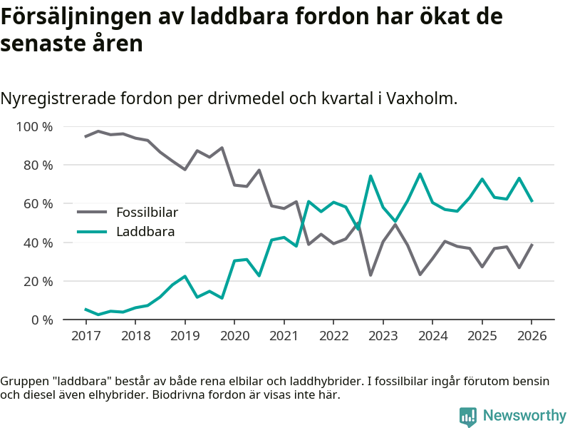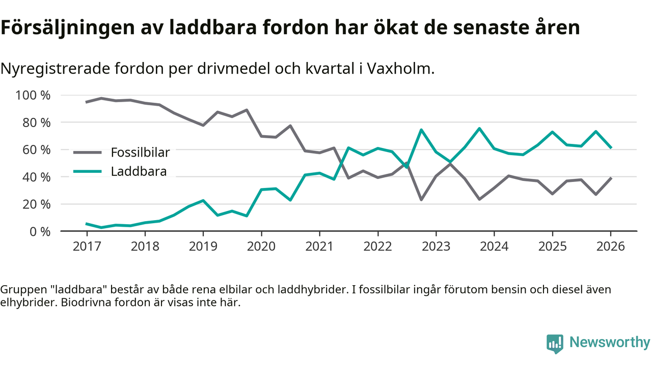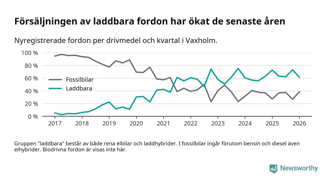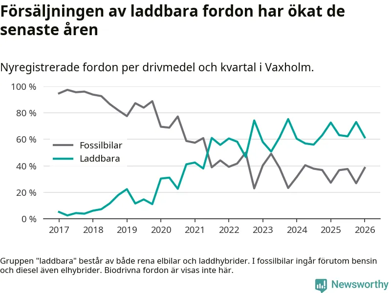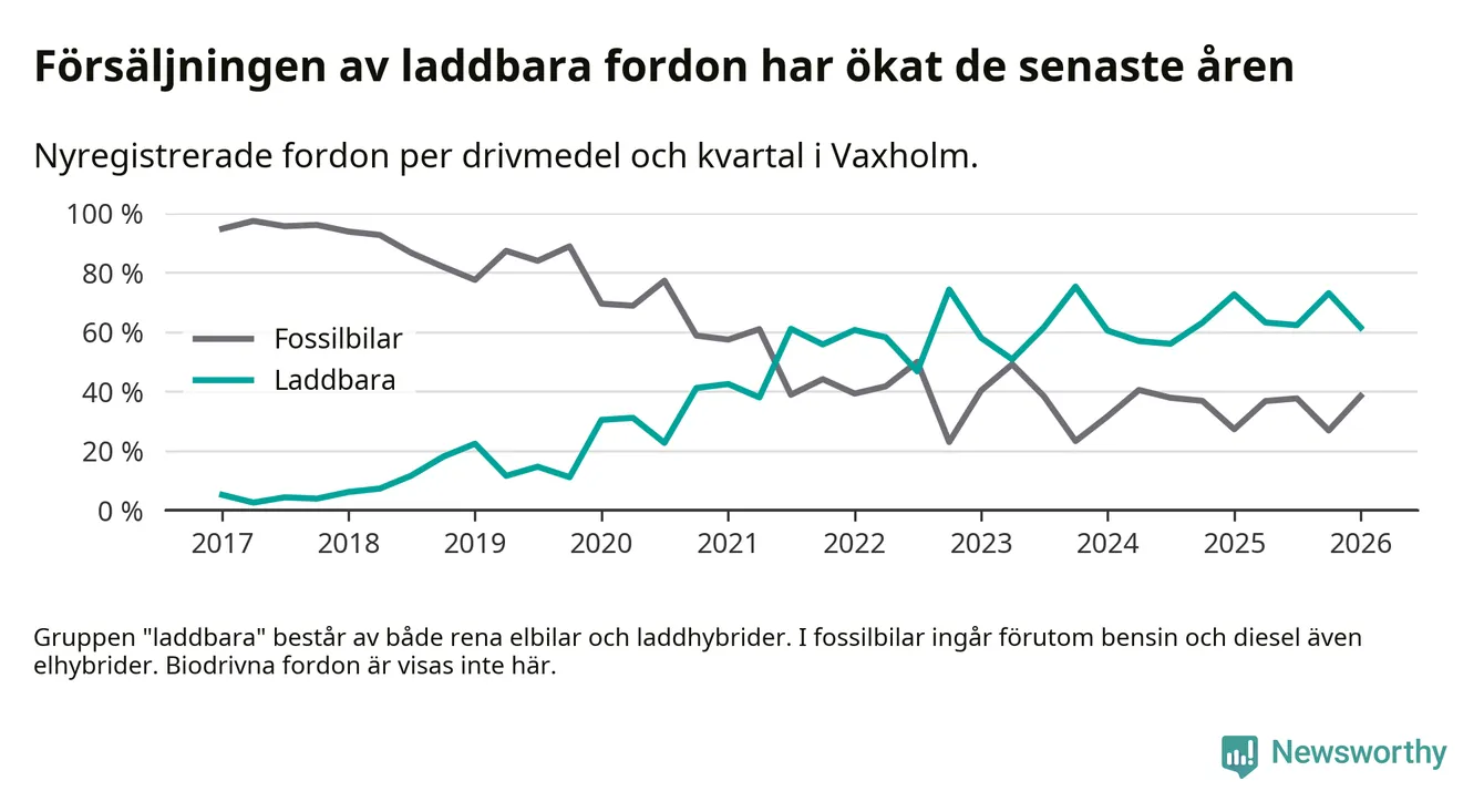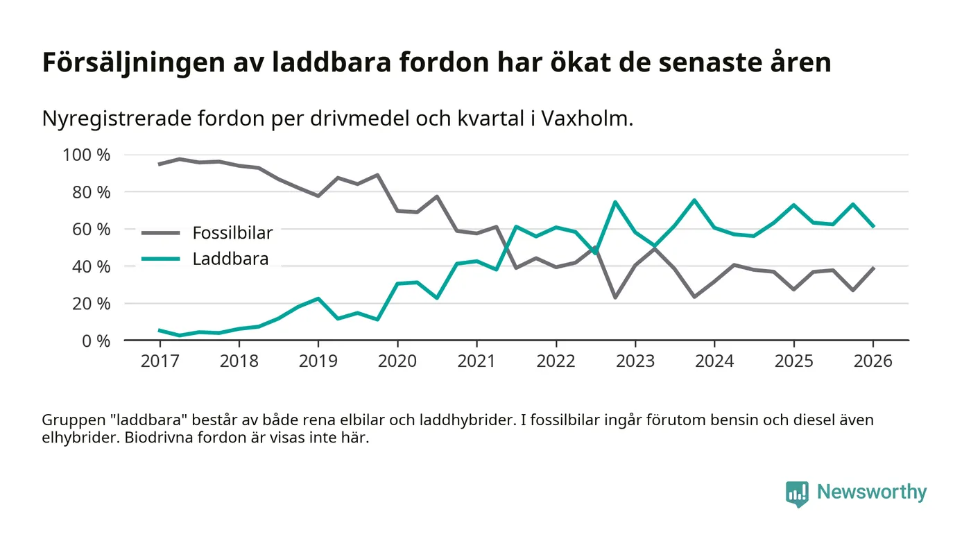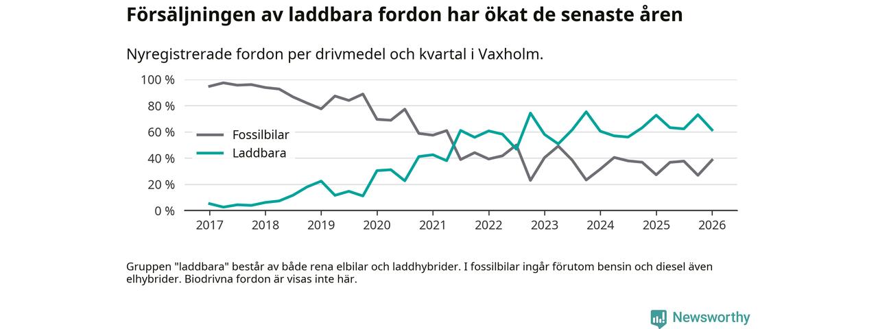 Under första kvartalet 2026 var 62 procent av alla nyregistrerade personbilar i Vaxholm laddbara (sammanlagt registrerades 52 nya bilar). Merparten av de laddbara bilarna var rena elbilar (40 procent av alla).