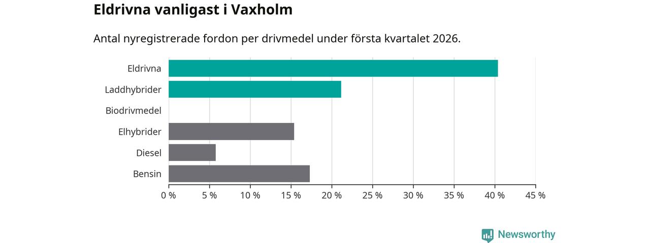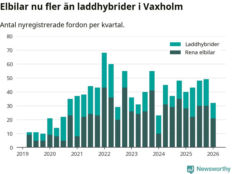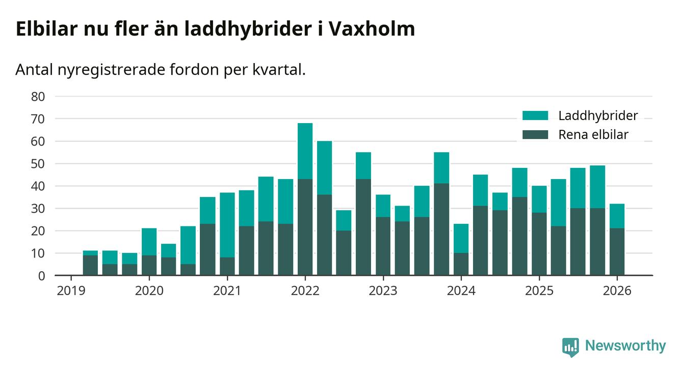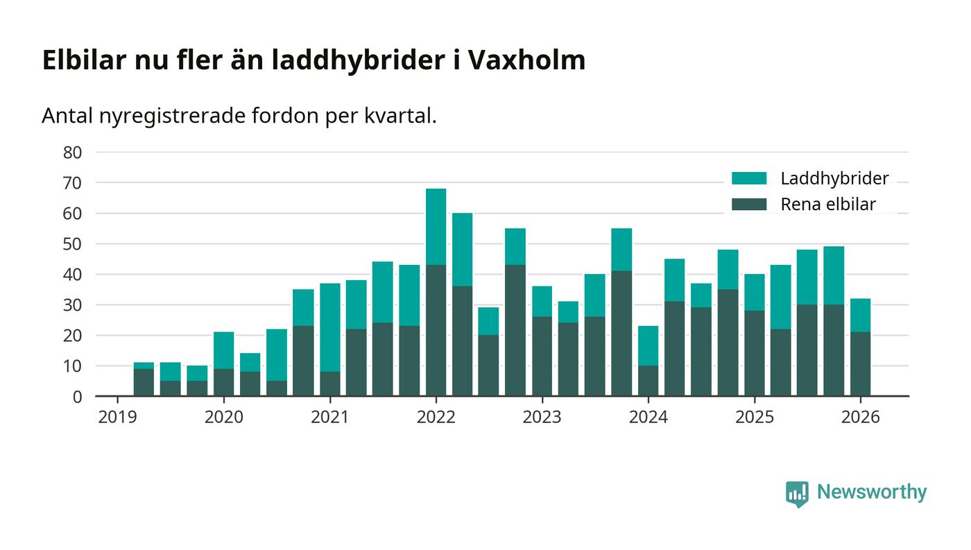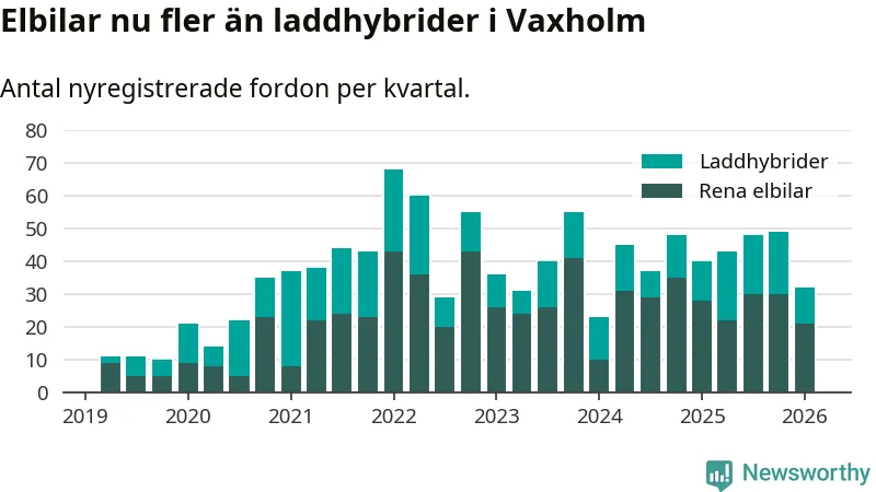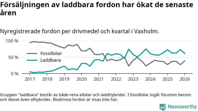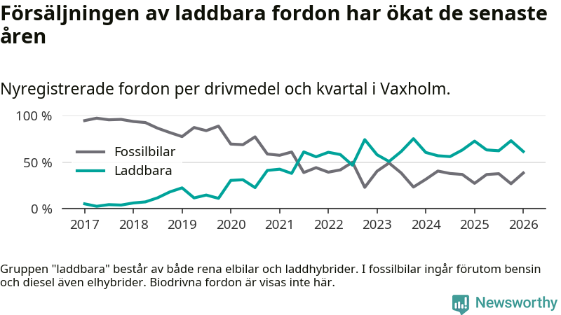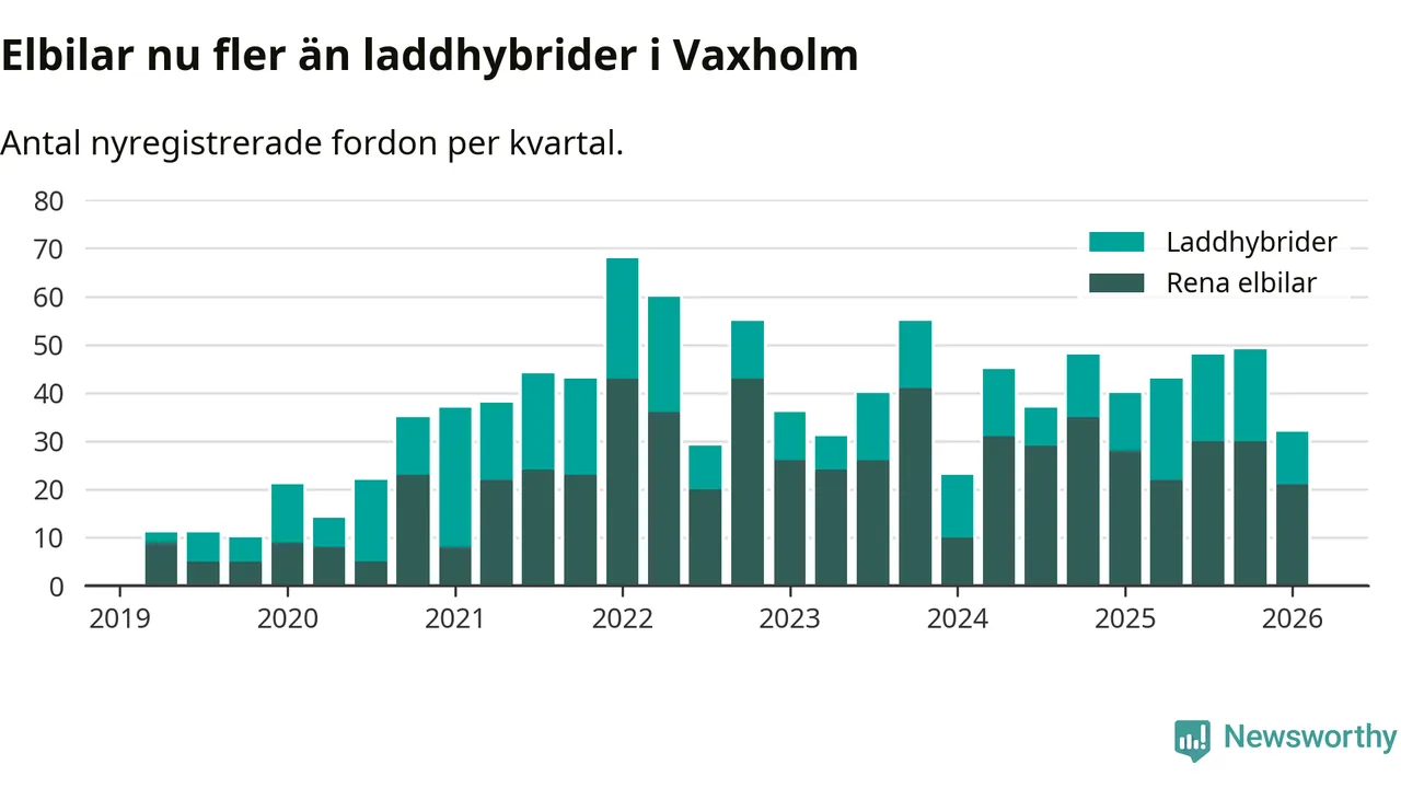 Under första kvartalet 2026 var 62 procent av alla nyregistrerade personbilar i Vaxholm laddbara (sammanlagt registrerades 52 nya bilar). Merparten av de laddbara bilarna var rena elbilar (40 procent av alla).