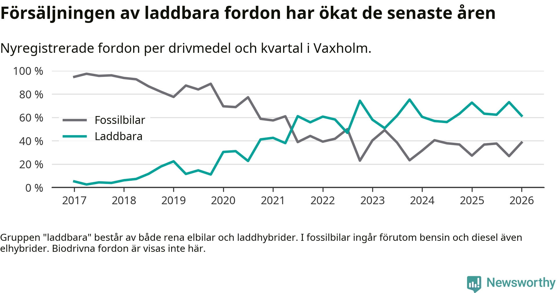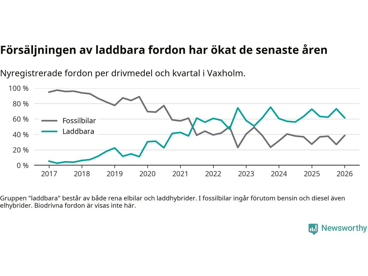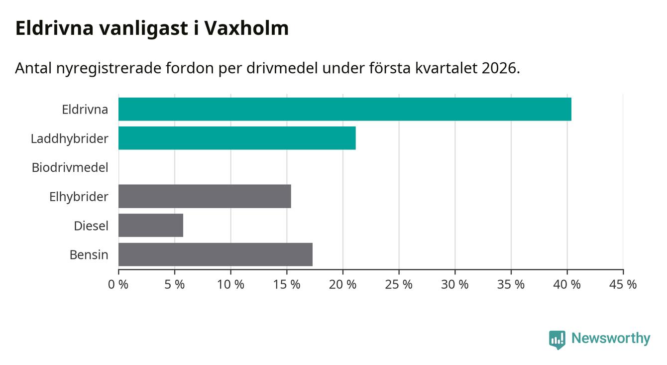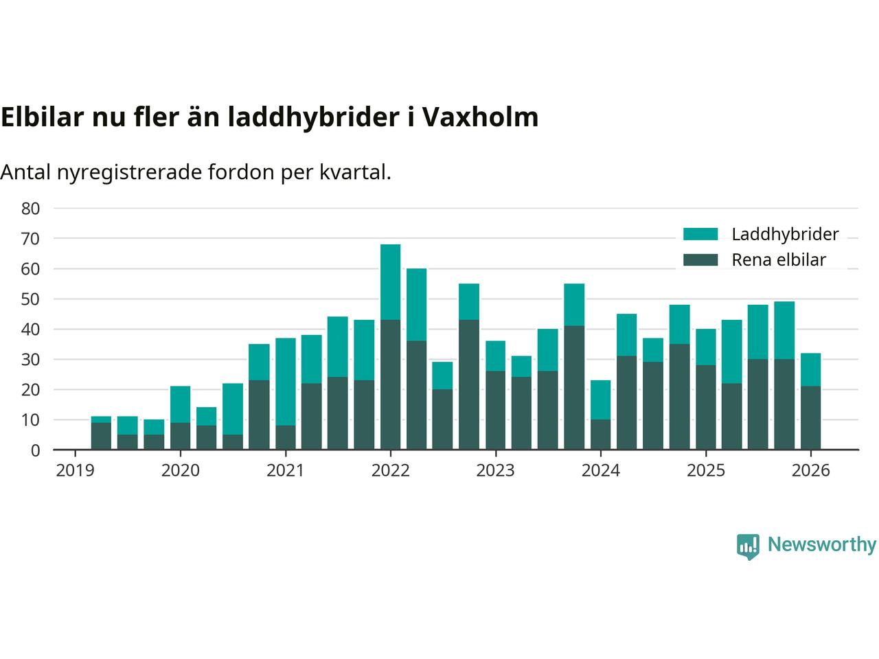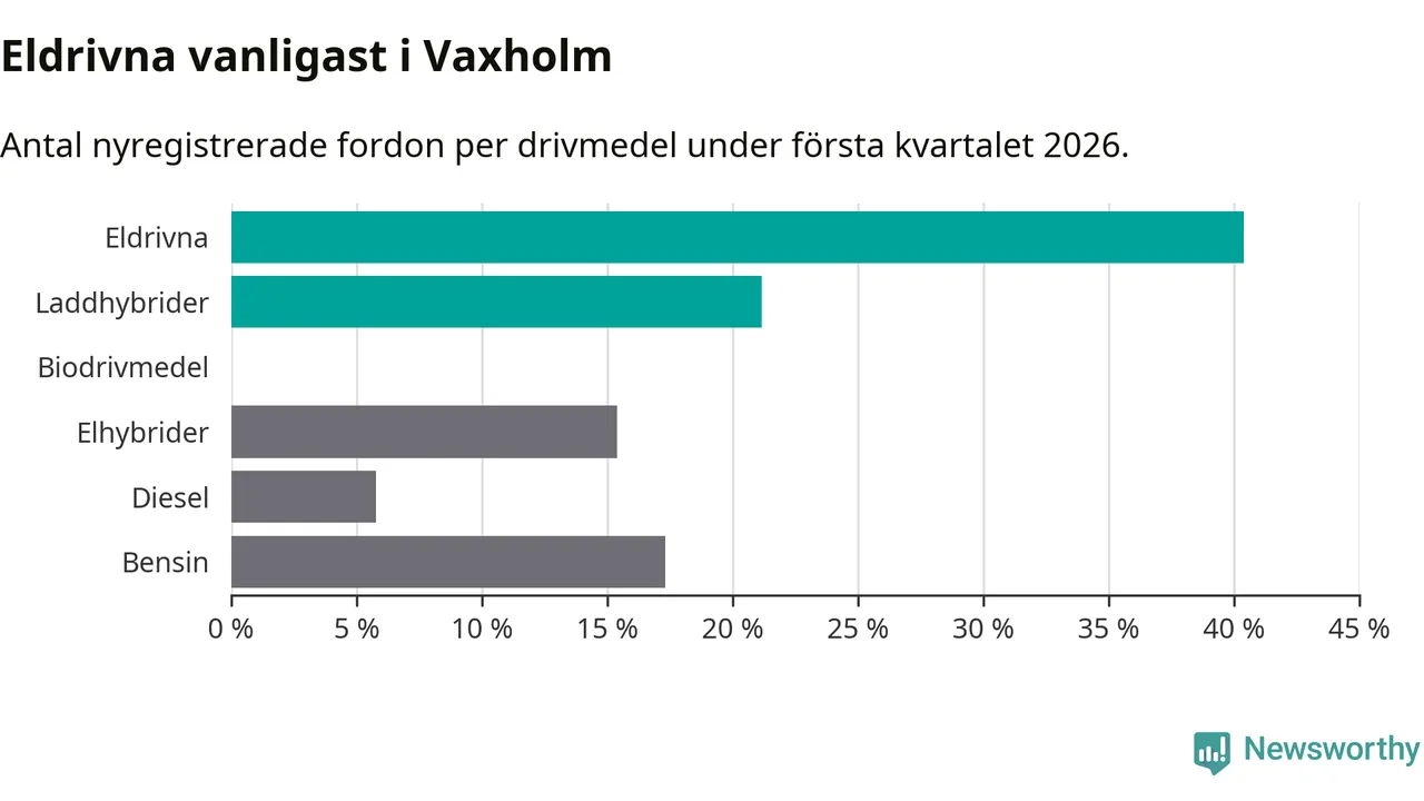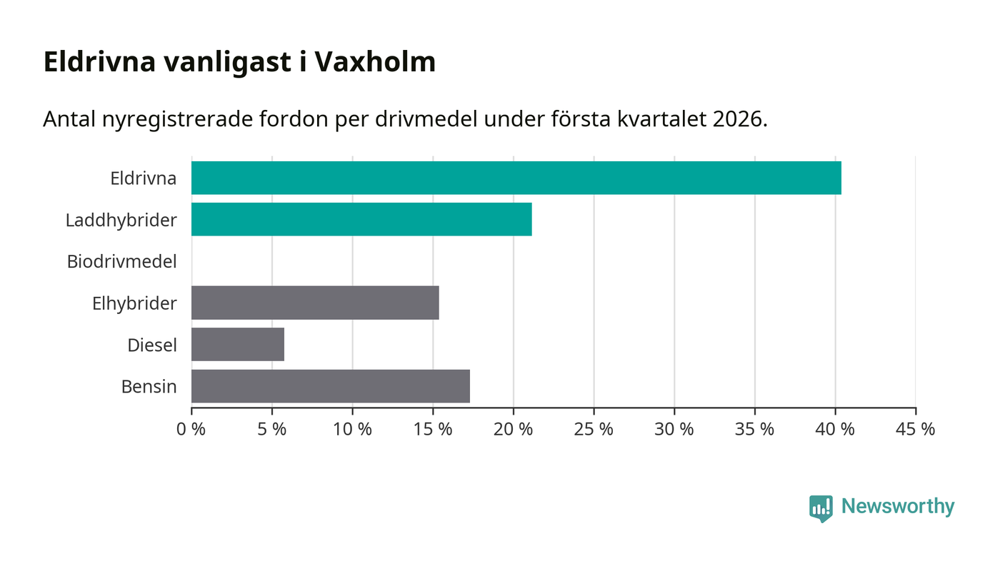 Under första kvartalet 2026 var 62 procent av alla nyregistrerade personbilar i Vaxholm laddbara (sammanlagt registrerades 52 nya bilar). Merparten av de laddbara bilarna var rena elbilar (40 procent av alla).