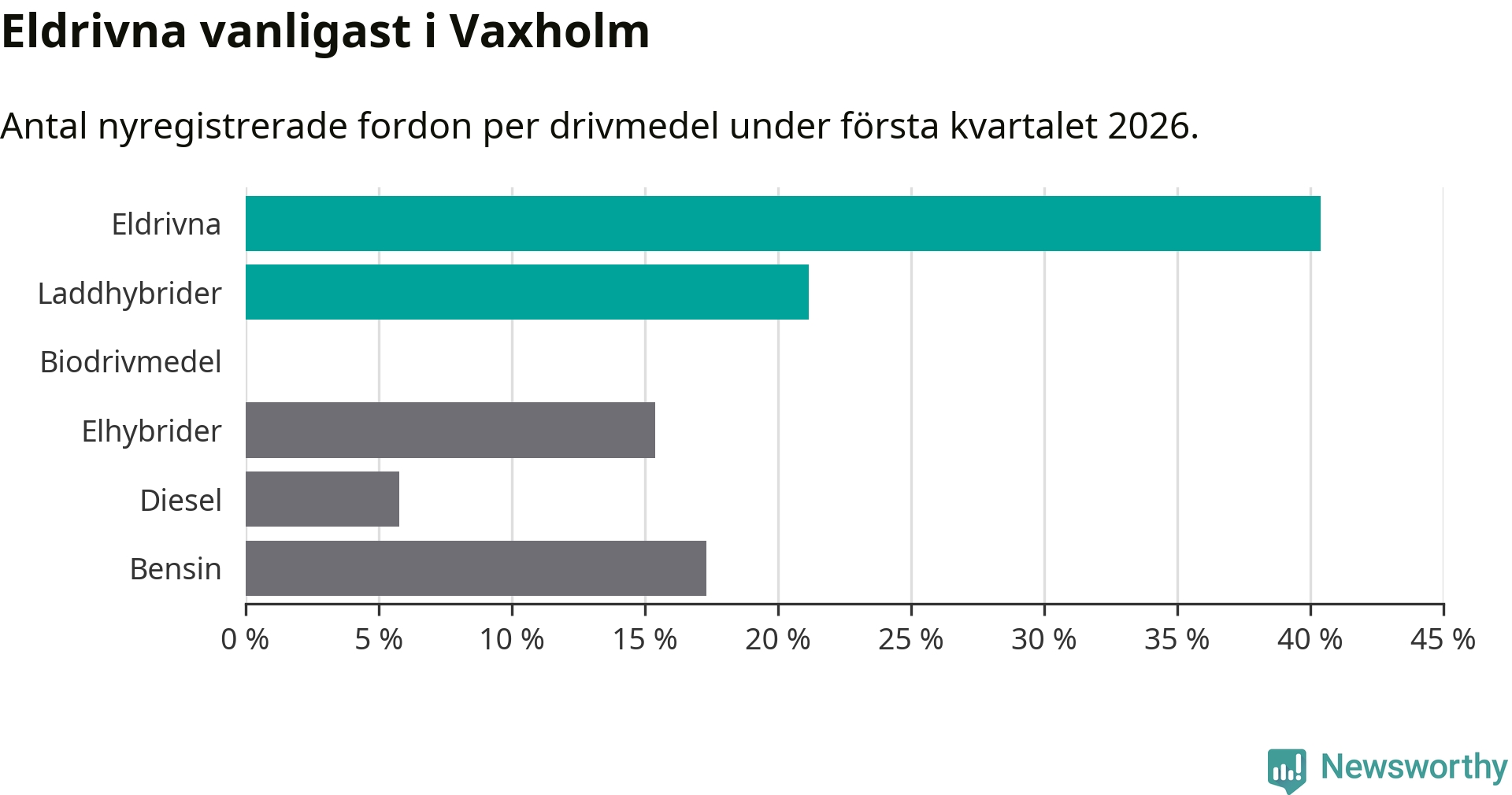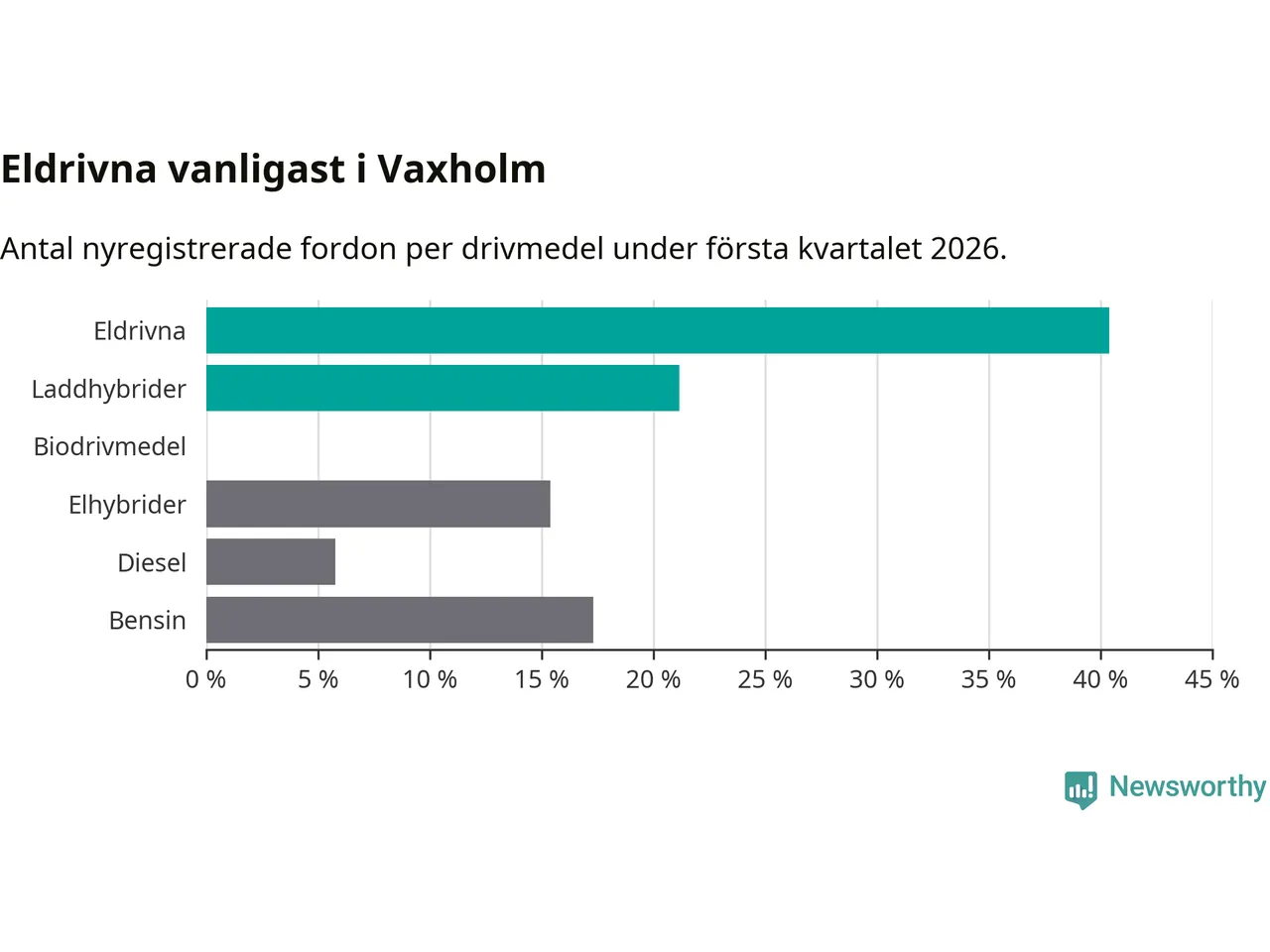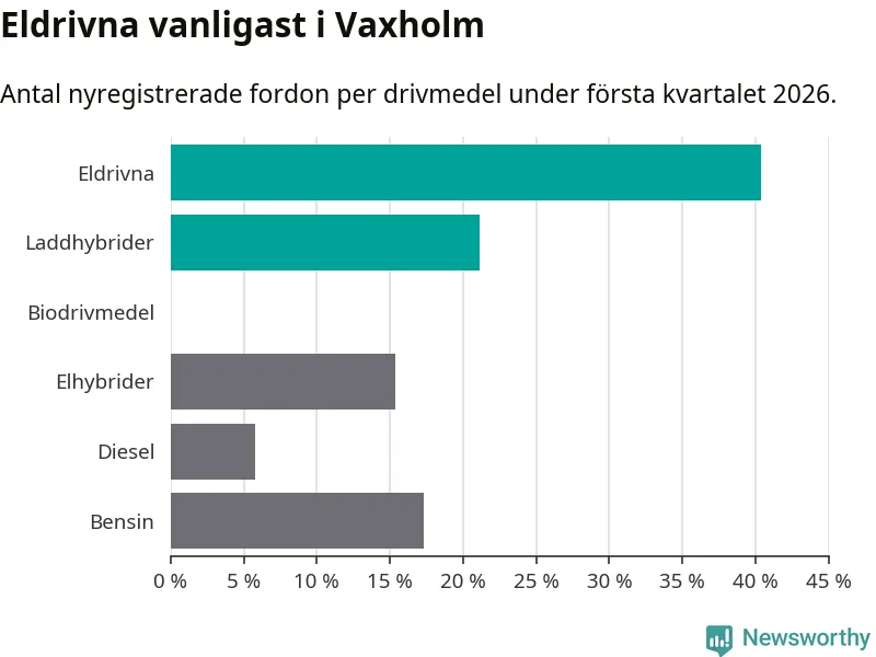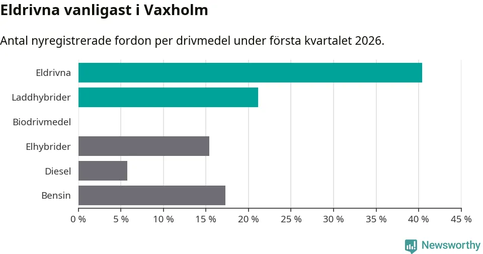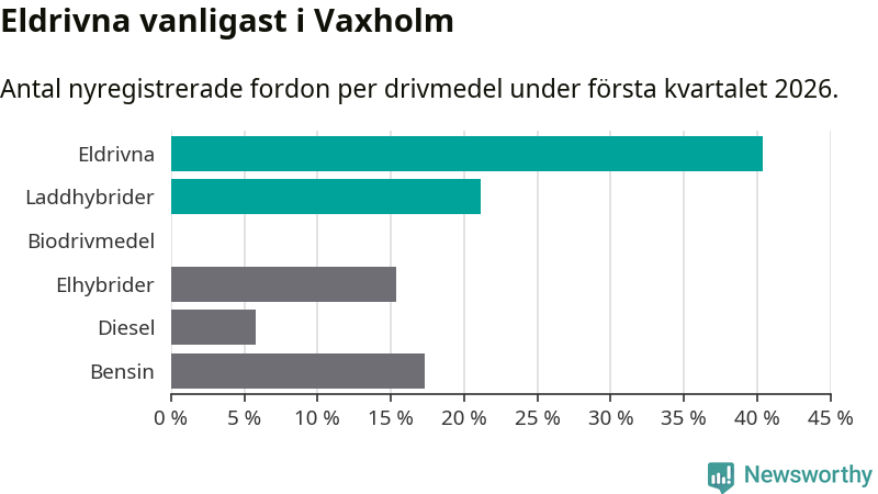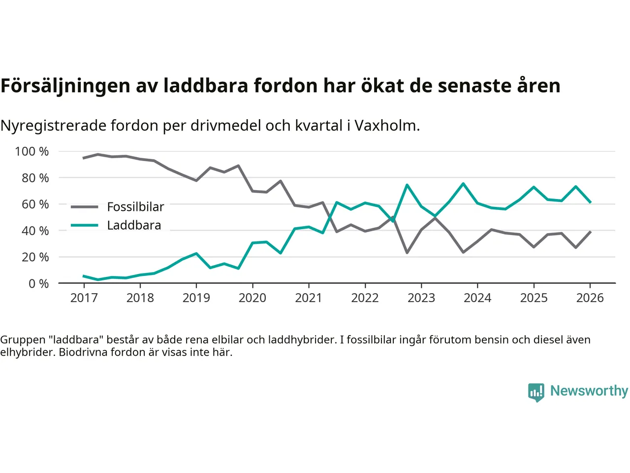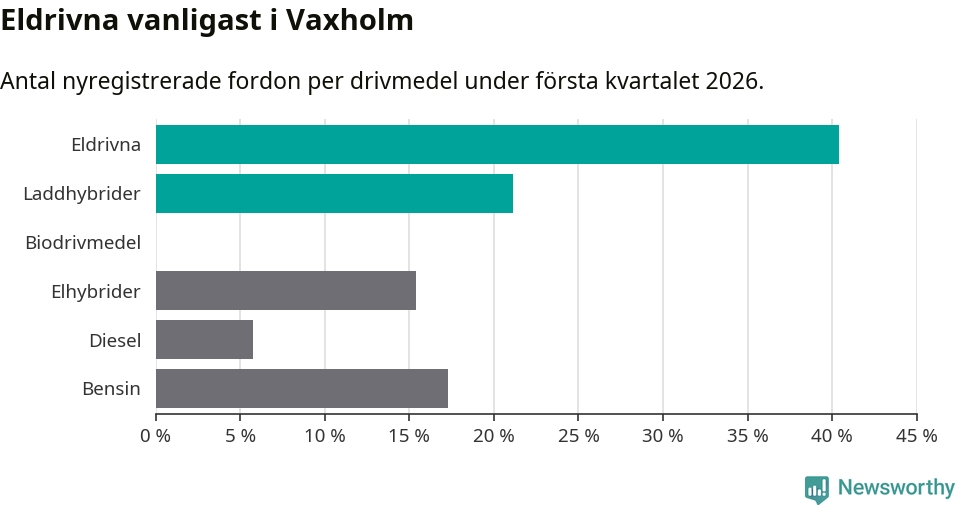 Under första kvartalet 2026 var 62 procent av alla nyregistrerade personbilar i Vaxholm laddbara (sammanlagt registrerades 52 nya bilar). Merparten av de laddbara bilarna var rena elbilar (40 procent av alla).