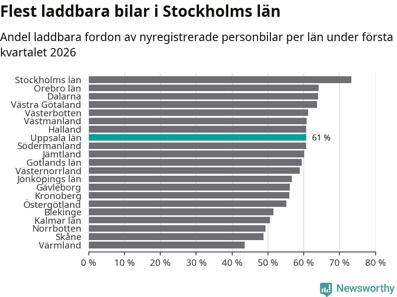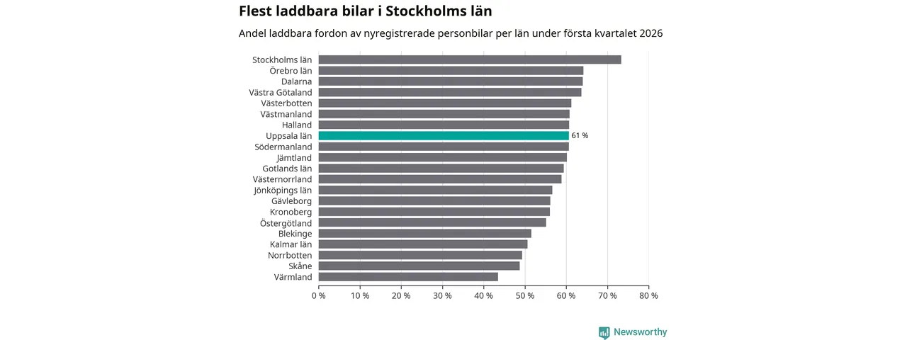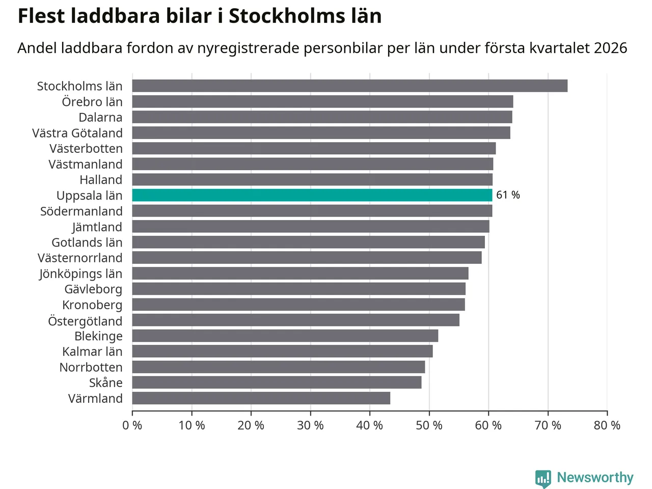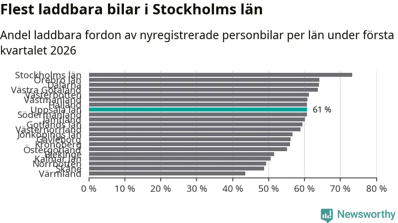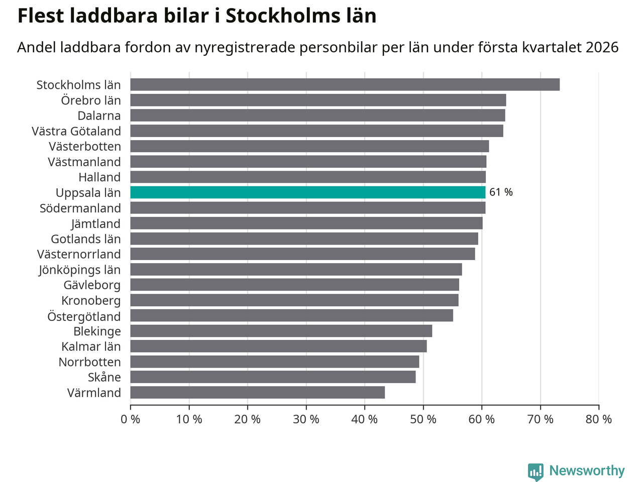 I hela landet var 63 procent av alla nya bilar laddbara under första kvartalet. Det är något färre än föregående kvartal (−1,4 procentenheter). I Uppsala län var 61 procent av de nya bilarna laddbara, vilket är fler än föregående kvartal (+5,8 procentenheter).
