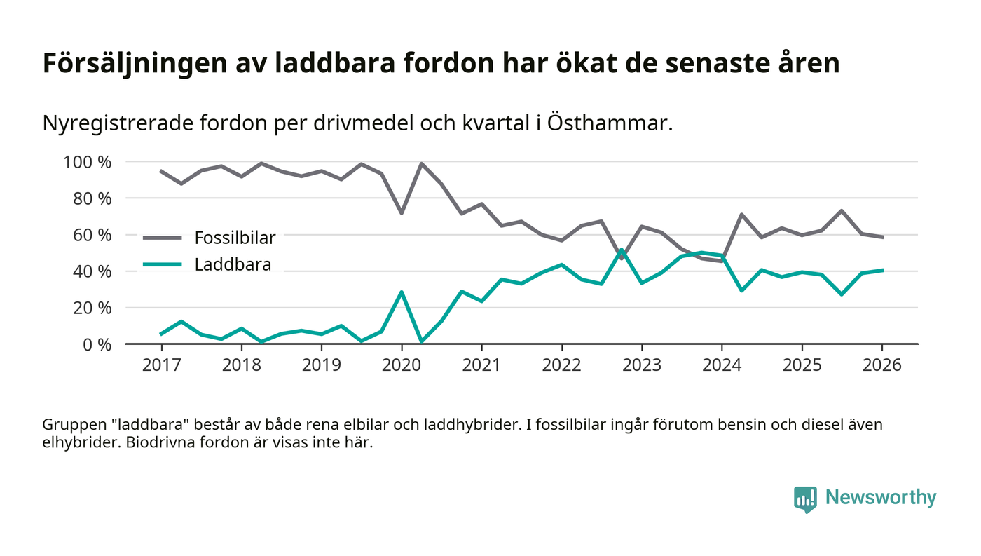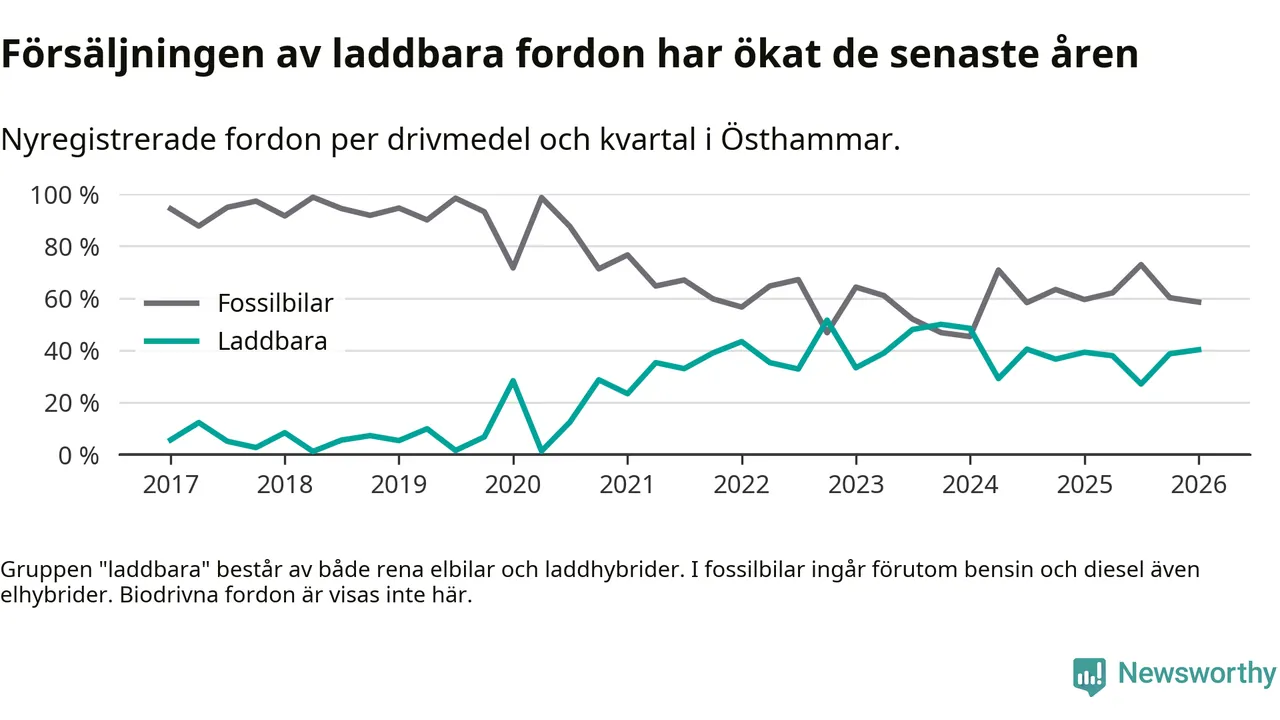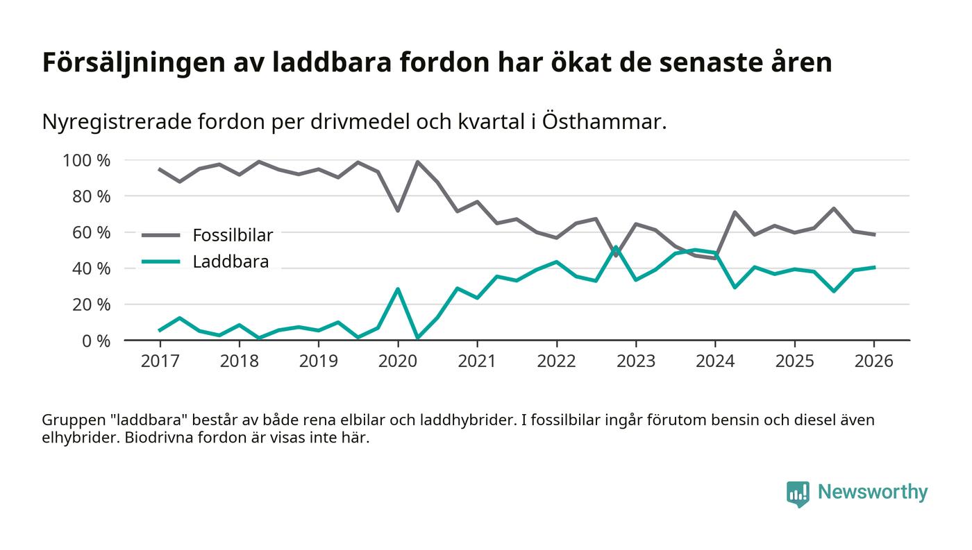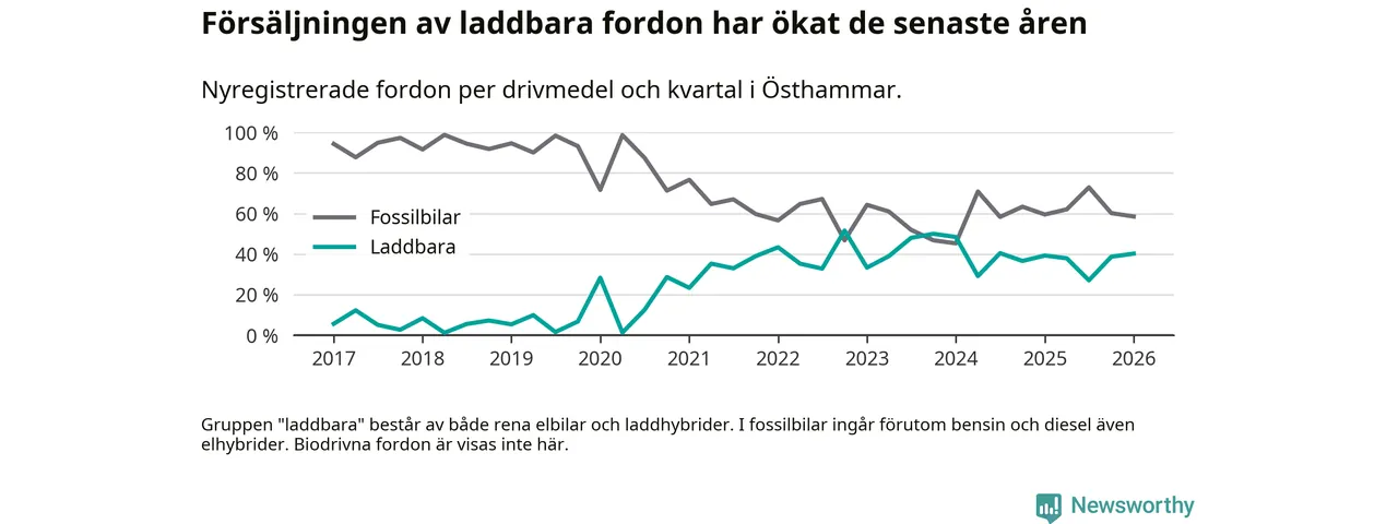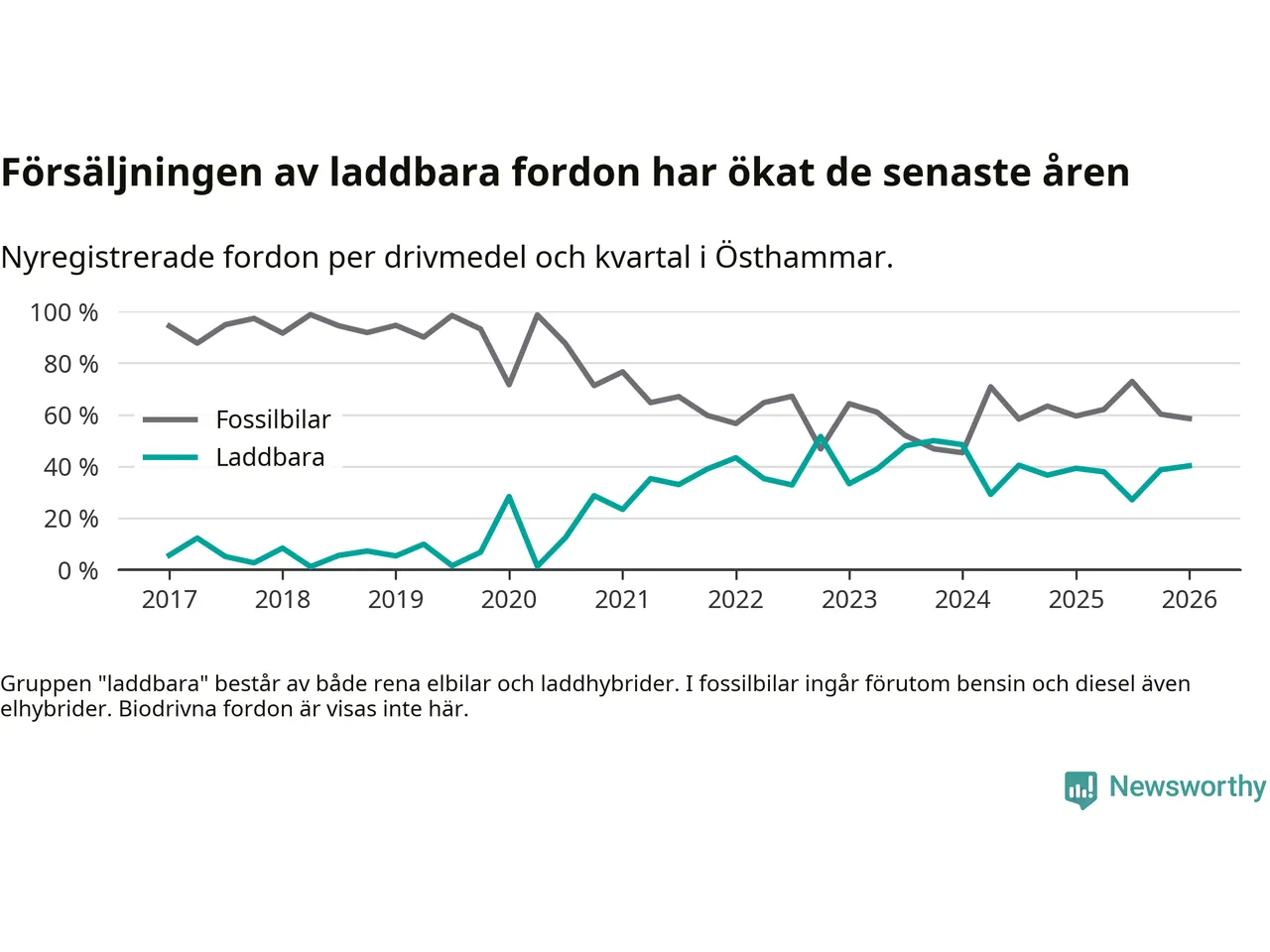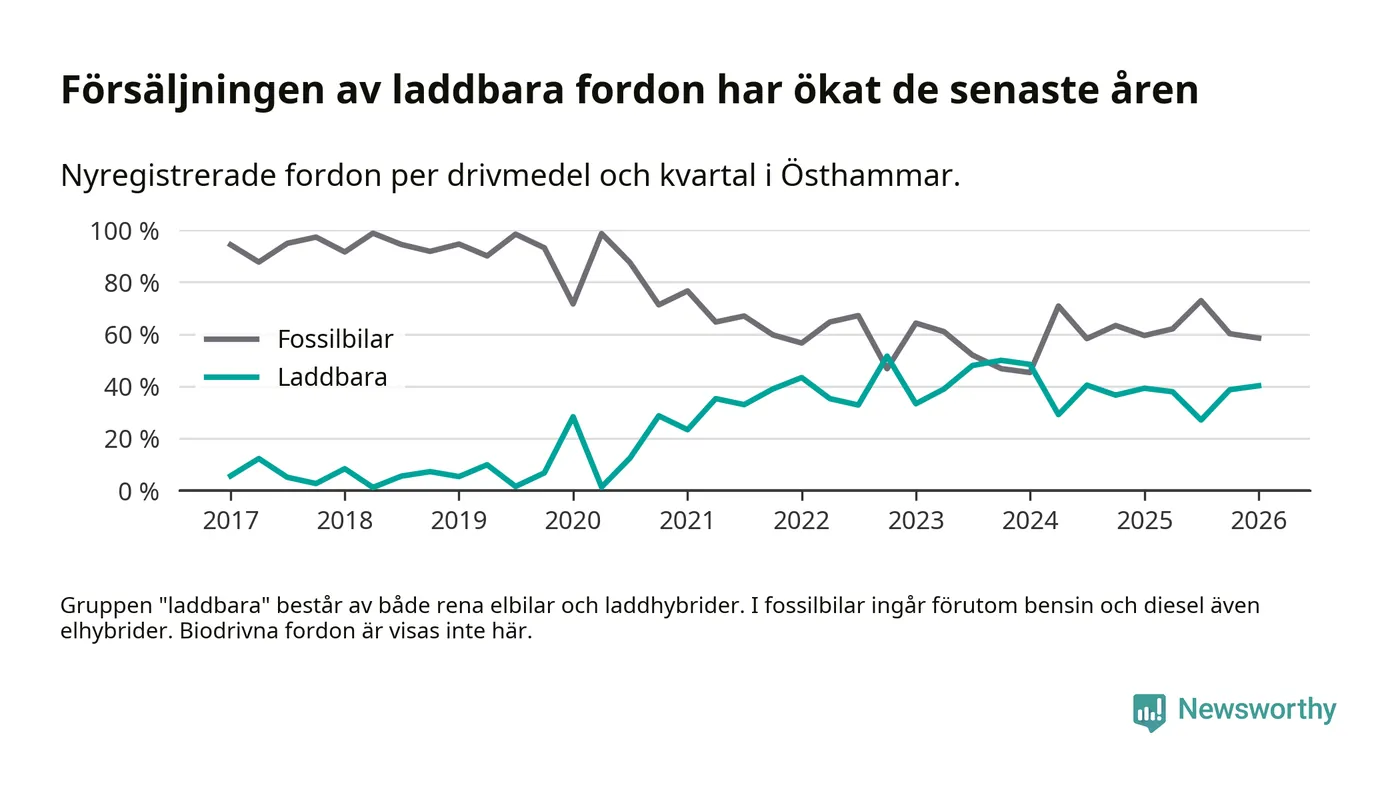 Under första kvartalet 2026 var 40 procent av alla nyregistrerade personbilar i Östhammar laddbara (sammanlagt registrerades 82 nya bilar). Merparten av de laddbara bilarna var rena elbilar (24 procent av alla).