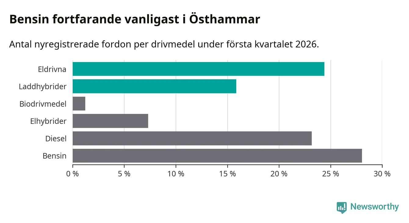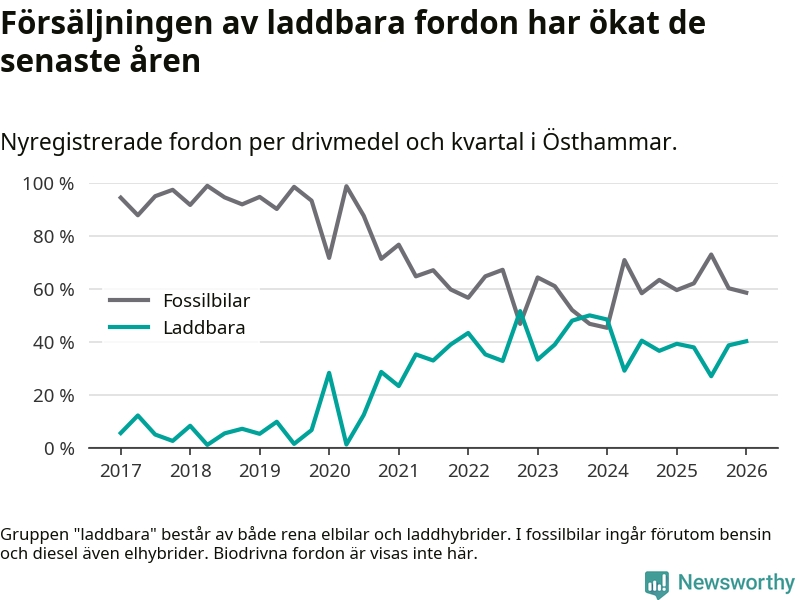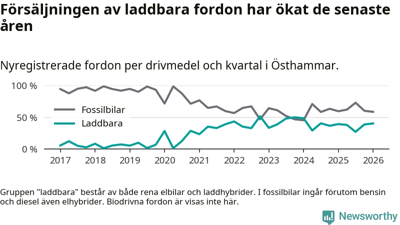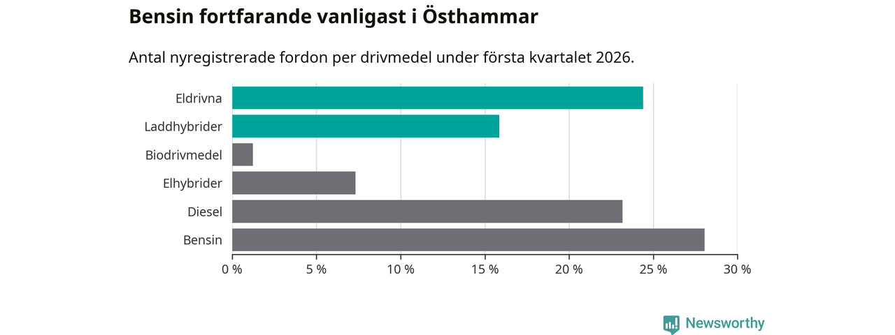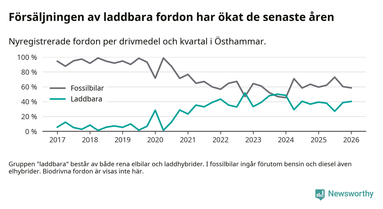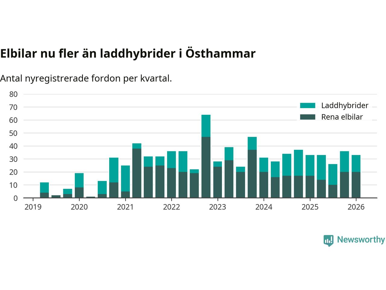 Under första kvartalet 2026 var 40 procent av alla nyregistrerade personbilar i Östhammar laddbara (sammanlagt registrerades 82 nya bilar). Merparten av de laddbara bilarna var rena elbilar (24 procent av alla).